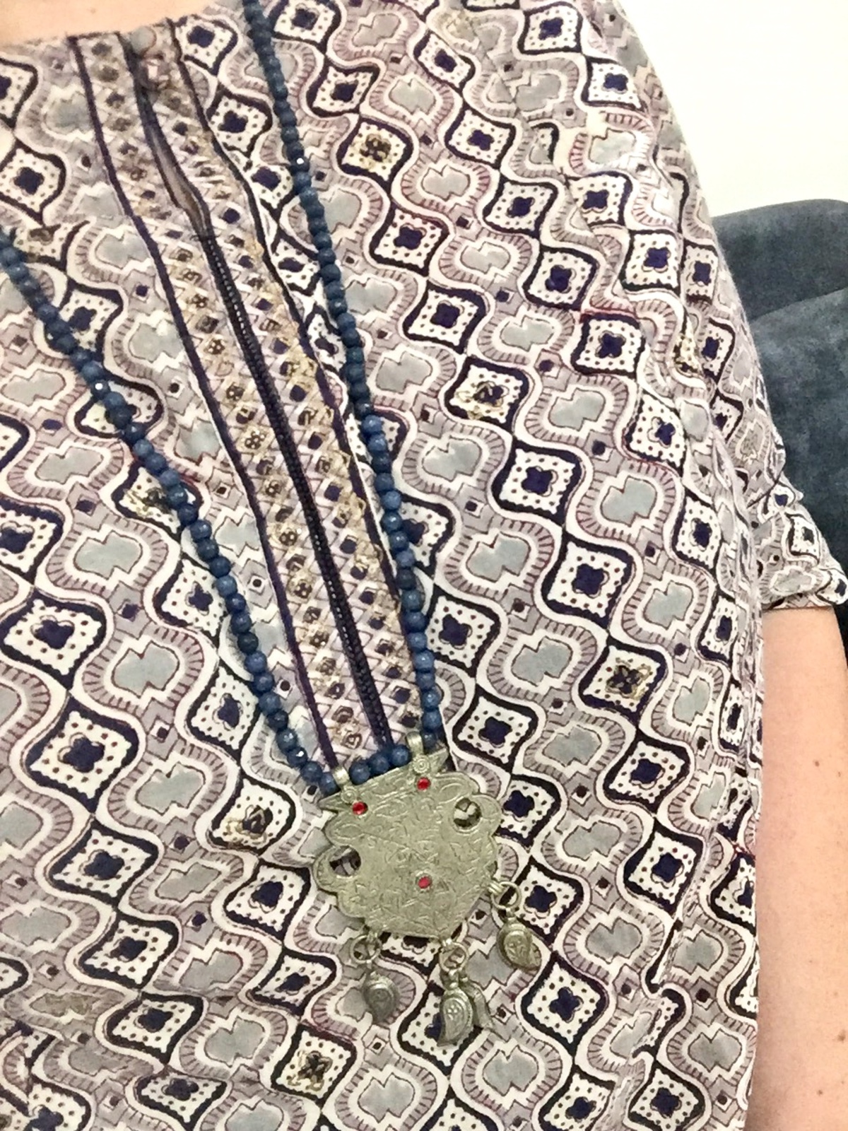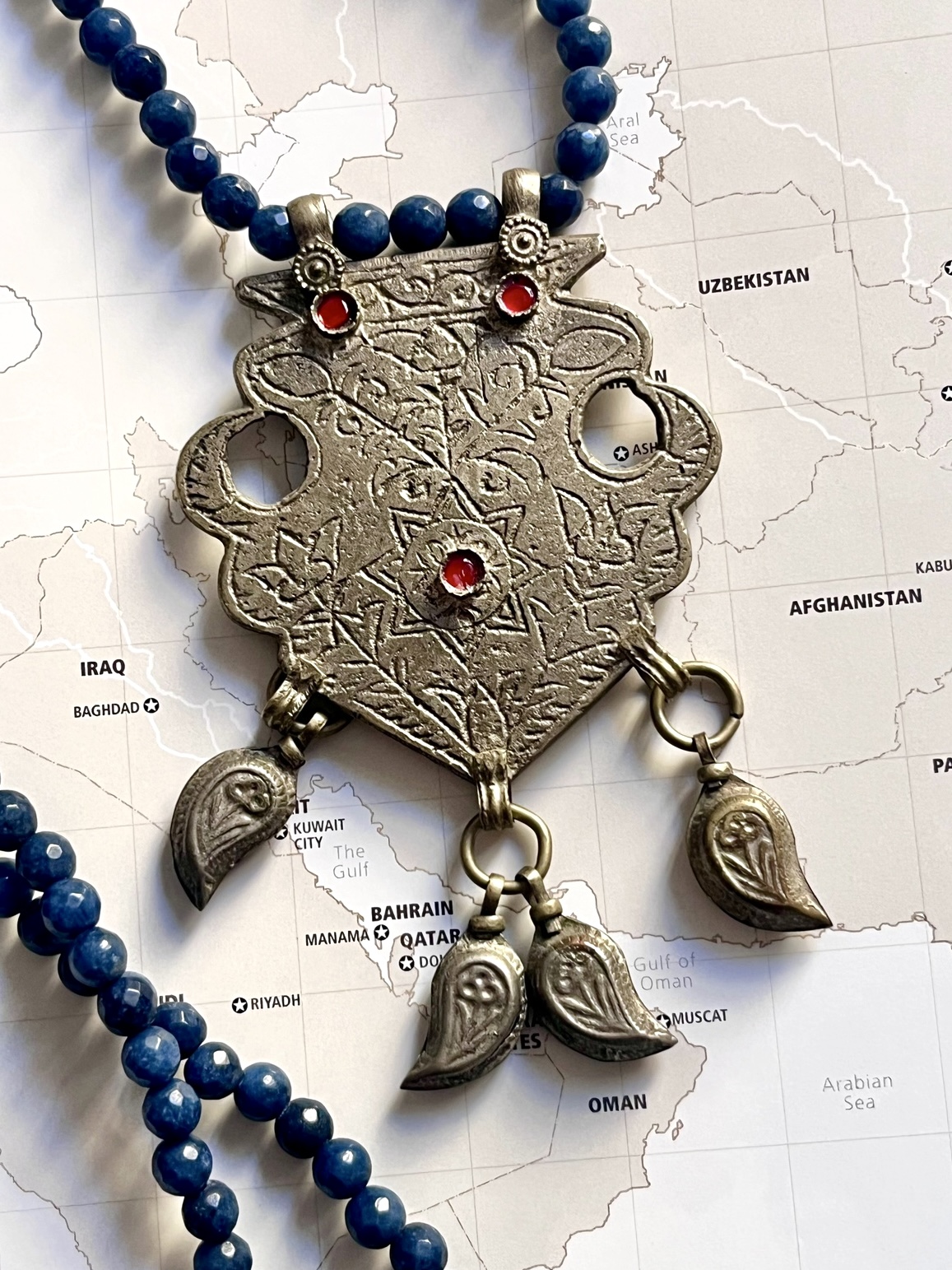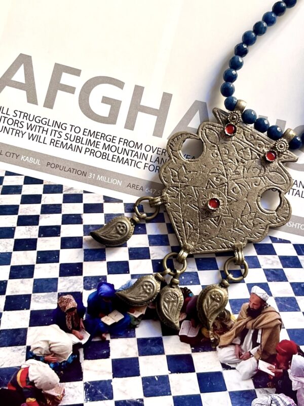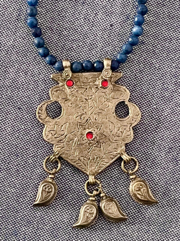 The combination of blue agate and the vintage Kuchi pendant makes this necklace a harmonious blend of beauty, spirituality, and cultural storytelling—a piece that carries both history and contemporary elegance.