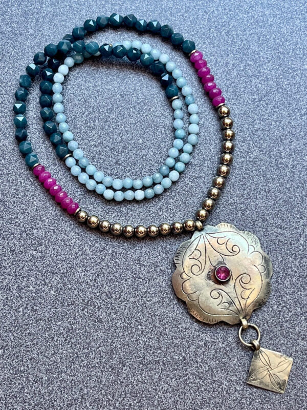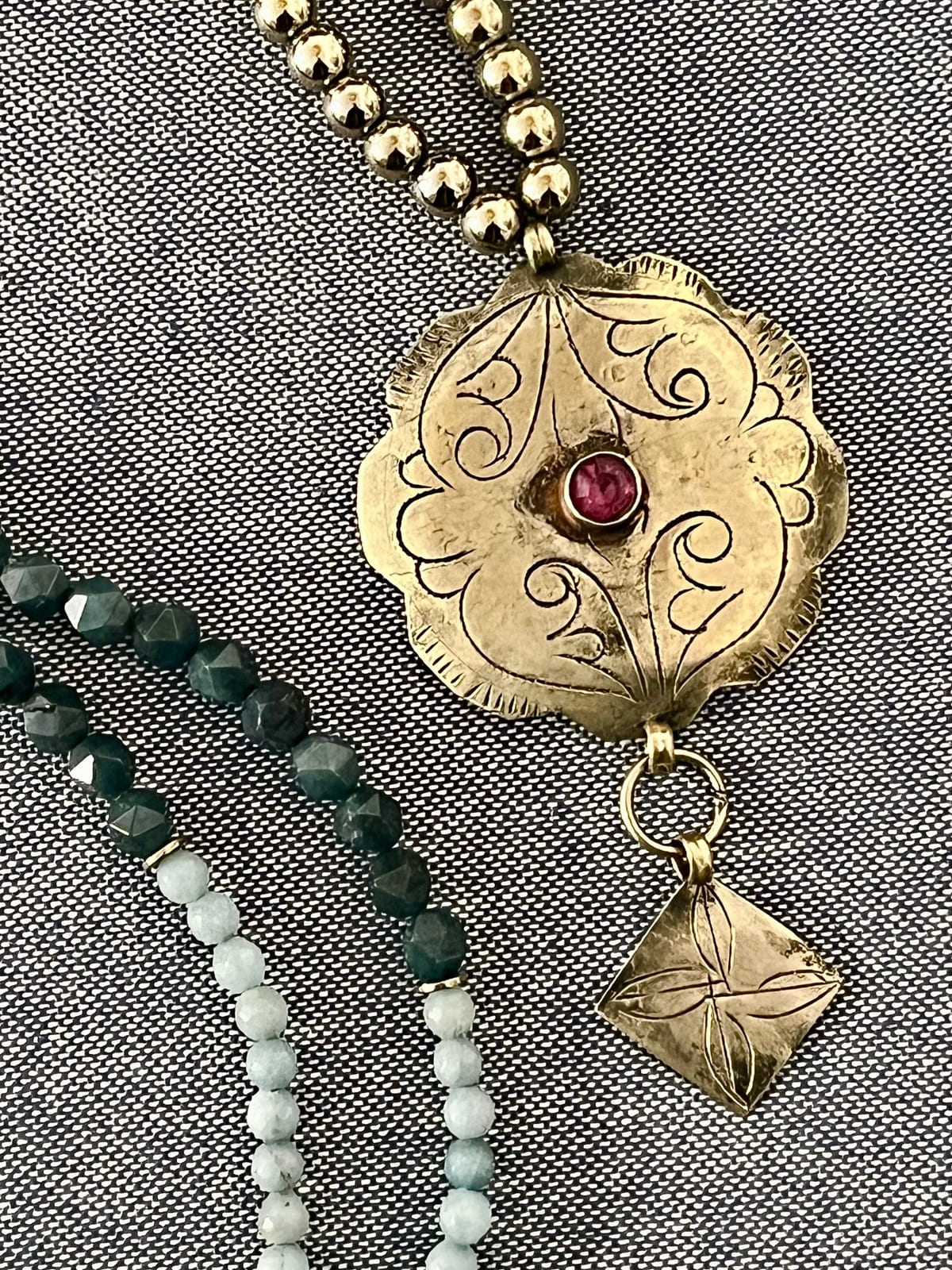 The pendant is framed by the glow of large golden hematite rounds, grounding the piece with a touch of radiance and strength. Around them dance a lively mix of flat, faceted agate stones in a rainbow of hues, their colorful surfaces reflecting the joy and vibrancy of traditional Afghan style. Adding to the eclectic harmony are bold, asymmetrically placed faceted agate beads in contrasting tones, balanced by smaller faceted agates in yet another shade, creating a rhythm of colors that feels both spontaneous and intentional.