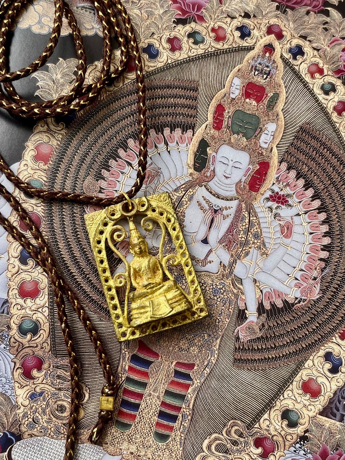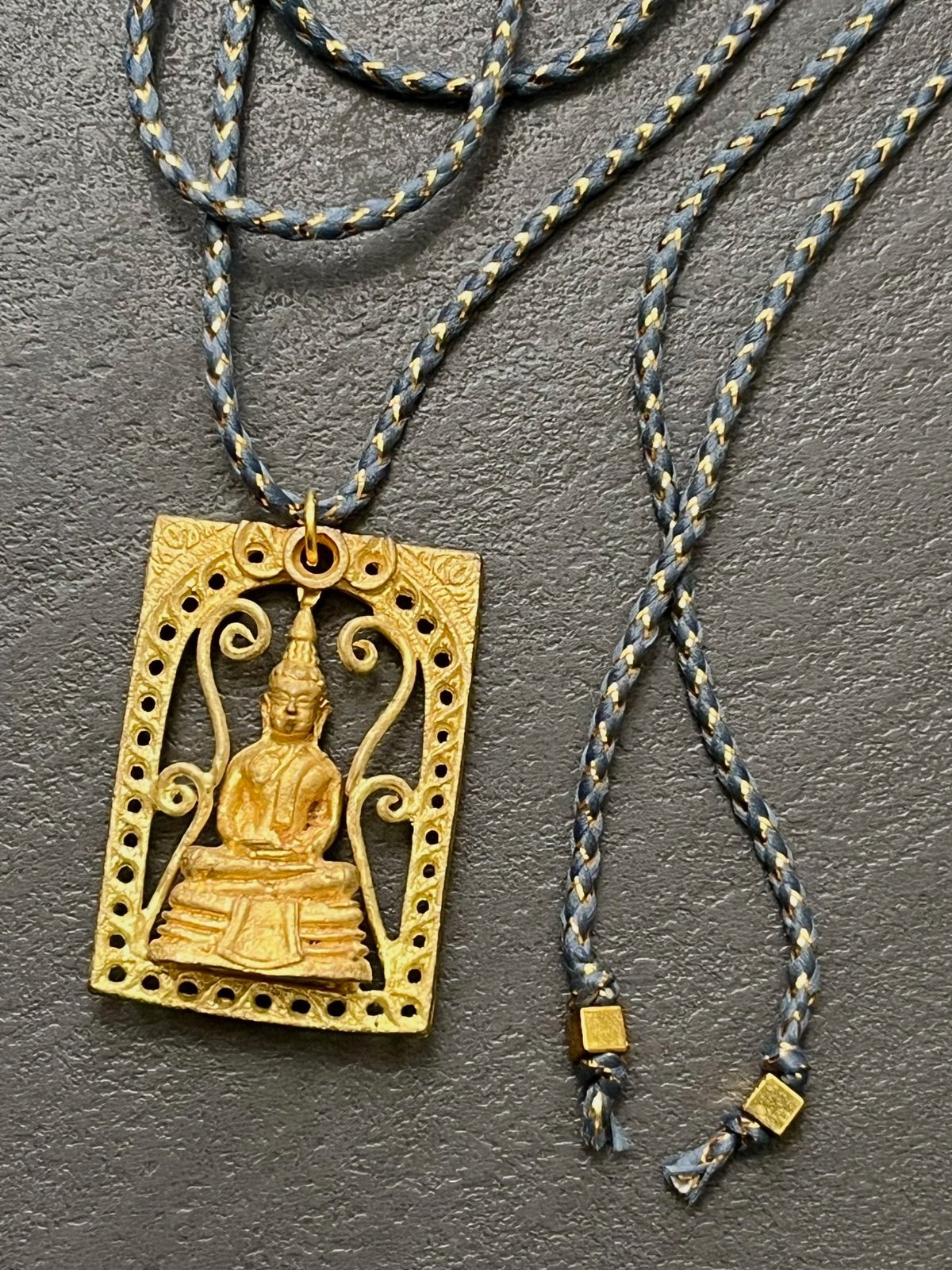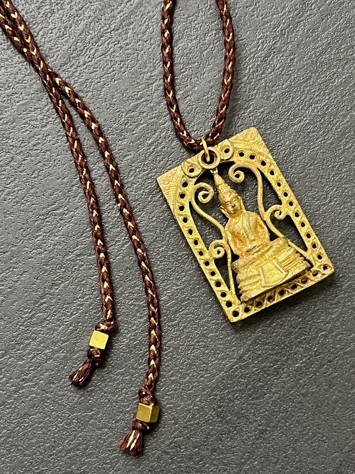 This elegant necklace features a cotton cord with golden lurex and a Thai golden brass amulet depicting a seated Buddha framed with ornate details. Blessed in temples, Thai amulets are believed to offer protection, good fortune, and spiritual guidance, making this piece a meaningful symbol of peace and mindfulness.
