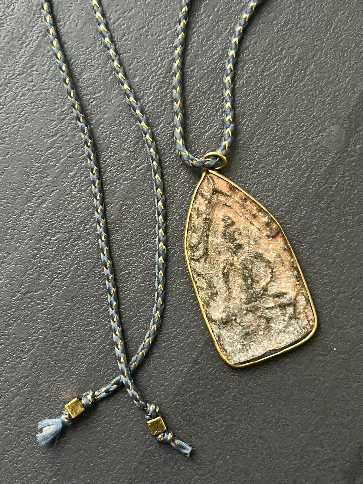 This refined necklace features a soft cotton cord interwoven with golden lurex for a subtle touch of light. At its center hangs a Thai temple amulet made of sacred clay depicting the Buddha in meditation. Traditionally blessed by monks, such amulets are believed to offer protection, good fortune, and spiritual guidance. The use of clay drawn from the earth symbolizes grounding, humility, and the impermanence of life, making this piece both meaningful and serene.