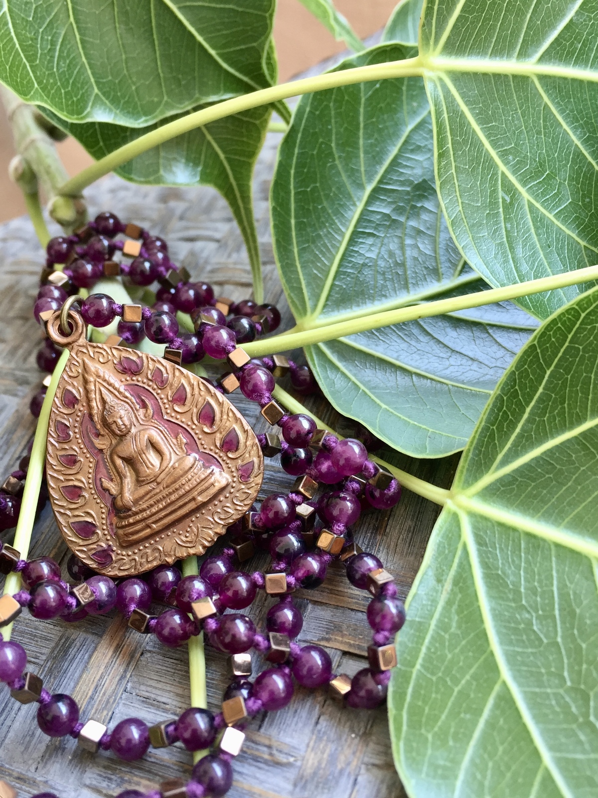 Vibrant and uplifting, the Buddha Energy Necklace is handcrafted with deep purple round agate beads, known for their spiritual insight and calming energy, hand-knotted and paired with bronze square hematite beads that bring grounding strength and subtle shimmer. The focal point is a Buddhist amulet, hand-picked from a Thai temple, in antique bronze finish, featuring a seated Buddha adorned with purple enamel details, executed in the traditional Thai style with elegant upward-pointing motifs. This necklace radiates spiritual energy, balance, and refined craftsmanship, making it both meaningful and striking.