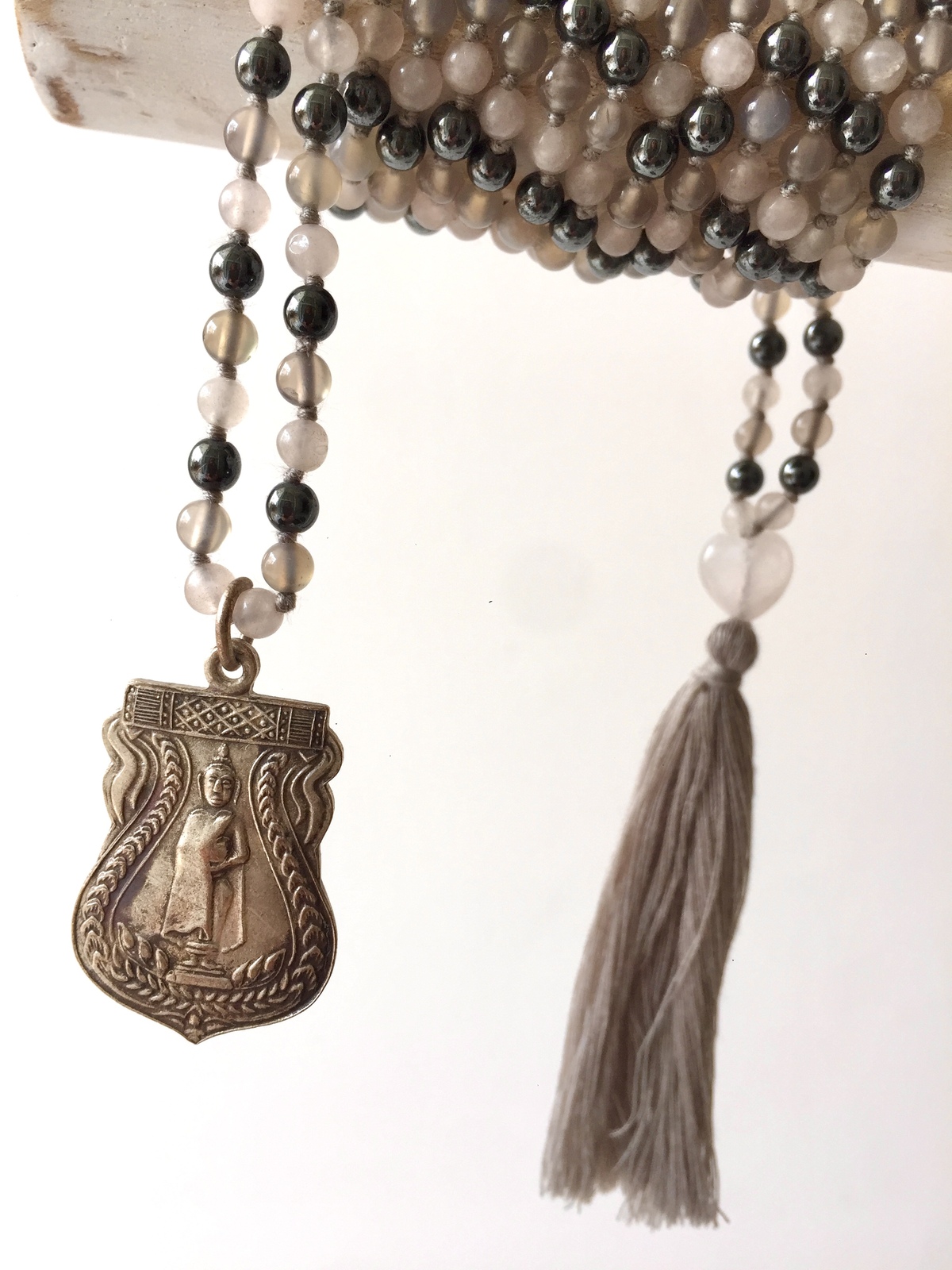 Handcrafted with care and intention, the Buddha Harmony Double Mala features approximately tiny grey agate beads paired with gunmetal hematite round stones, creating a balanced and grounding energy. A delicate faceted rose quartz heart serves as the guru bead, bringing gentle love and compassion into the practice. The focal point is a brass Buddhist amulet with silver metal finishing, adding spiritual elegance and mindful significance. Designed to be worn in a double loop around the neck, this mala blends subtle beauty with deep intention, perfect for meditation or daily wear.