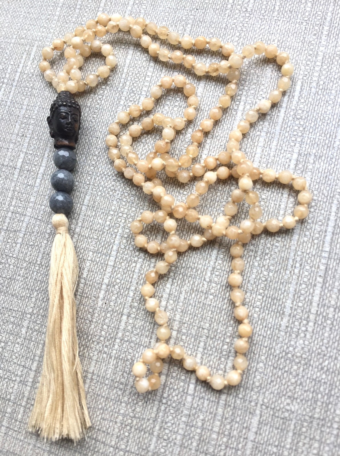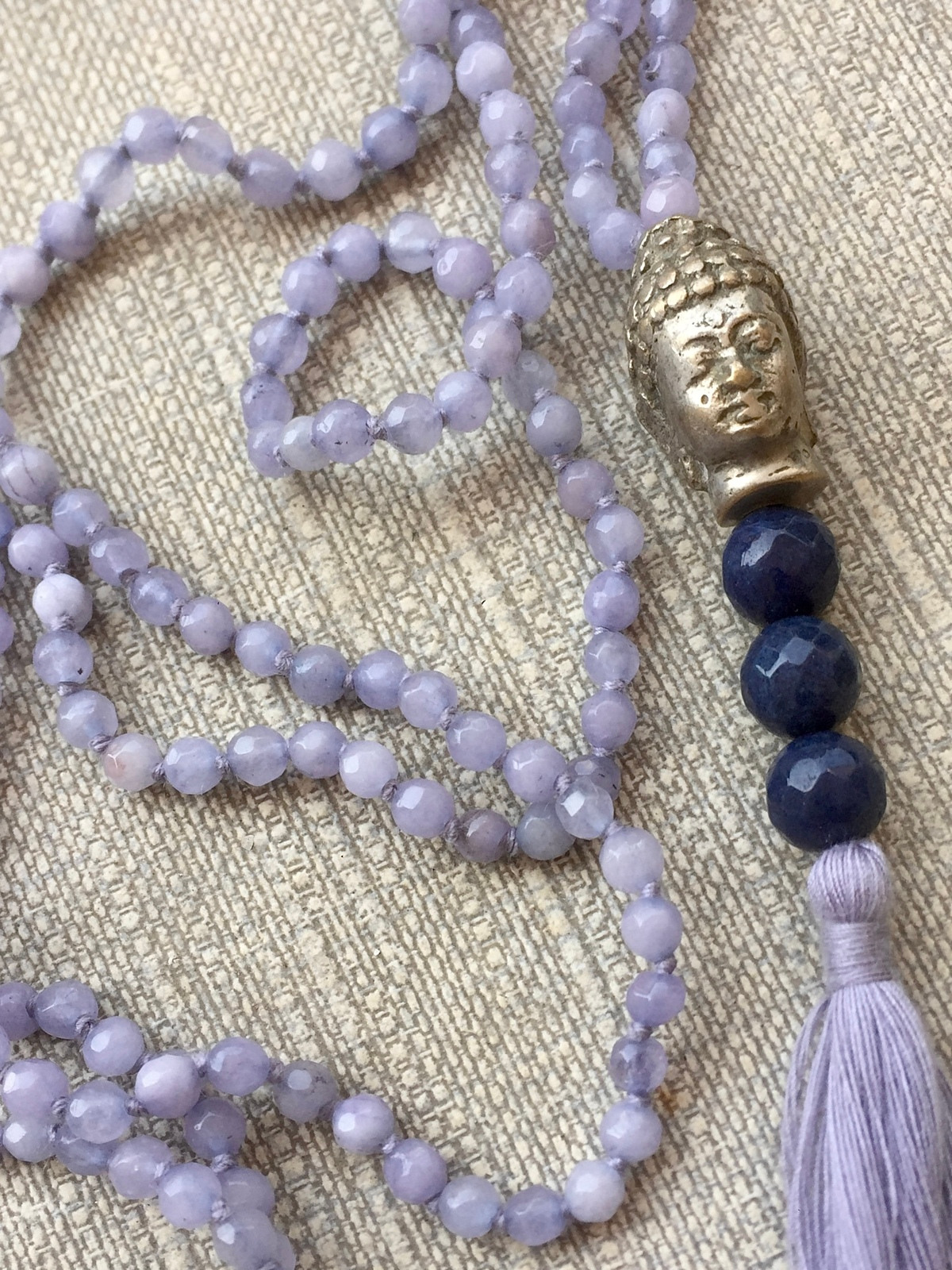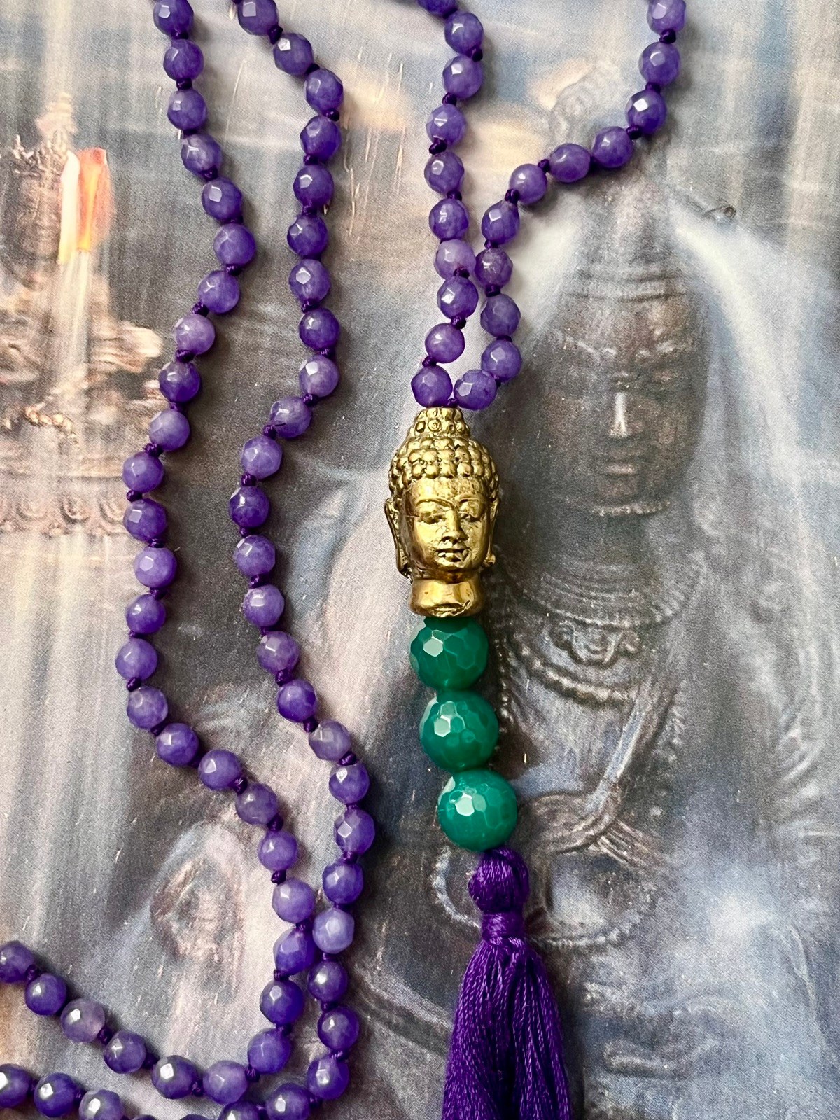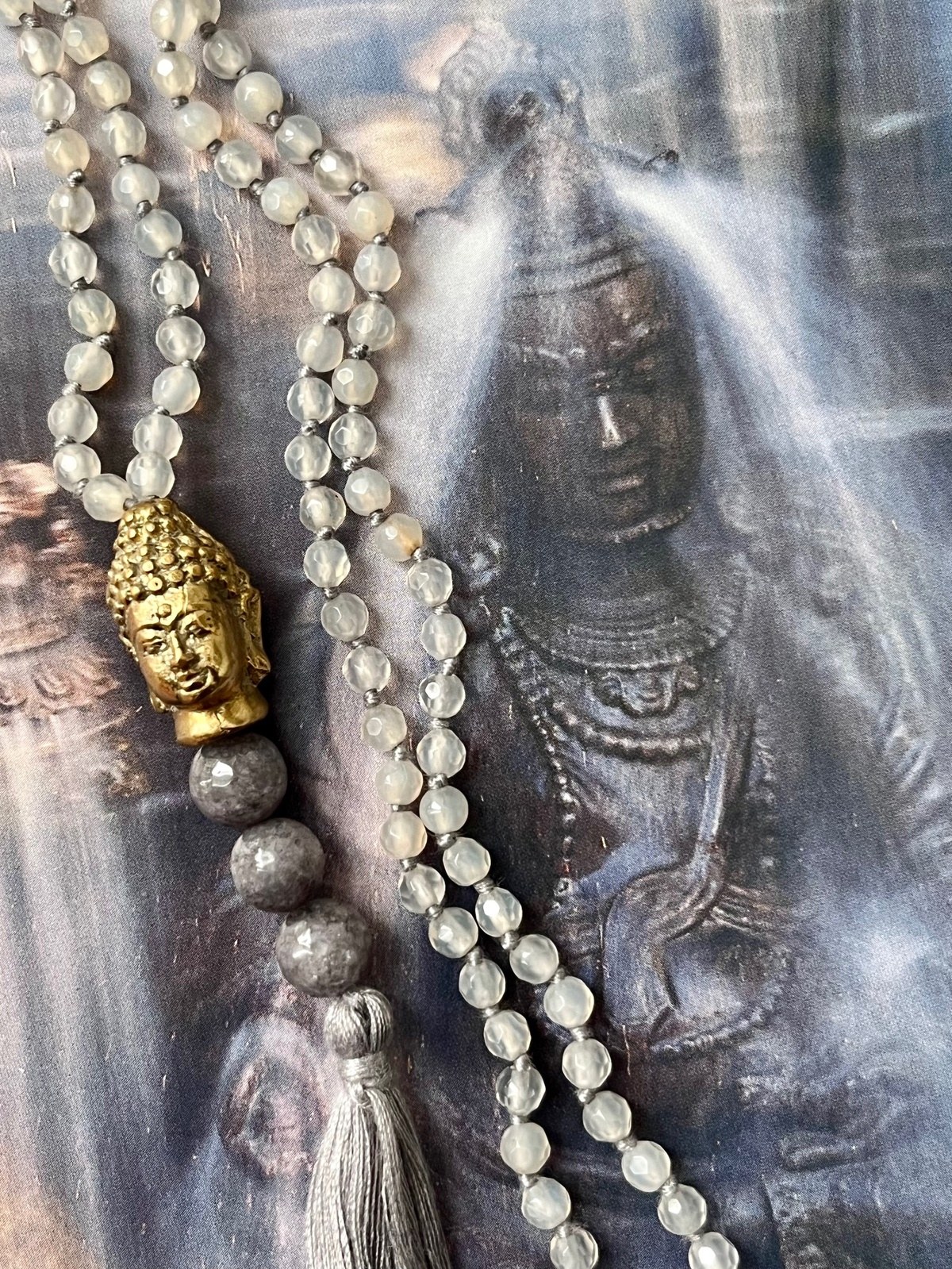 Handcrafted with love and intention, Buddha Presence Necklace features 4mm faceted agate beads, each hand-knotted to create a harmonious, tactile rhythm. The centerpiece is a brass Buddha head from Indonesia, available in different color finishes, embodying serenity, mindfulness, and centered presence. Before the tassel, three larger beads serve as guru beads, anchoring the design and adding visual and symbolic weight.