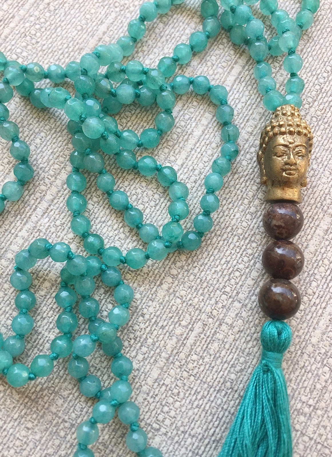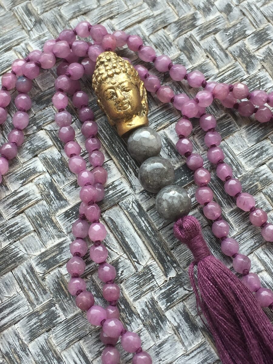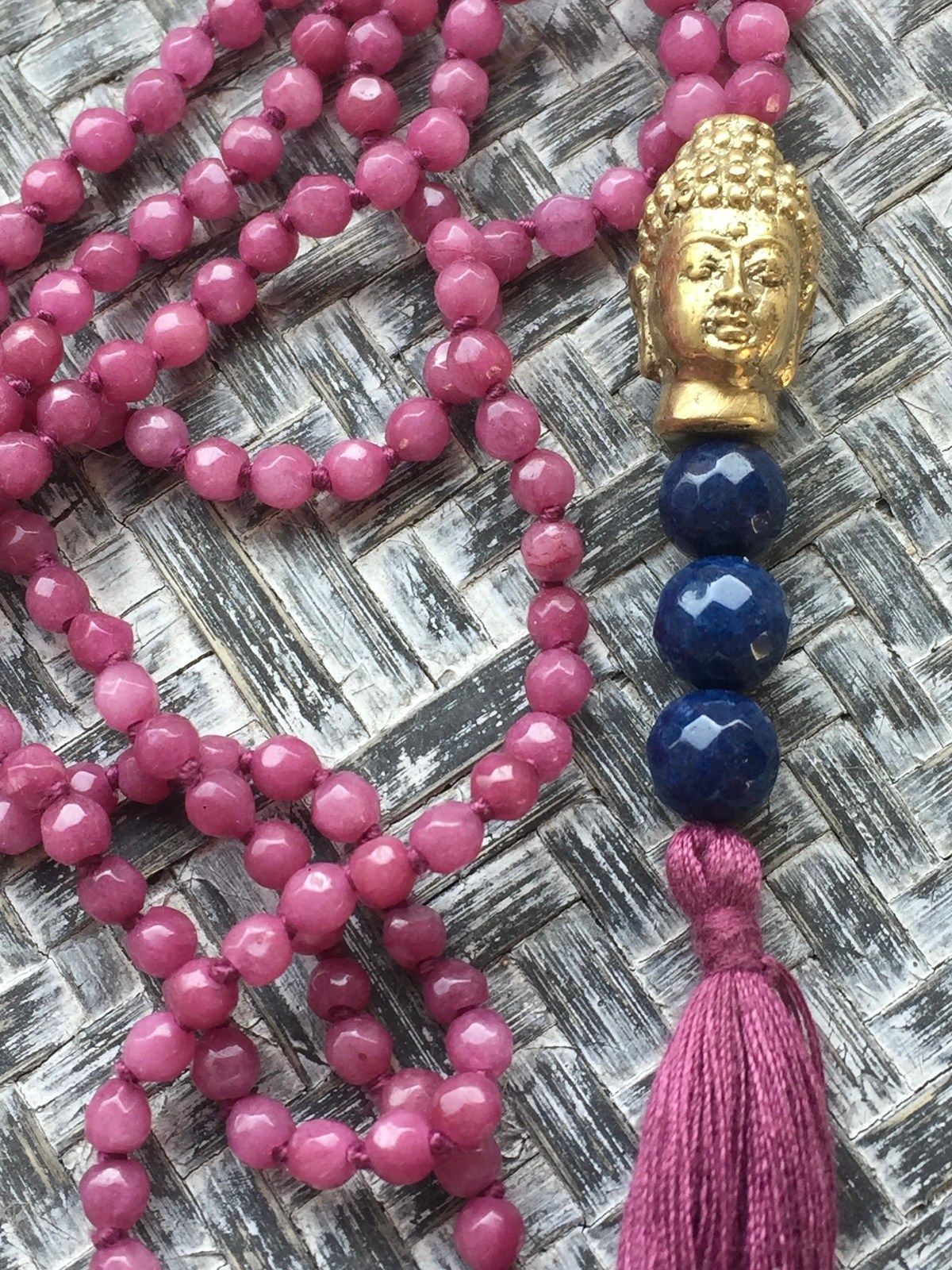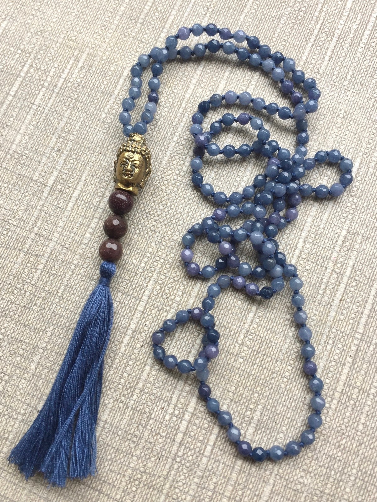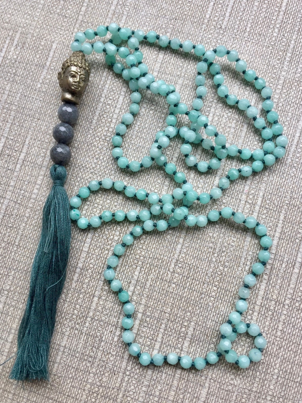 Handcrafted with love and intention, Buddha Presence Necklace features 4mm faceted agate beads, each hand-knotted to create a harmonious, tactile rhythm. The centerpiece is a brass Buddha head from Indonesia, available in different color finishes, embodying serenity, mindfulness, and centered presence. Before the tassel, three larger beads serve as guru beads, anchoring the design and adding visual and symbolic weight.