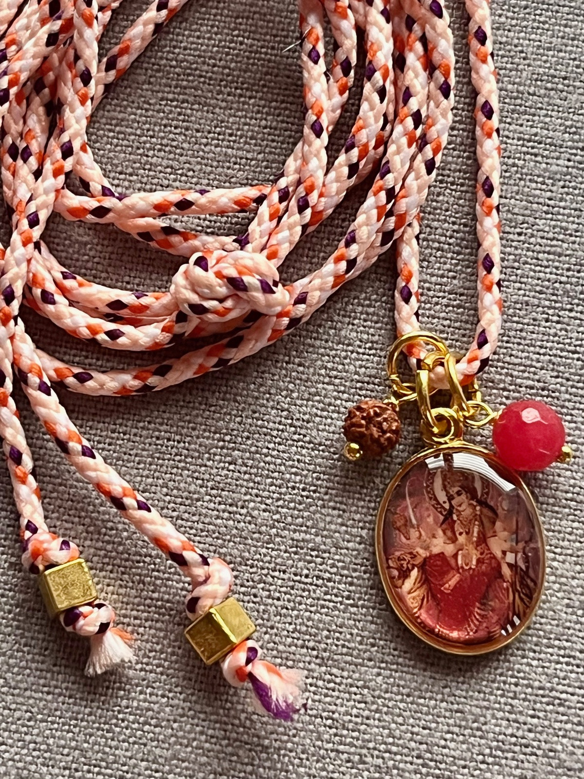 Designed with an adjustable cord, the necklace can be tied to your preferred length, making it versatile, lightweight, and easy to wear. Its cheerful colors, spiritual details, and charming design make it a fun, eye-catching accessory that effortlessly blends devotion, protection, and everyday fashion.