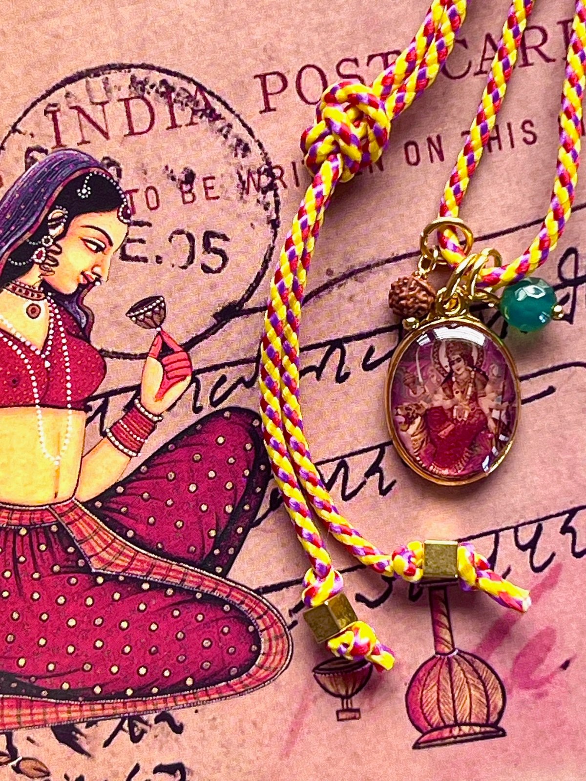 This playful and vibrant necklace combines spirituality with style. Strung on a colorful pop cord, it features a vintage golden pendant adorned a Goddess Durga figure. Durga, the goddess of strength, courage, and divine protection, brings empowering energy and fearless guidance to the wearer. A tiny rudraksha seed and a contrasting agate bead add subtle texture and energy, perfectly complementing the pendant’s colors.