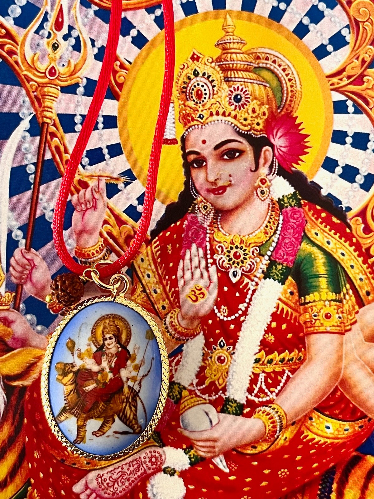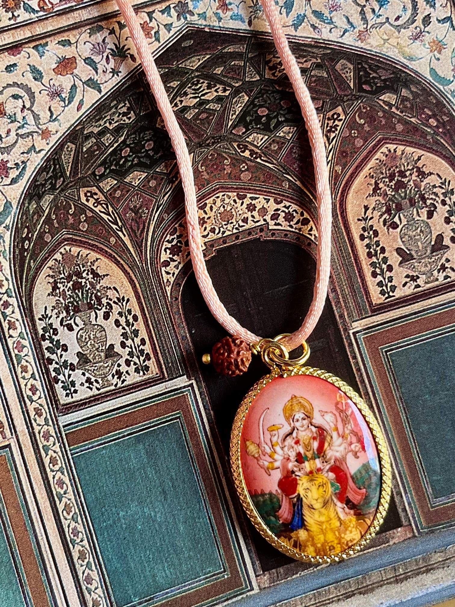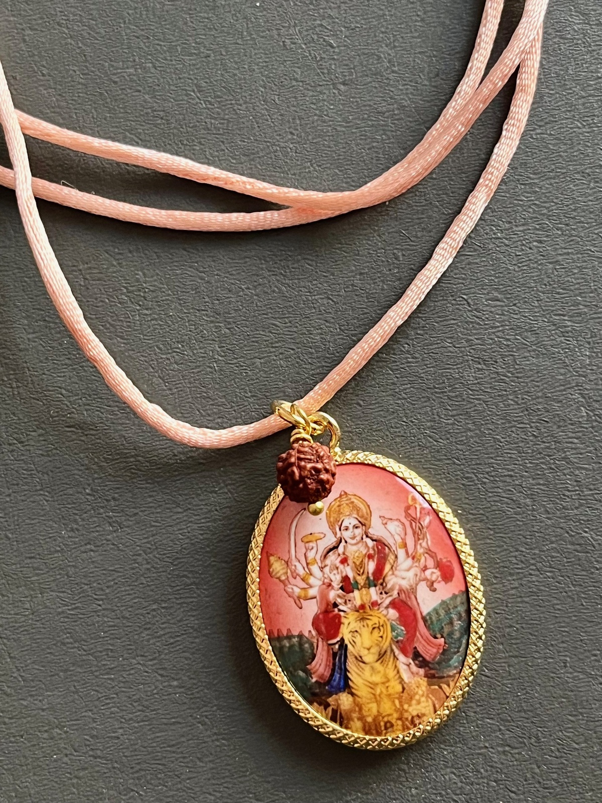 Handcrafted with a smooth satin cord, adjustable to your preferred length with a simple knot, this necklace combines timeless style with spiritual symbolism. At its heart lies a natural Rudraksha seed from India, revered for its protective and healing properties, paired with a large golden pendant featuring a vintage depiction of an Indian deity on one side and a golden Om on the reverse. This pendant depicts Goddess Durga with her trident, sword, and lotus, symbolizing courage, strength, and divine power. Durga embodies the protection of devotees and the triumph of good over negativity, radiating empowerment and resilience. The combination creates a wearable talisman of devotion, protection, and elegance, blending tradition with contemporary style.