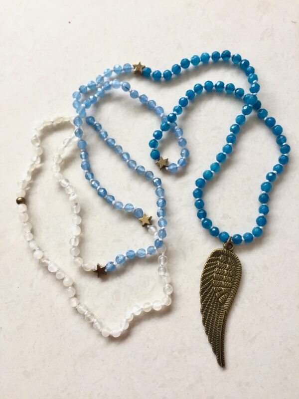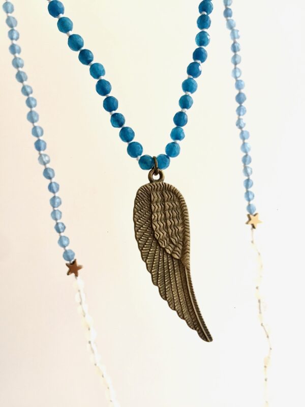 The Fly High Necklace captures the serene beauty of sky and clouds. Hand-knotted beads in different shades of light blue agate and luminous white moonstone create a gentle, airy palette, while golden hematite stars add subtle twinkles like sunlight on clouds. A brass wing pendant serves as the centerpiece, symbolizing freedom, aspiration, and the courage to soar. A harmonious blend of color, texture, and meaning, this necklace inspires both grace and uplifted spirit.