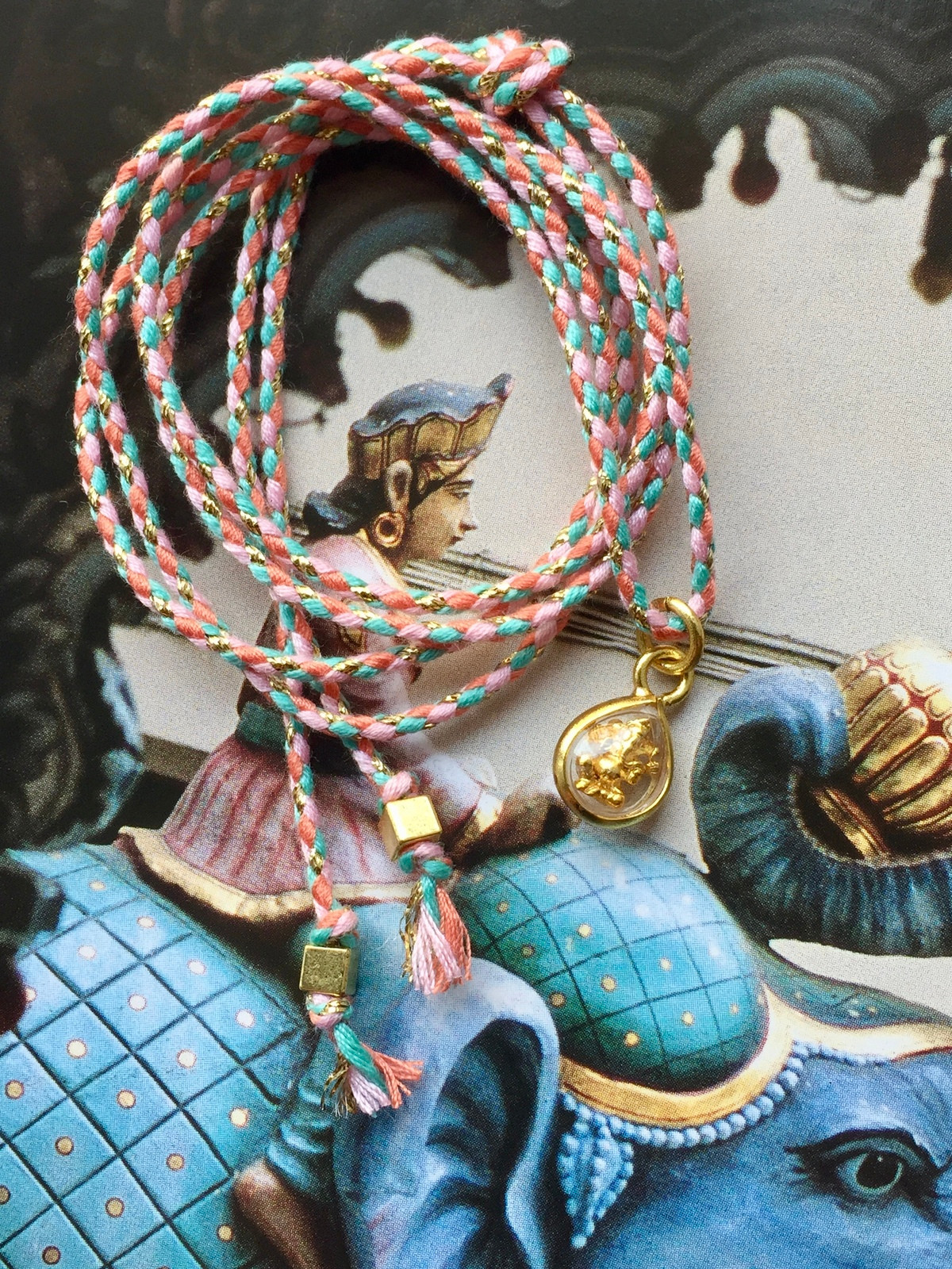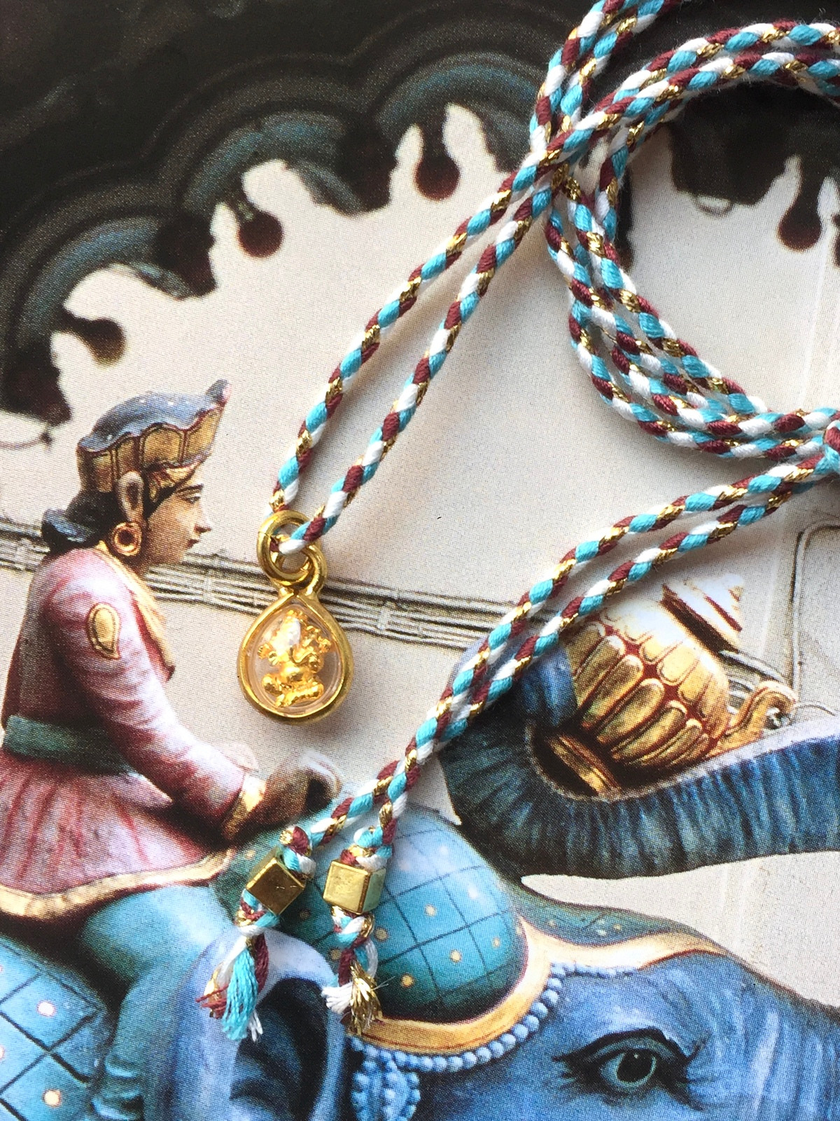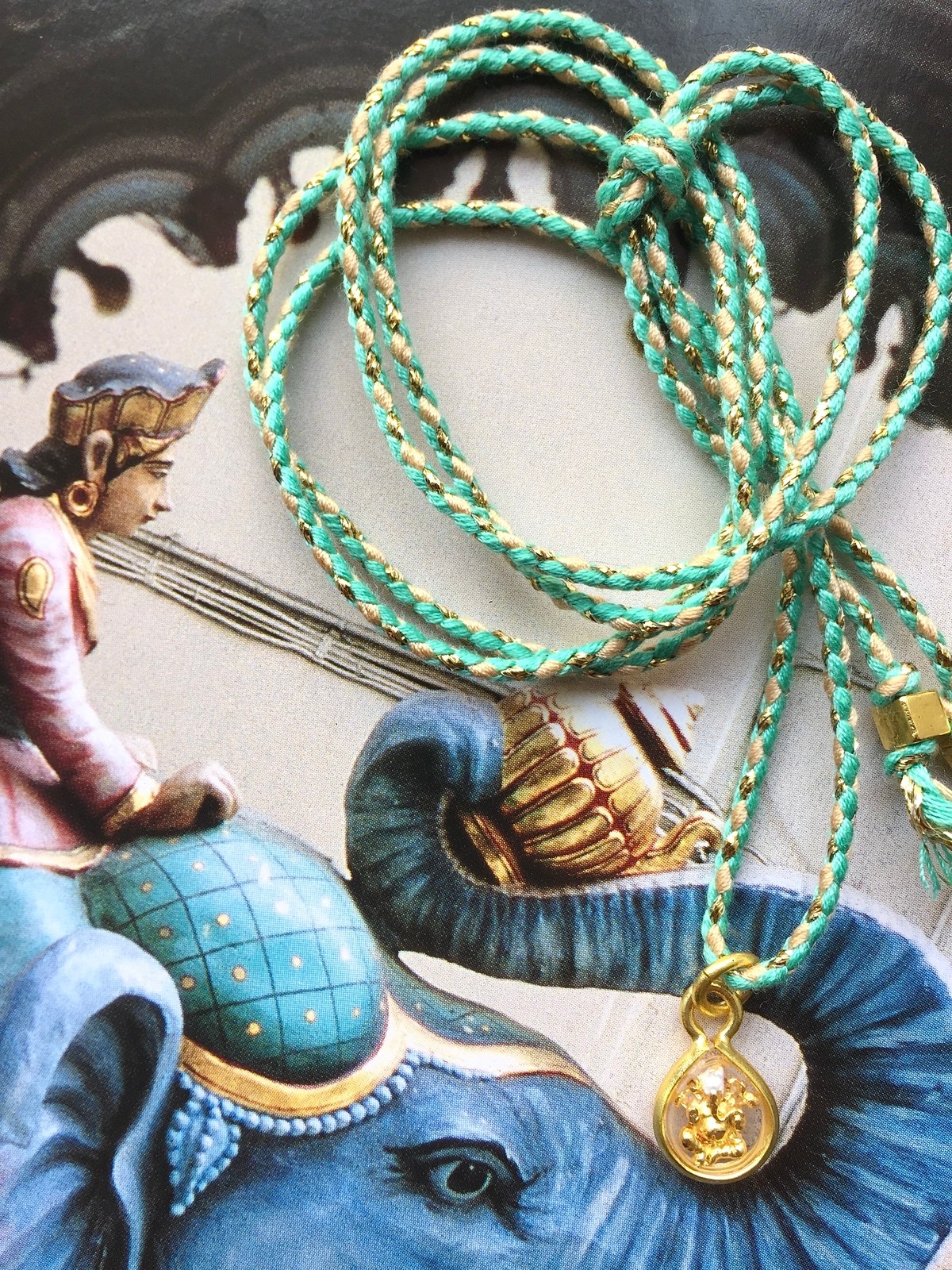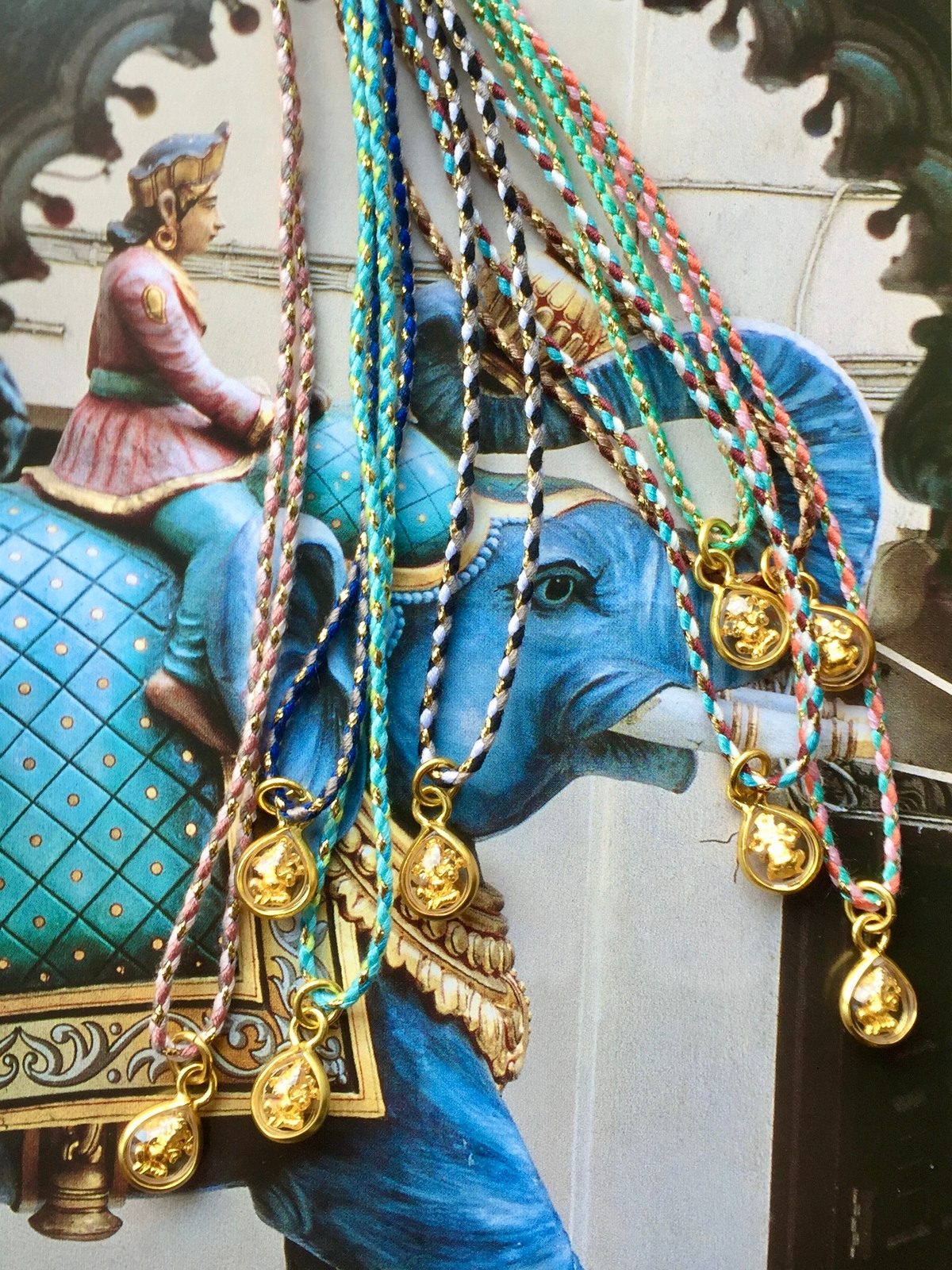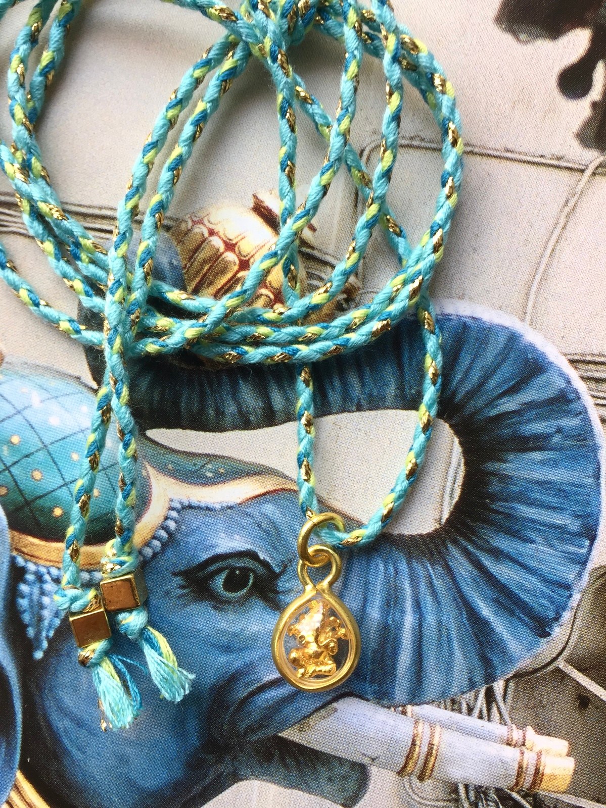 The Ganesh Amulet Magic Cord Necklace is a delicate yet powerful talisman, available in several joyful color options. Each piece is crafted with a multicolor cord woven with shimmering golden lurex to wear with a knot at a preferred length. It carries a charming drop-shaped holder pendant, within which rests a tiny golden murti of Ganesh—the elephant-headed deity beloved as the remover of obstacles and the bringer of wisdom, prosperity, and new beginnings.