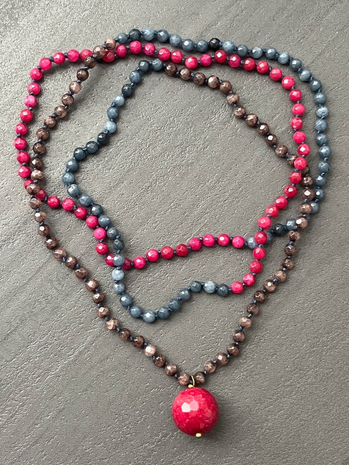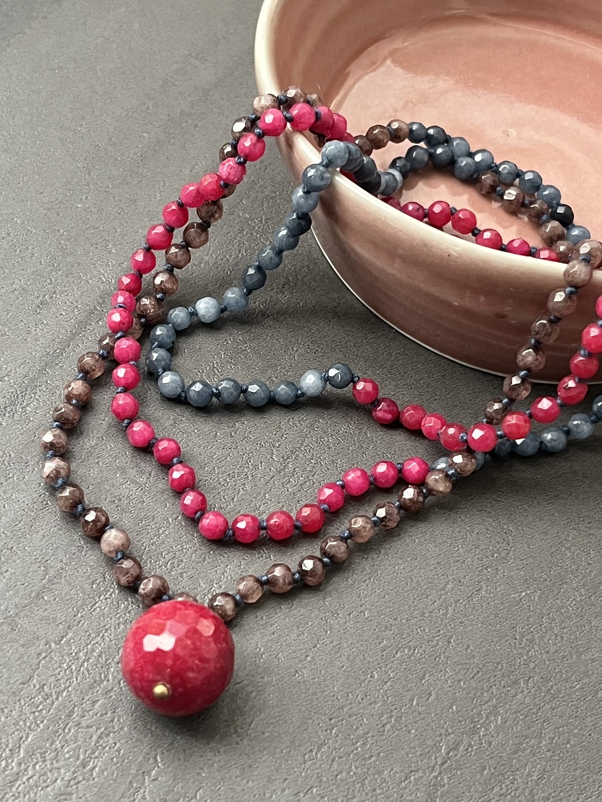 The Globe Necklace, hand-knotted with 4mm agate beads in three harmonious colors, brown, blue, ruby celebrates the beauty of our world and the magic of all its colors. Its chic, minimal design highlights the natural elegance of the materials, while the faceted beads capture the light beautifully with every movement. At its center, a round faceted Indian ruby semiprecious stone pendant represents the globe, symbolizing love for travel, exploration, and the endless wonder of discovery. A meaningful piece for free spirits and dreamers, it reminds the wearer that the world is full of beauty and possibility.
