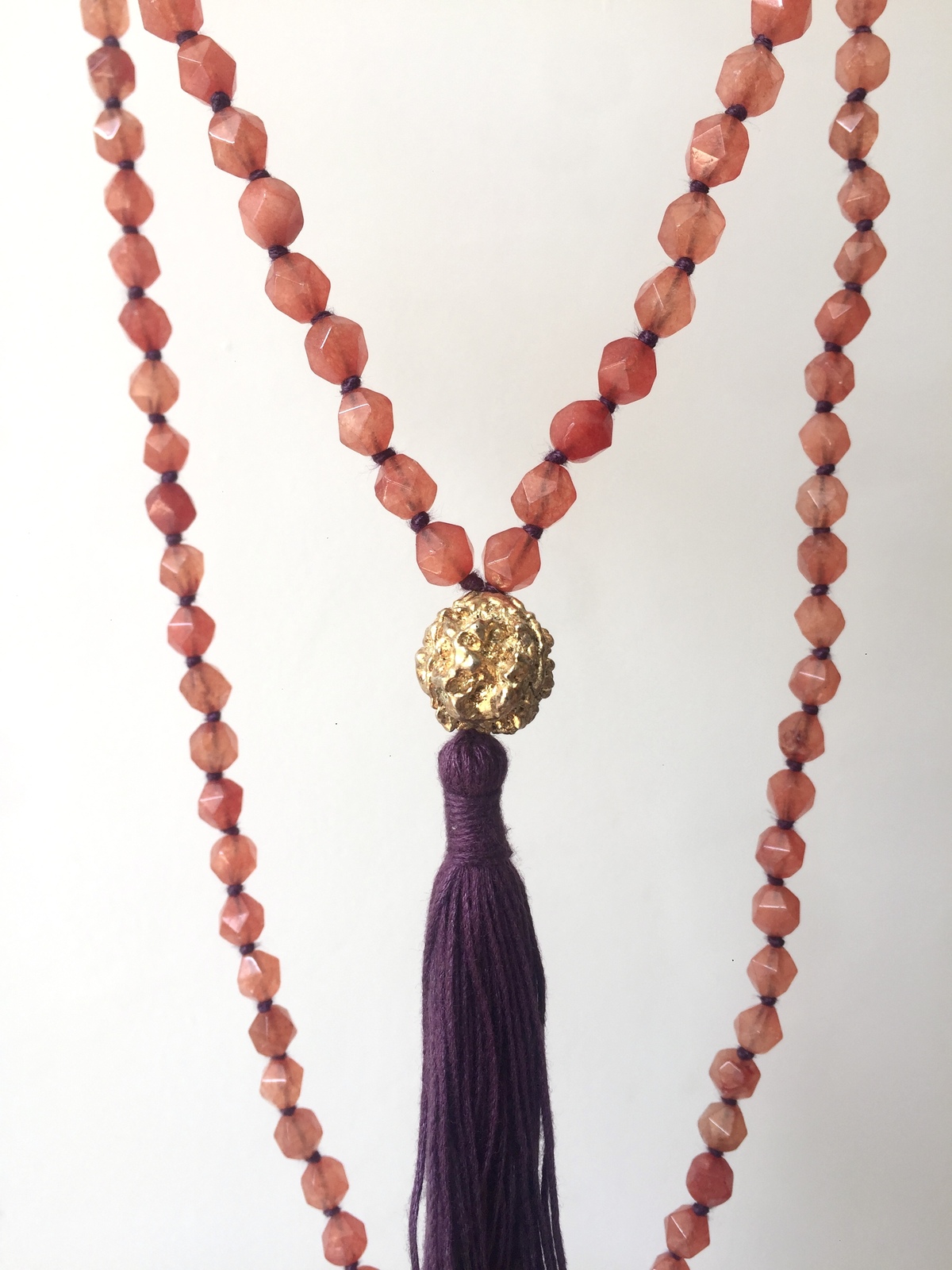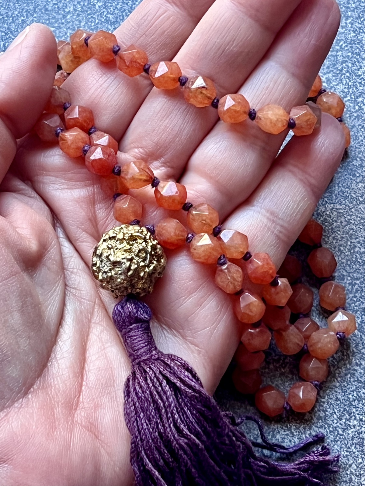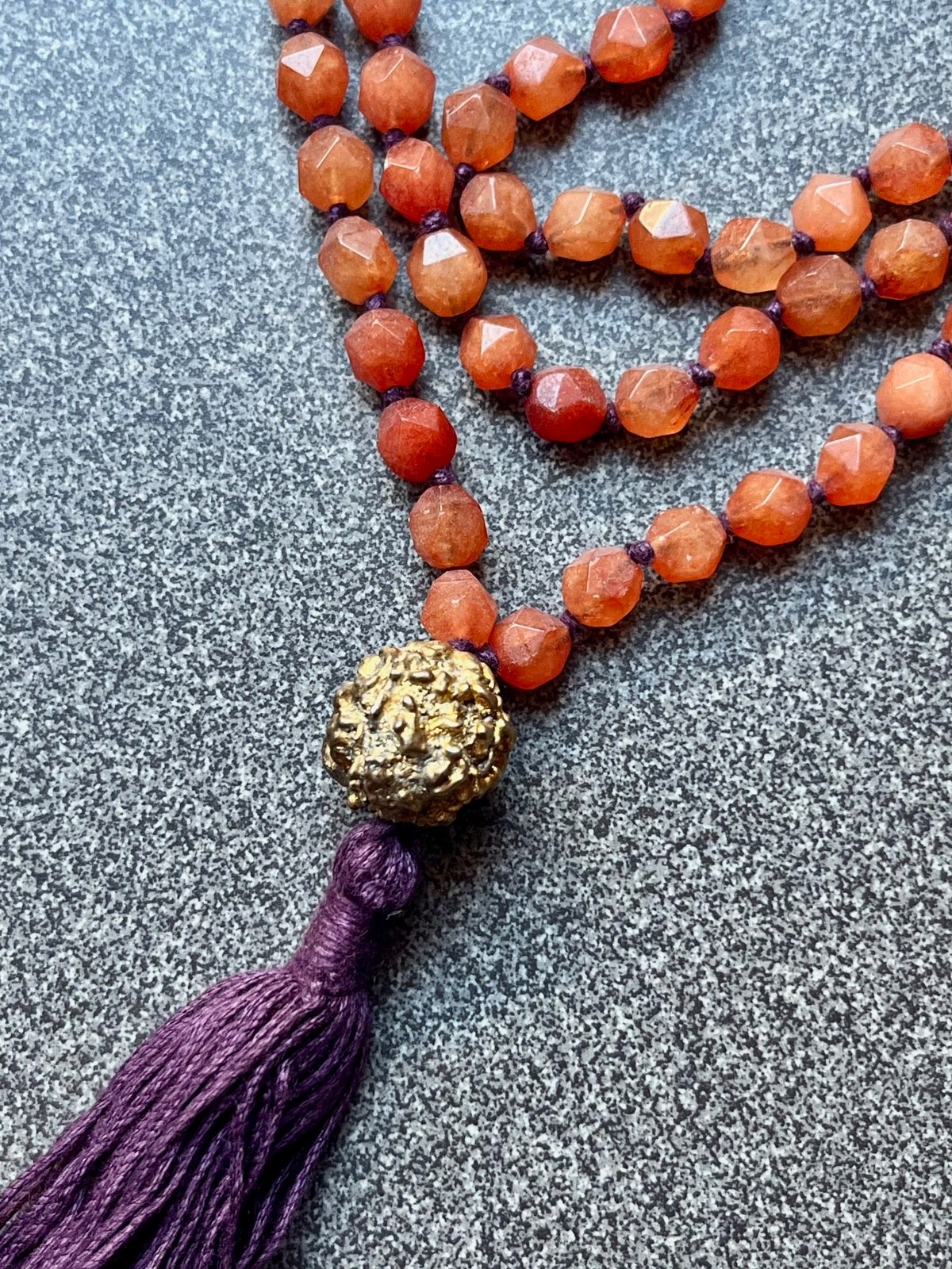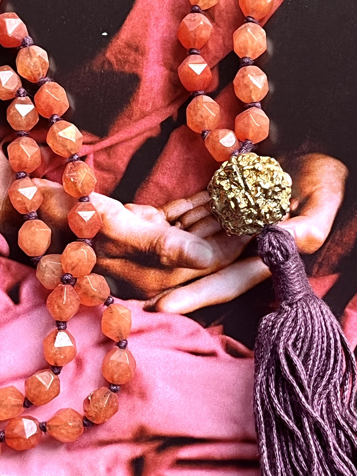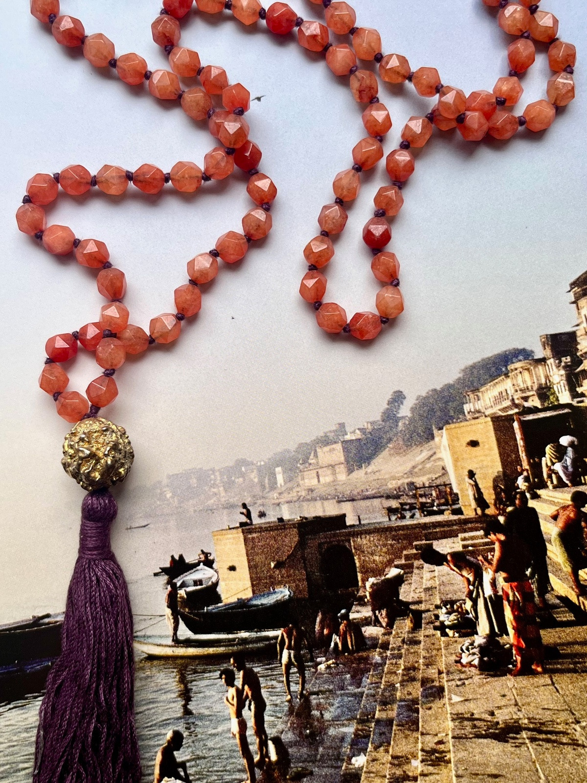 The Golden Rudra Necklace is a radiant blend of fashion and spirituality, a piece that carries both meaning and beauty. Composed of 108 asymmetrically faceted agate beads, each hand-knotted with contrasting threads, it celebrates the infinite palette of colors of India, where every hue evokes emotion, energy, and sacred symbolism. The strands come together in a vibrant handmade tassel, expressing movement and vitality.