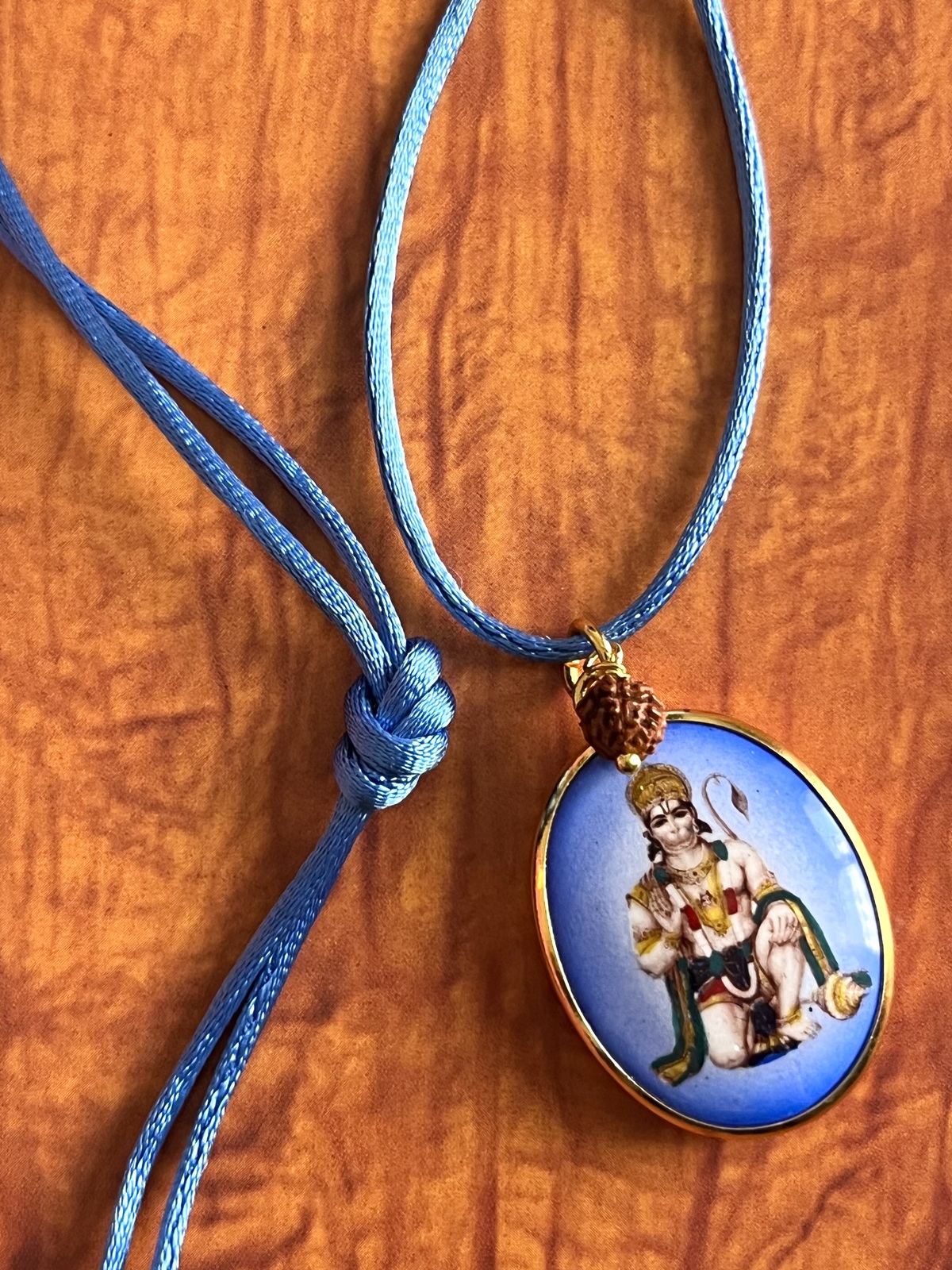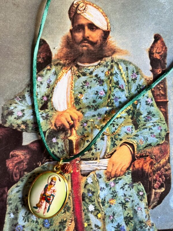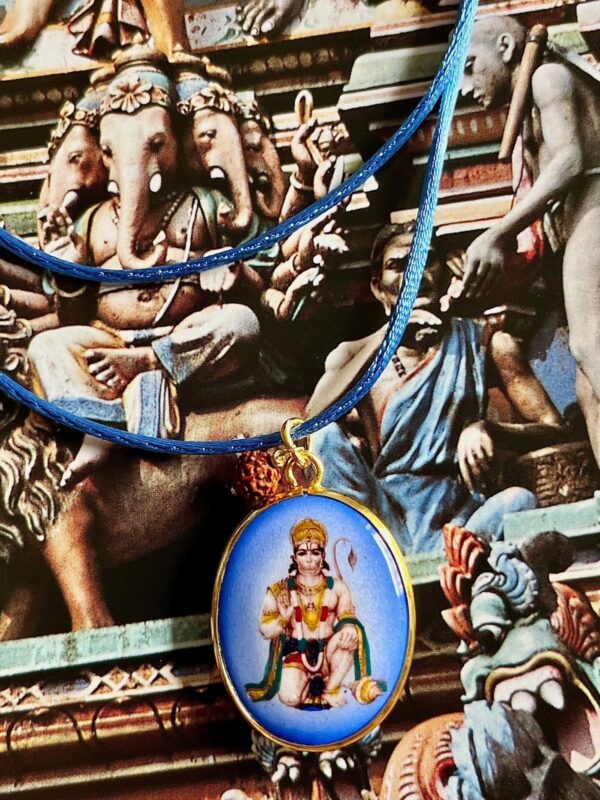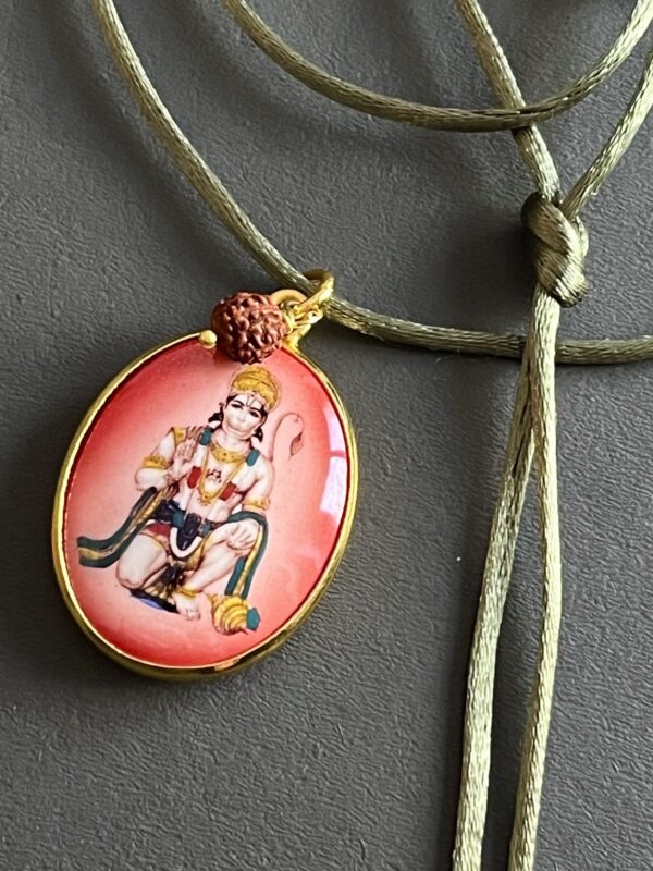 Handcrafted with a smooth satin cord, adjustable to your preferred length with a simple knot, this necklace combines timeless style with spiritual symbolism. At its heart lies a natural Rudraksha seed from India, revered for its protective and healing properties, paired with a large golden pendant featuring a vintage depiction of an Indian deity on one side and a golden Om on the reverse. This pendant depicts Lord Hanuman with his mace, mountain, and folded hands, symbolizing strength, loyalty, and courage. Hanuman embodies devotion, protection, and fearlessness, radiating resilience and guidance. The combination creates a wearable talisman of devotion, protection, and elegance, blending tradition with contemporary style.