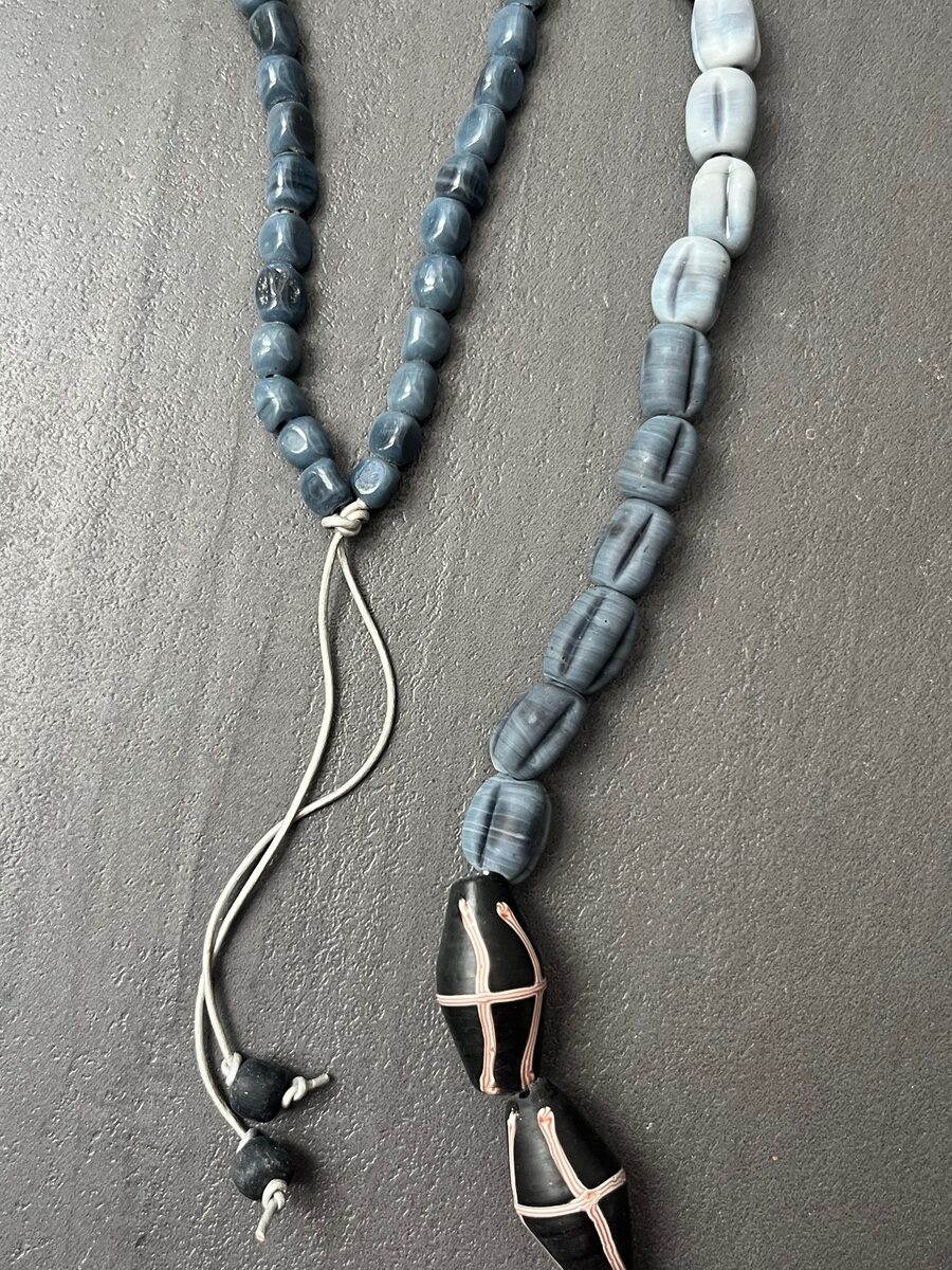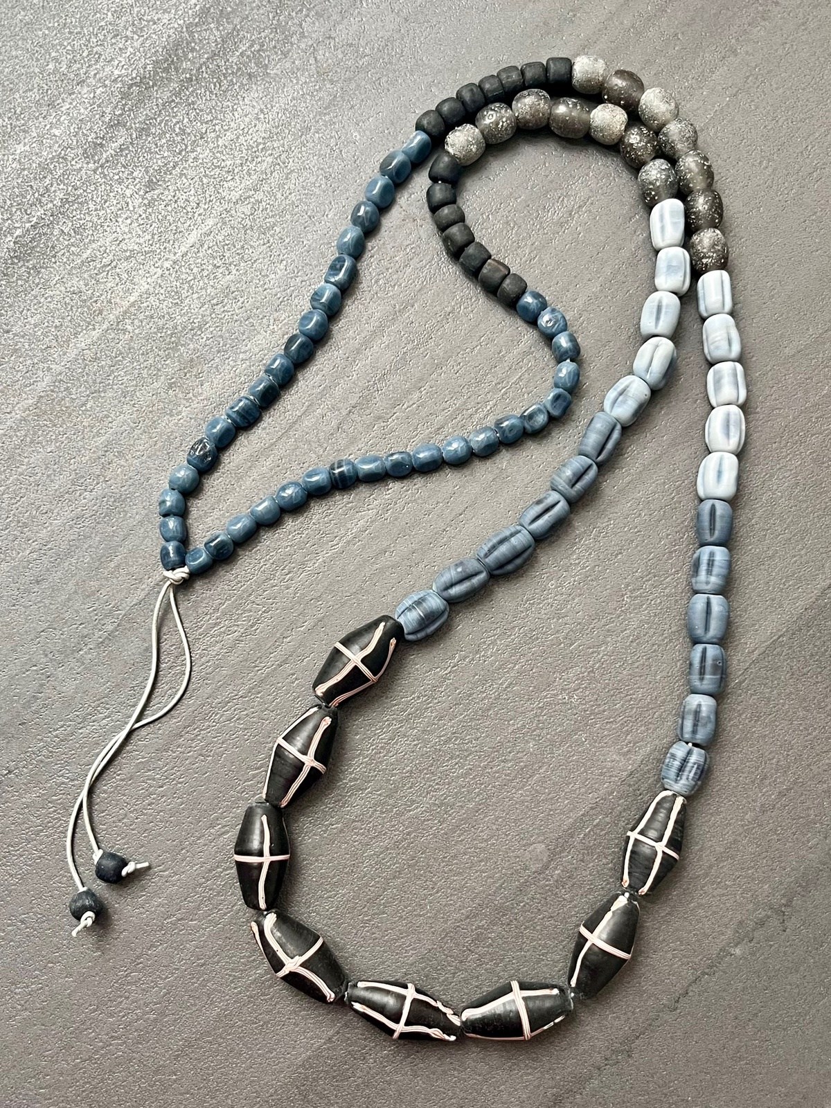 The Java Necklace is a boho-chic statement piece that celebrates artisanal craftsmanship and timeless style. Handmade glass beads from Java, each one unique in shape, size, and texture, are strung on a soft leather strap, forming a refined yet earthy design. Their harmonious rhythm and gorgeous color combination recall the rich palettes of Indonesian textiles, with a balance of warm and vibrant tones. The beads’ chic matte finish and powdery look enhance their natural charm and give the necklace an understated elegance.