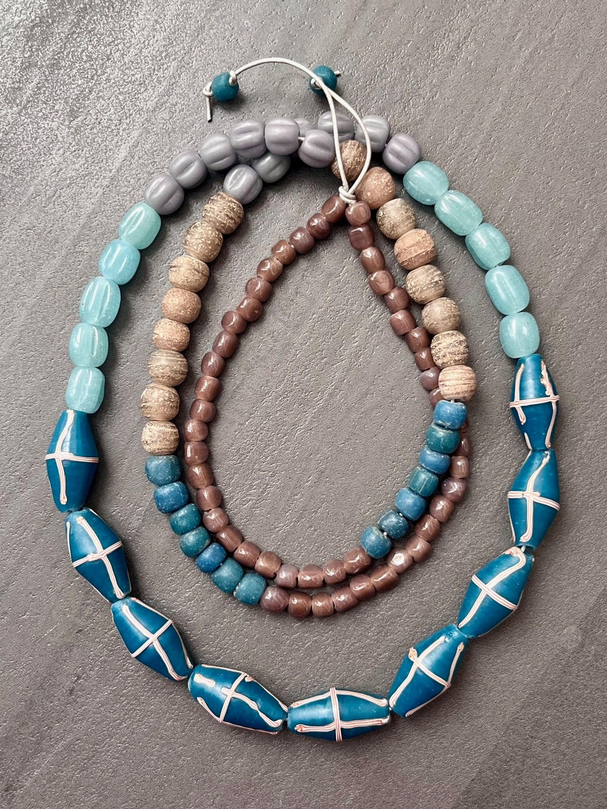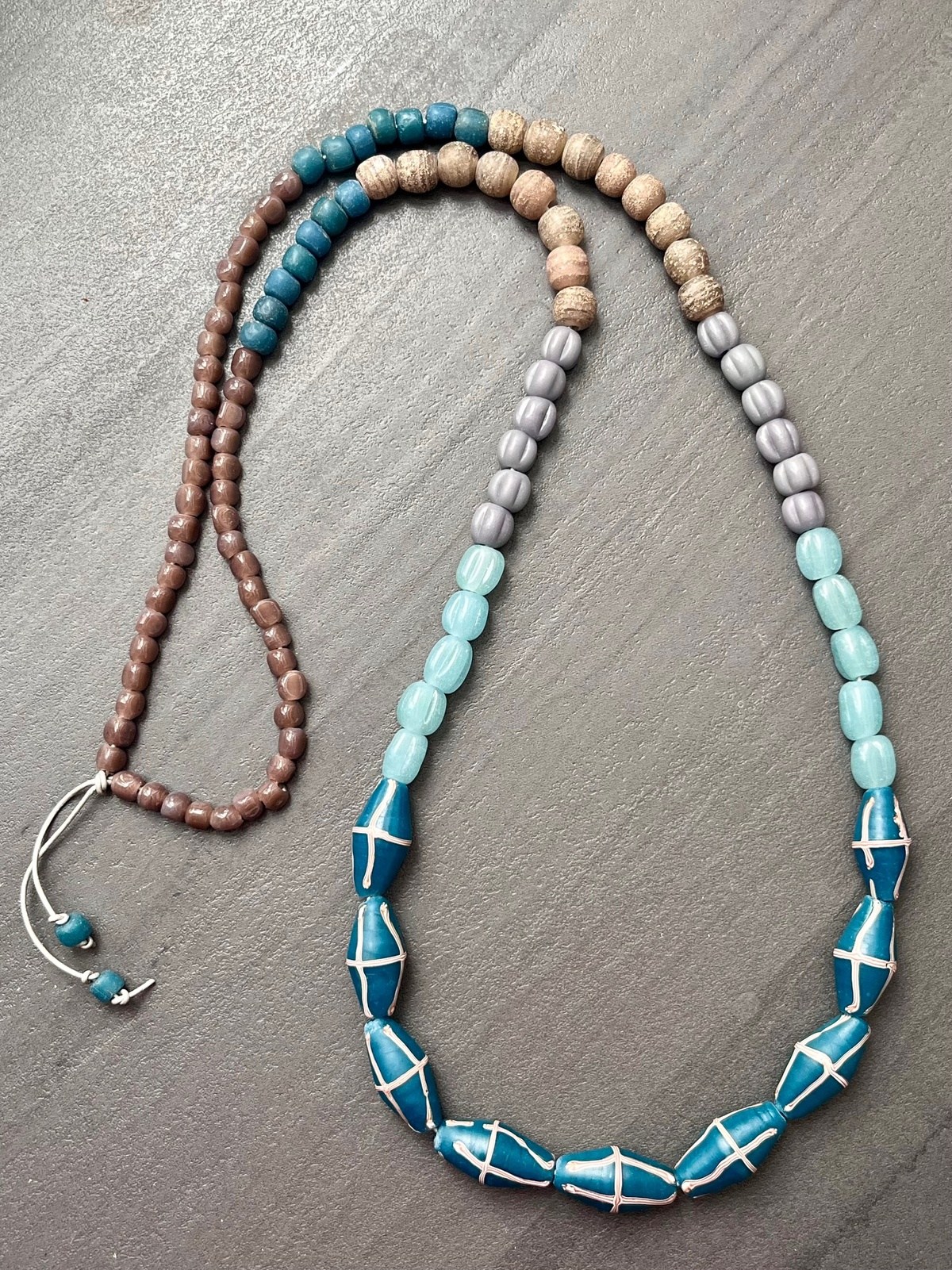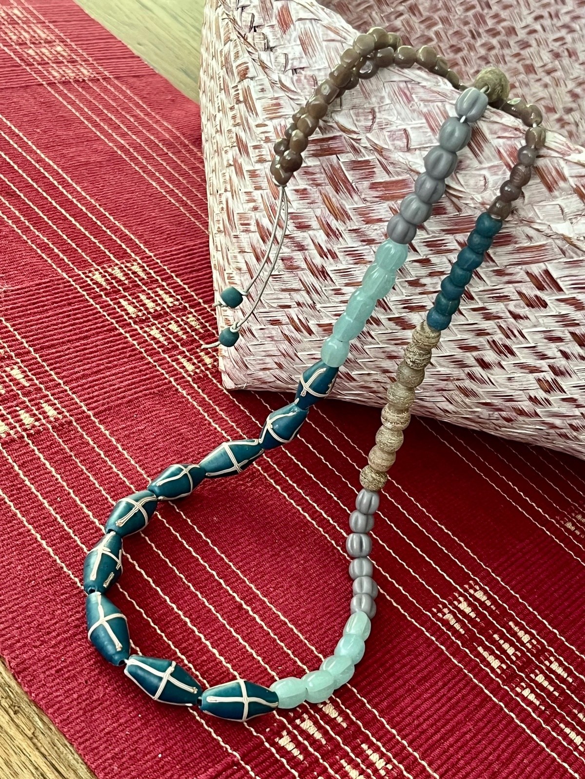The Java Necklace is a boho-chic statement piece that celebrates artisanal craftsmanship and timeless style. Handmade glass beads from Java, each one unique in shape, size, and texture, are strung on a soft leather strap, forming a refined yet earthy design. Their harmonious rhythm and gorgeous color combination recall the rich palettes of Indonesian textiles, with a balance of warm and vibrant tones. The beads’ chic matte finish and powdery look enhance their natural charm and give the necklace an understated elegance.