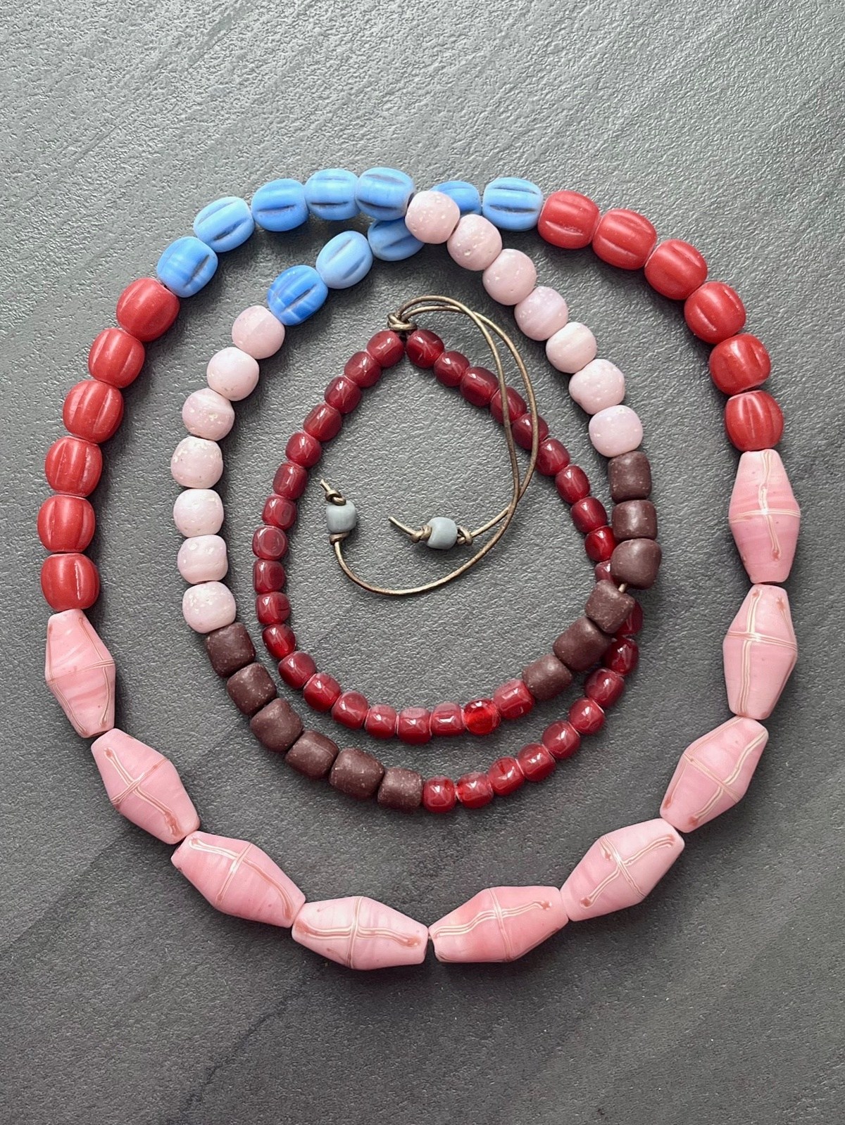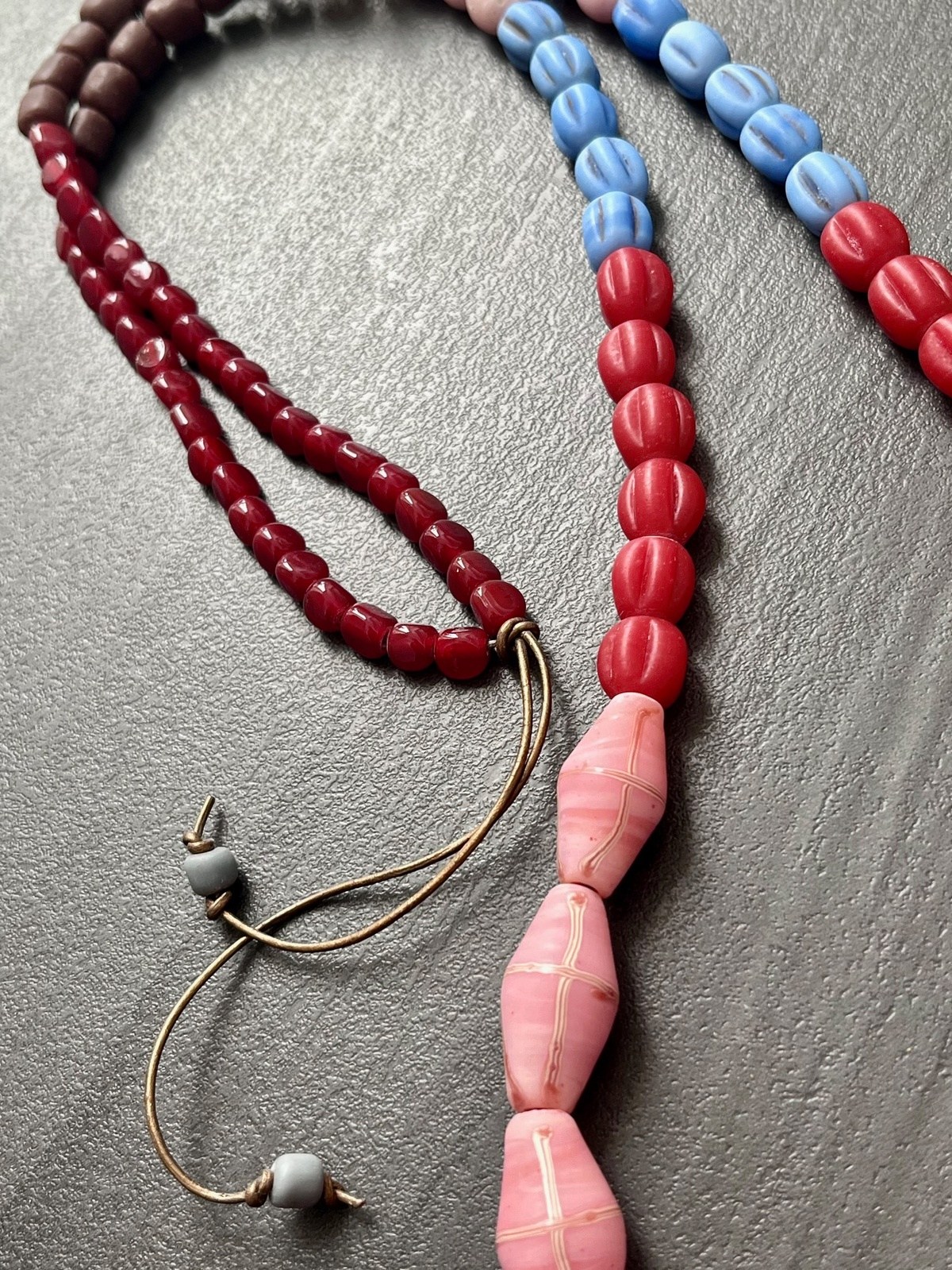 The Java Necklace is a boho-chic statement piece that celebrates artisanal craftsmanship and timeless style. Handmade glass beads from Java, each one unique in shape, size, and texture, are strung on a soft leather strap, forming a refined yet earthy design. Their harmonious rhythm and gorgeous color combination recall the rich palettes of Indonesian textiles, with a balance of warm and vibrant tones. The beads’ chic matte finish and powdery look enhance their natural charm and give the necklace an understated elegance.