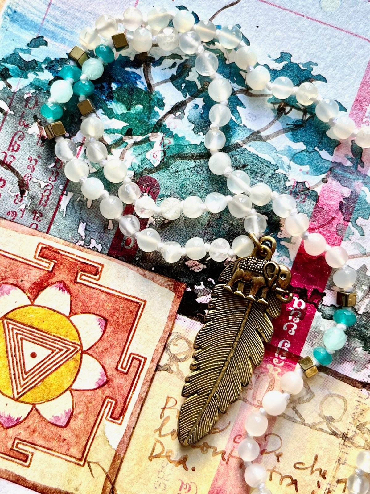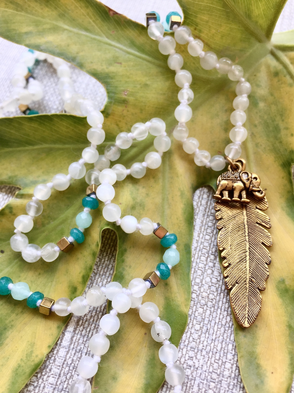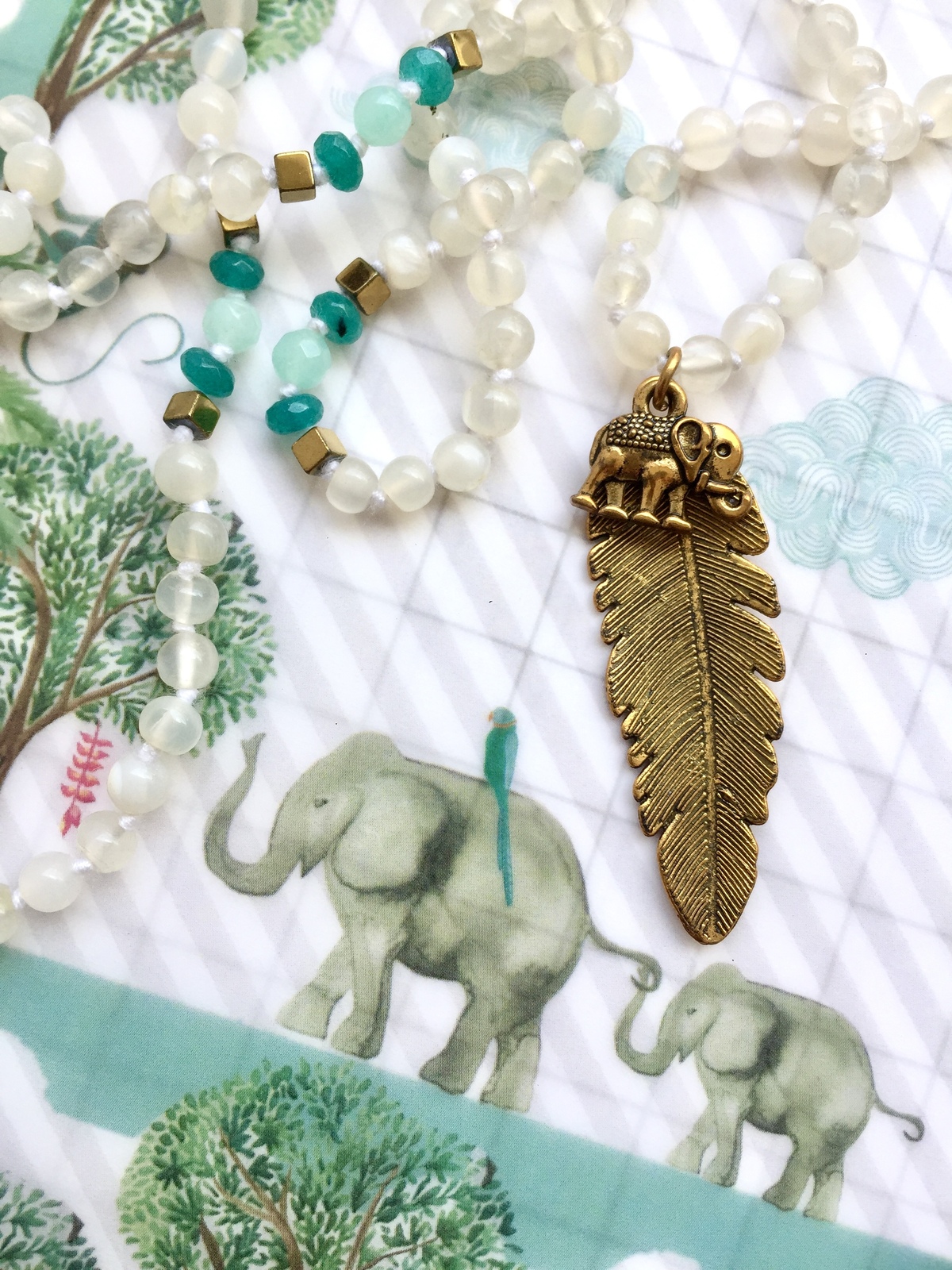 Hand-knotted with luminous moonstone beads, vibrant green agate, and golden hematite, it radiates both serenity and vitality. The pendant, a brass elephant resting on a feather, recalls the gentle strength of nature.