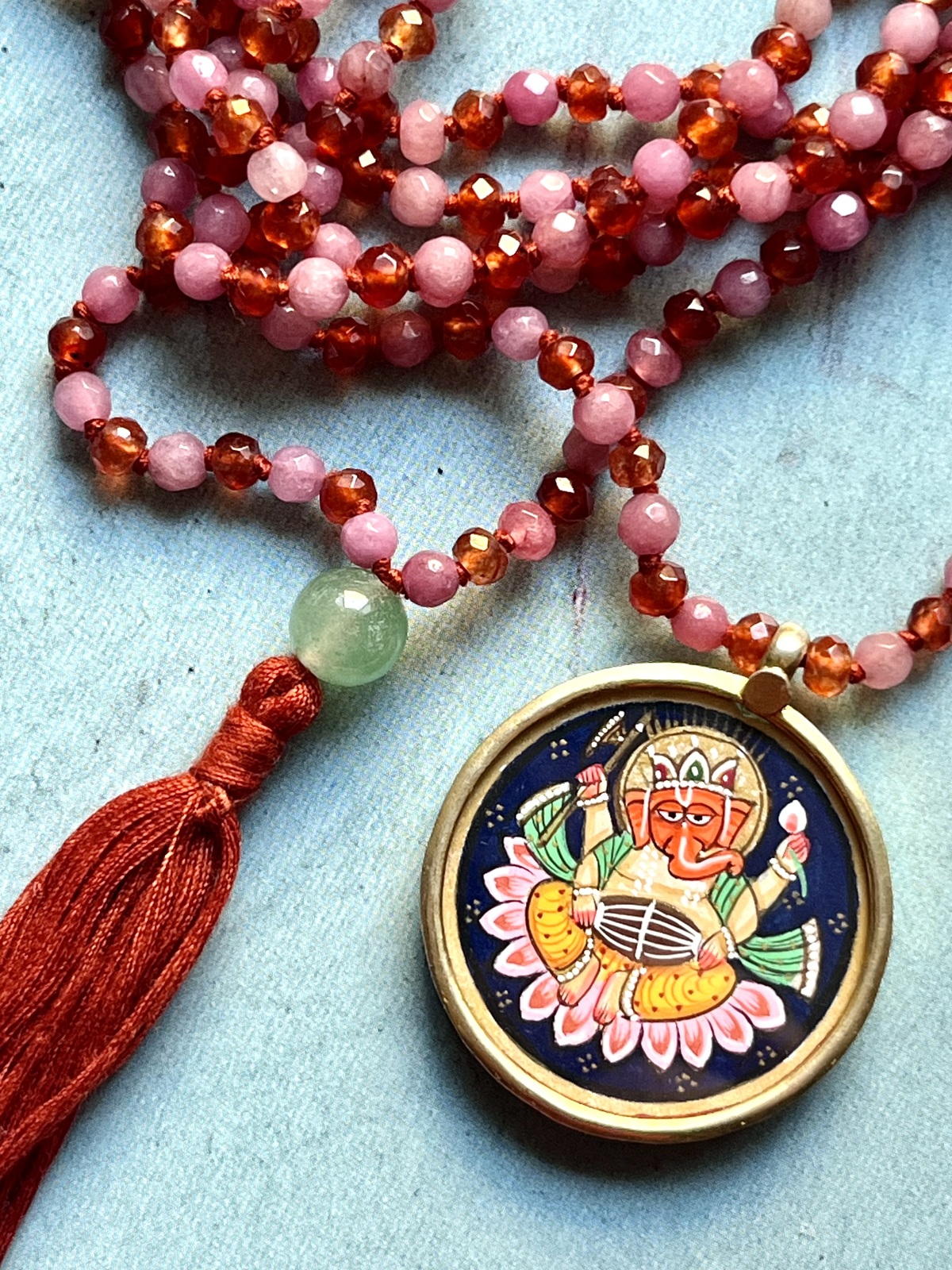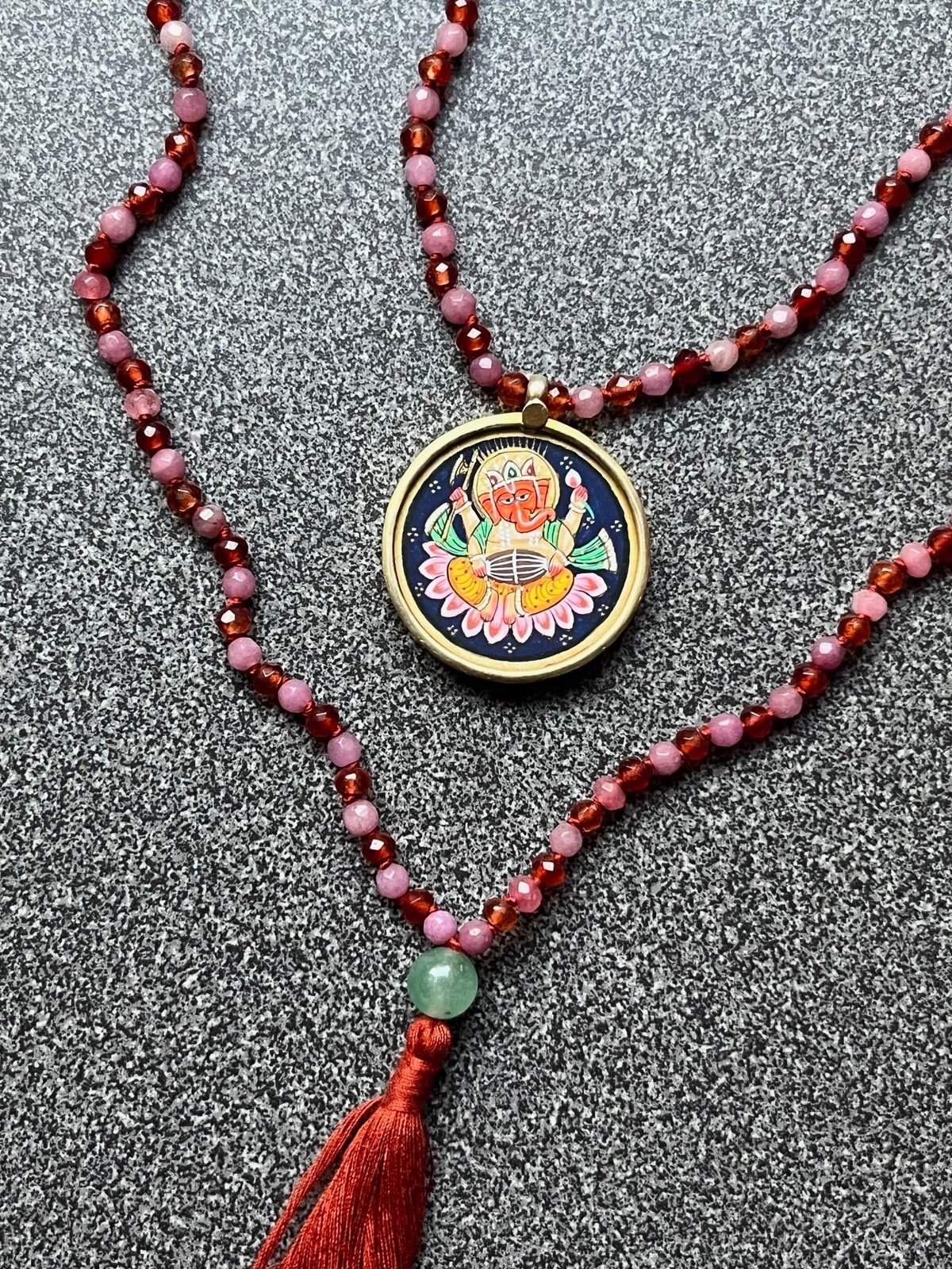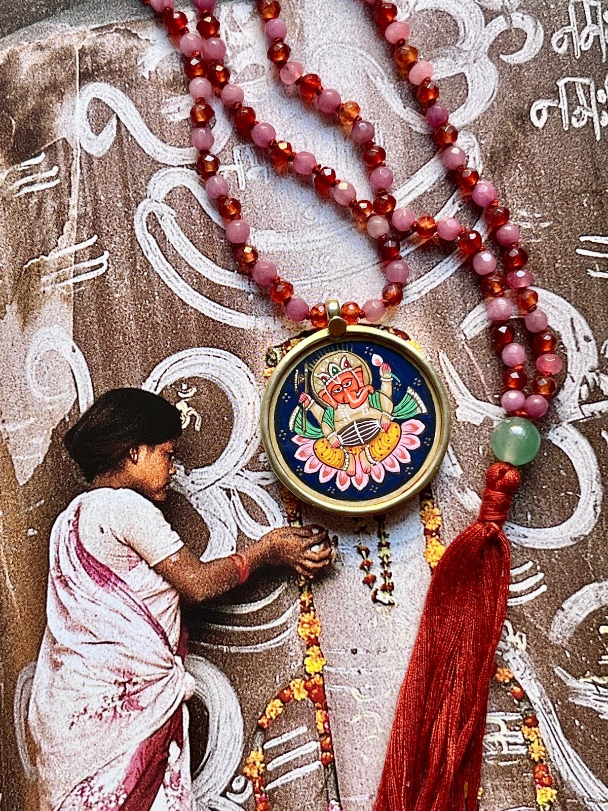Each necklace is unique, blending vibrant bead colors and intricate miniature painting to reflect the colors of India, masterful handmade craftsmanship, and sacred devotion. A wearable talisman of guidance, elegance, and spiritual presence.