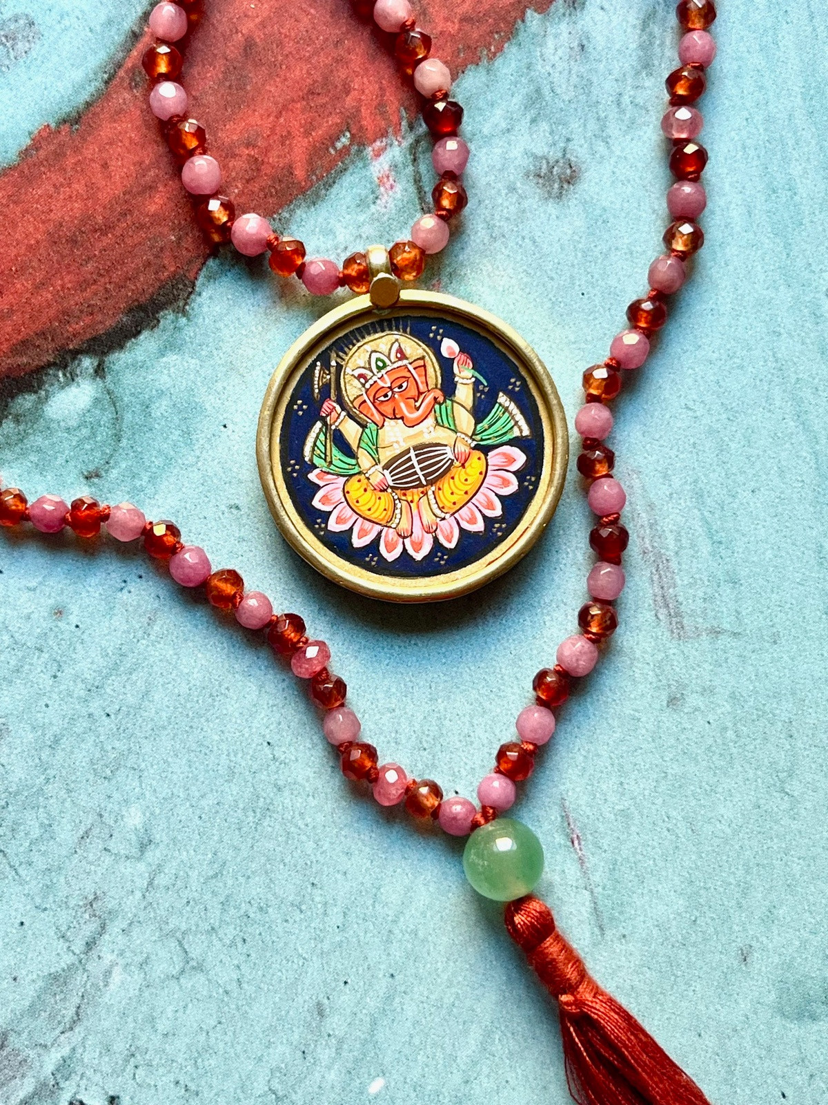The centerpiece is a larger gold plated silver pendant enclosing a finely hand-painted miniature of Lord Ganesh, created with the traditional Rajasthani miniature technique and protected under glass. Depicted with his elephant head, blessing hand, and modak, Ganesh symbolizes wisdom, prosperity, and the removal of obstacles, captured in exquisite detail.