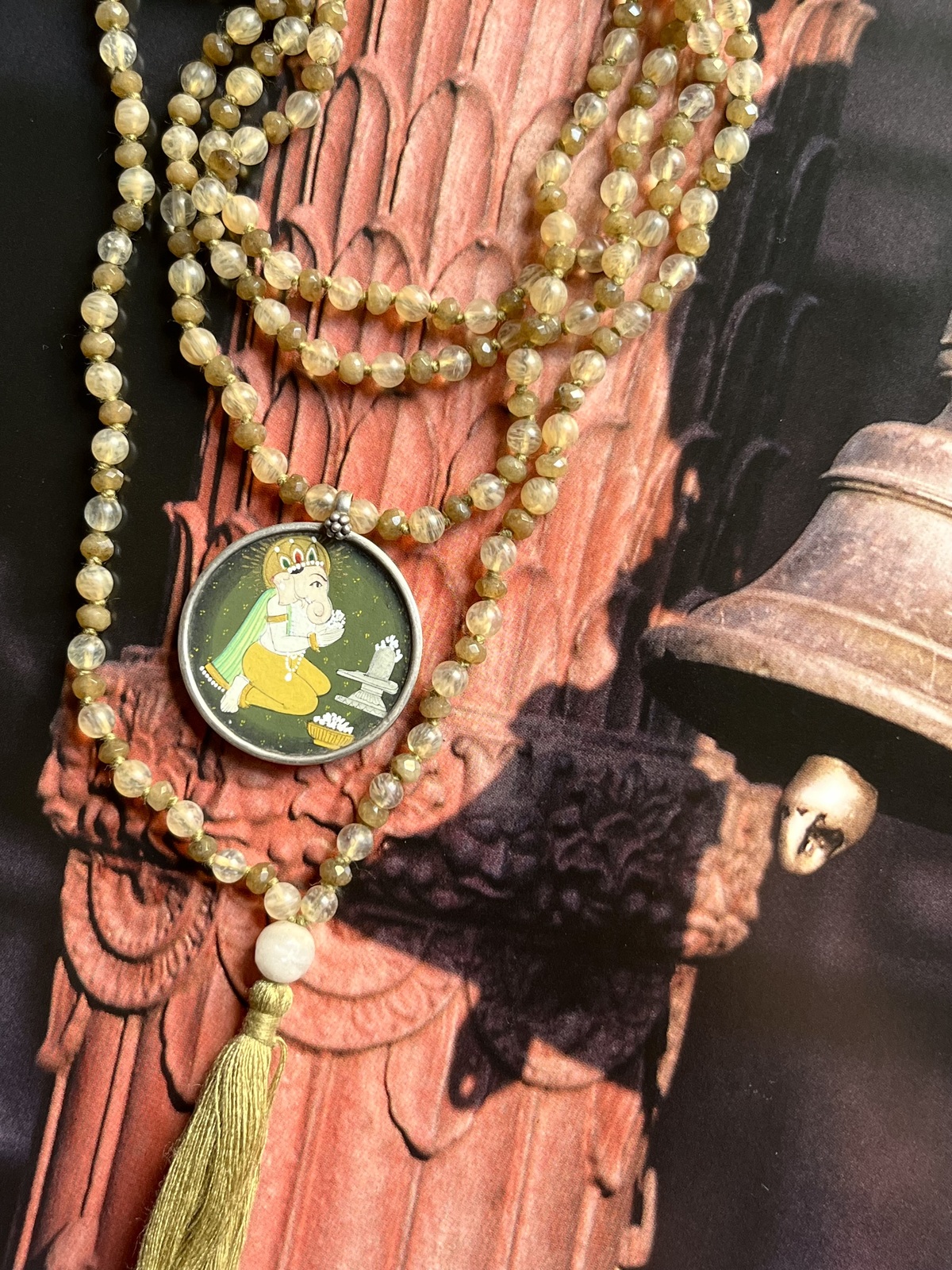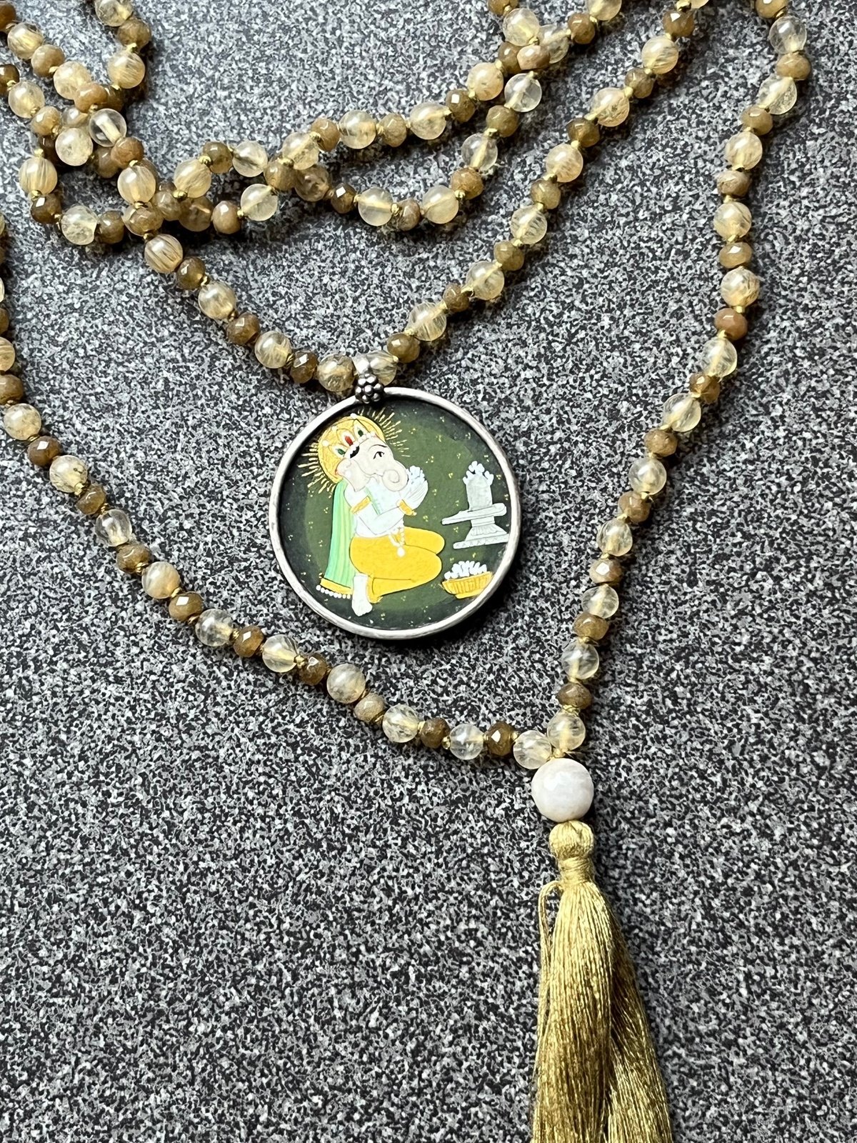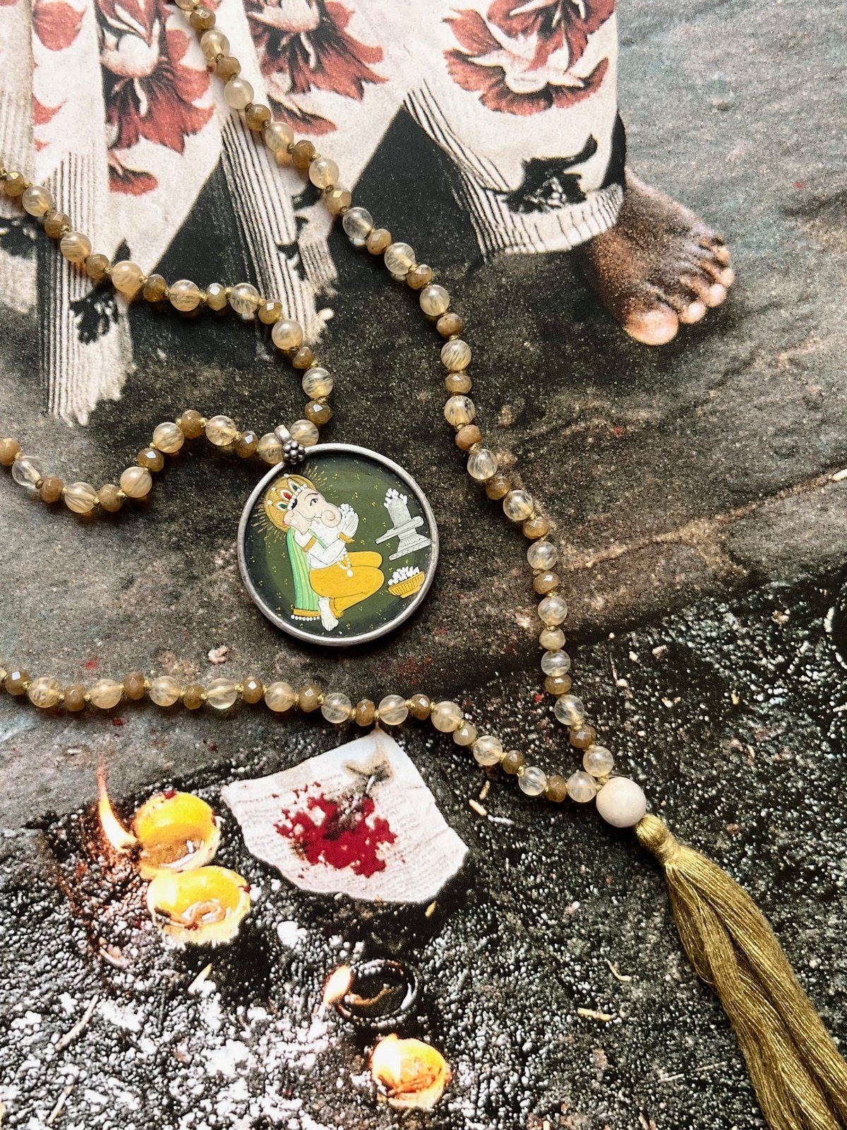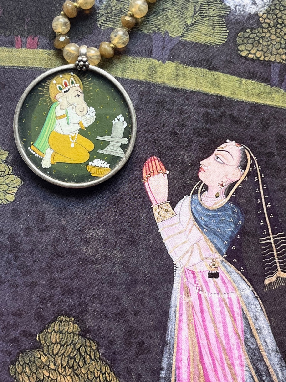 Each necklace is unique, blending vibrant bead colors and intricate miniature painting to reflect the colors of India, masterful handmade craftsmanship, and sacred devotion. A wearable talisman of guidance, elegance, and spiritual presence.