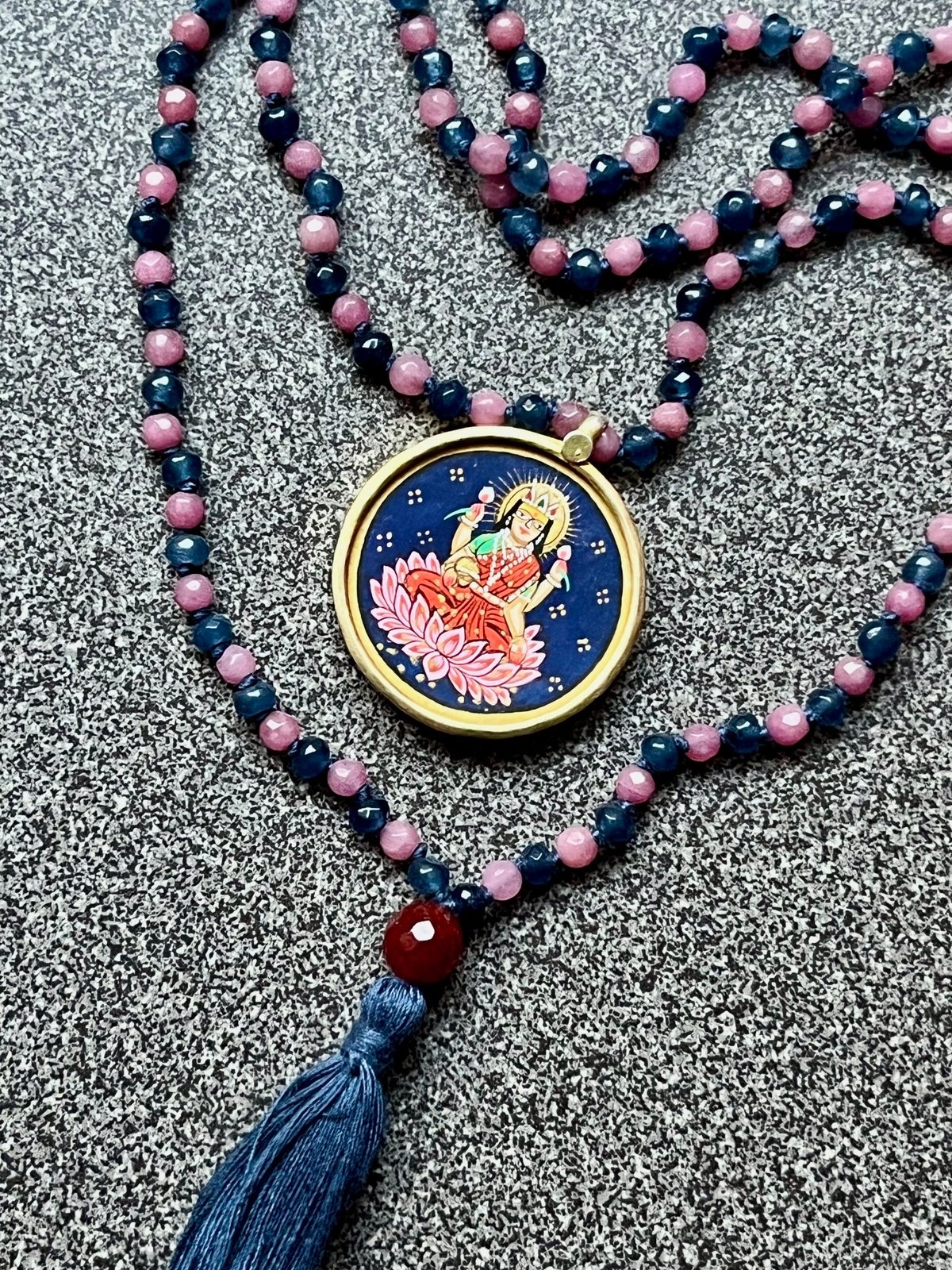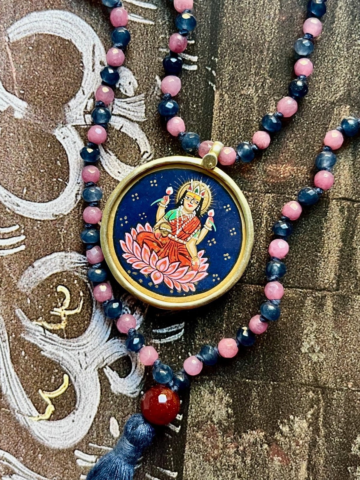 At the heart of this design shines a larger gold plated silver pendant, enclosing a finely hand-painted miniature of Goddess Laxmi, created using the traditional Rajasthani miniature technique and safeguarded under glass. With her lotus flowers and cascade of coins, Laxmi radiates prosperity, beauty, and divine blessings in exquisite detail.