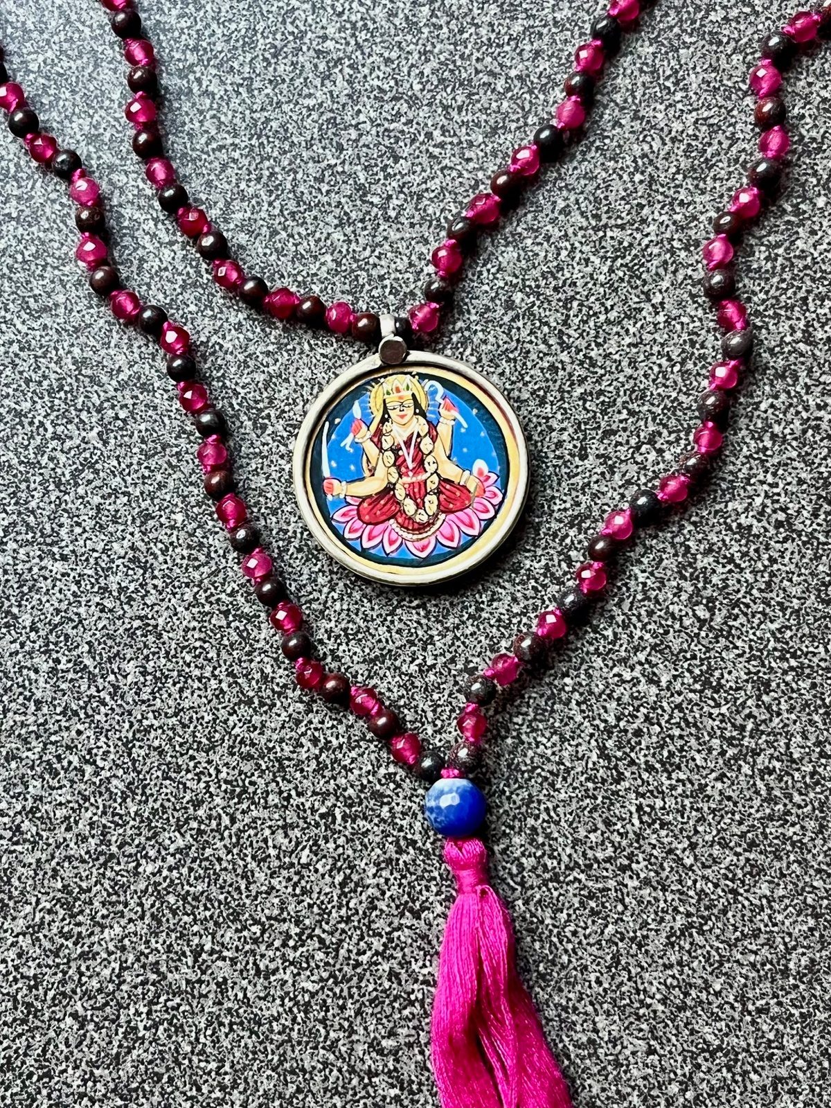 At the heart of this design shines a larger silver pendant, enclosing a finely hand-painted miniature of Goddess Laxmi, created using the traditional Rajasthani miniature technique and safeguarded under glass. With her lotus flowers and cascade of coins, Laxmi radiates prosperity, beauty, and divine blessings in exquisite detail.