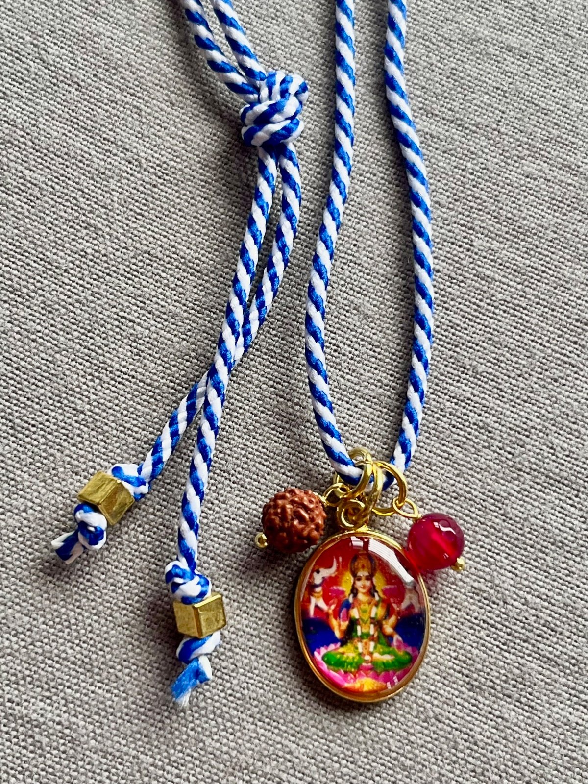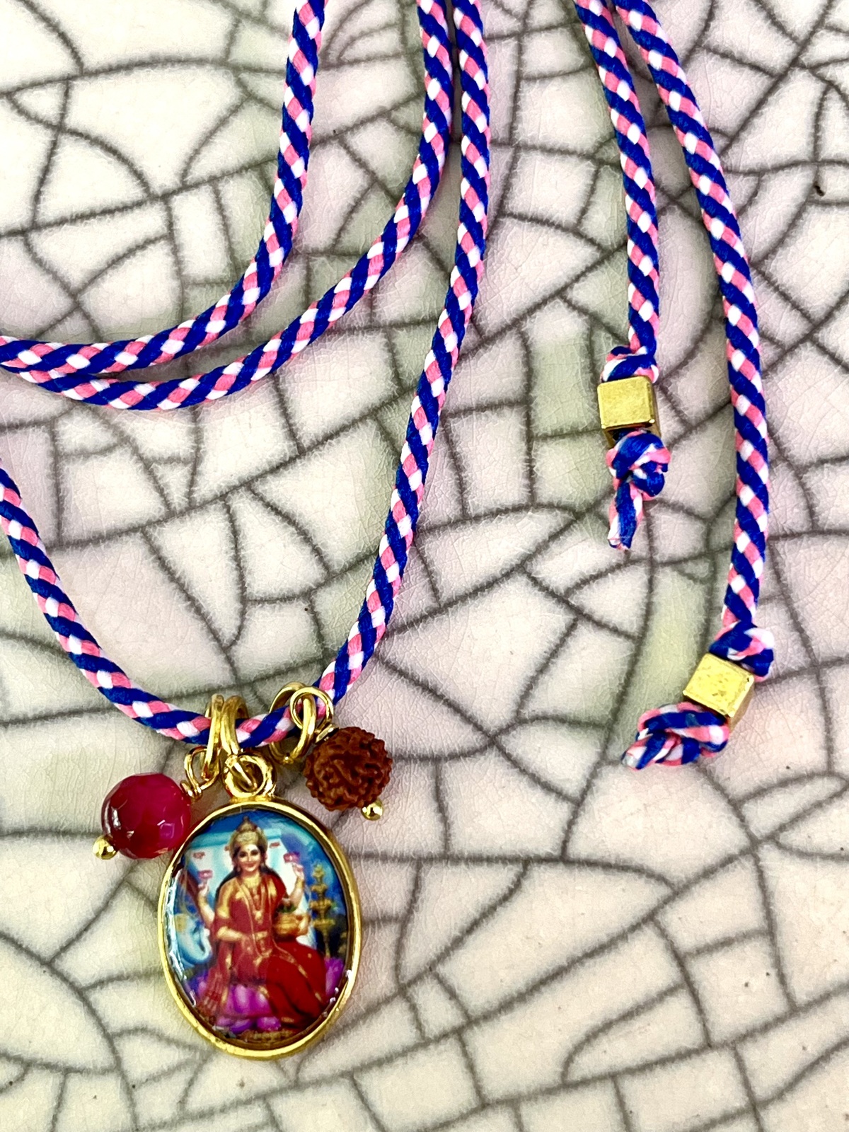 This playful and vibrant necklace combines spirituality with style. Strung on a colorful pop cord, it features a vintage golden pendant adorned with a Goddess Laxmi figure. Lakshmi, the goddess of wealth, prosperity, and abundance, brings positive energy, good fortune, and auspicious blessings to the wearer. A tiny rudraksha seed and a contrasting agate bead add subtle texture and energy, perfectly complementing the pendant’s colors.