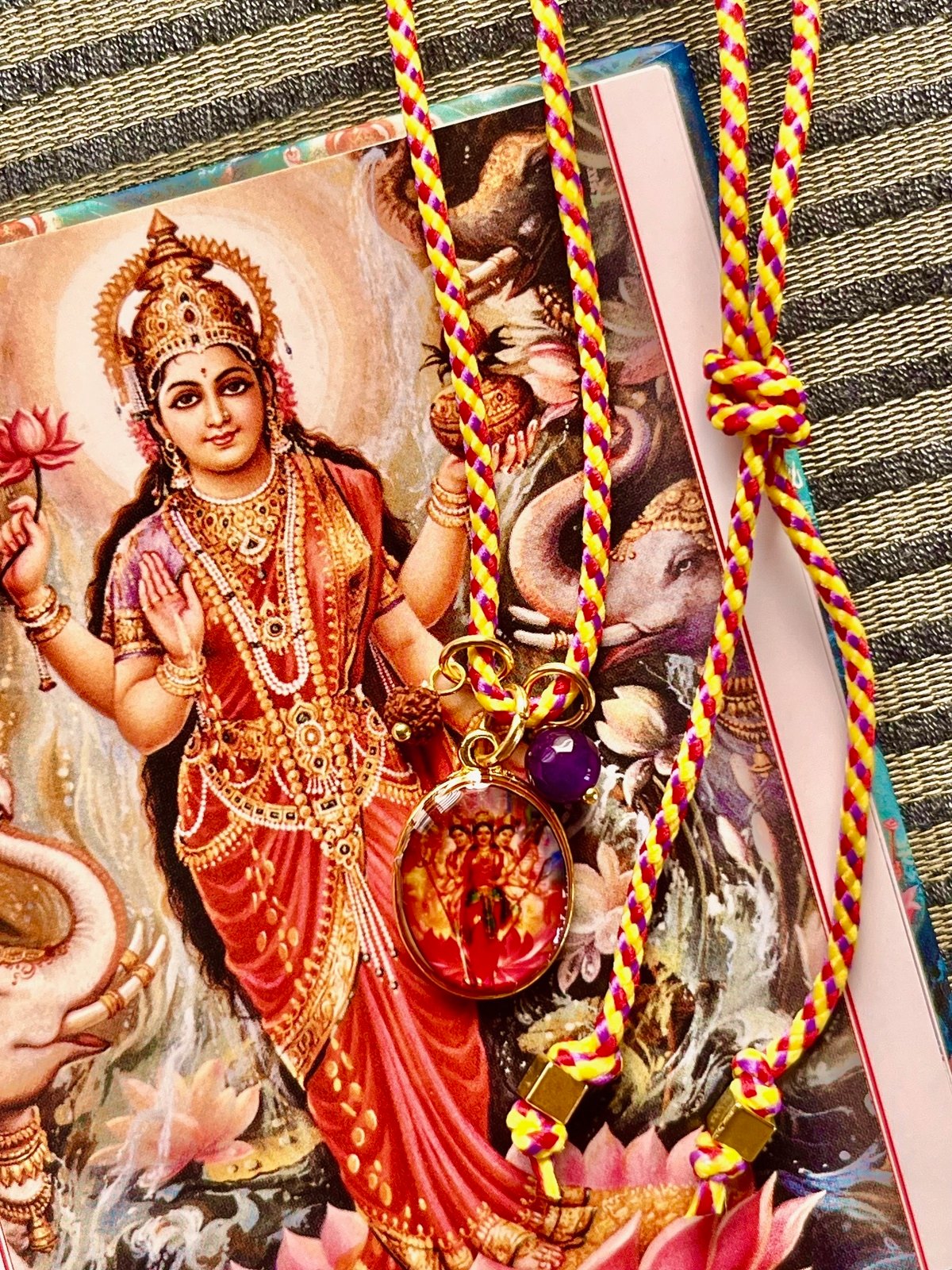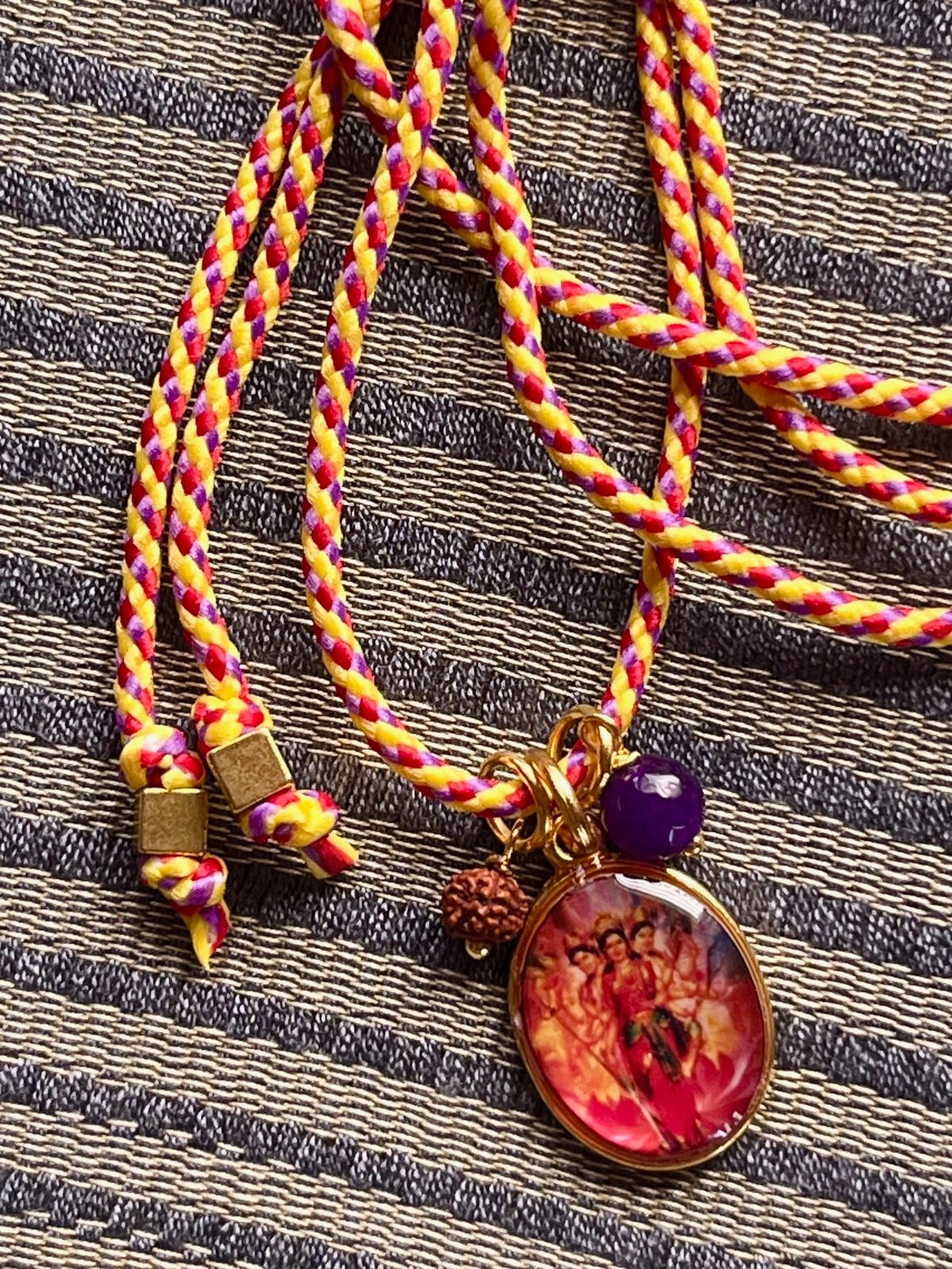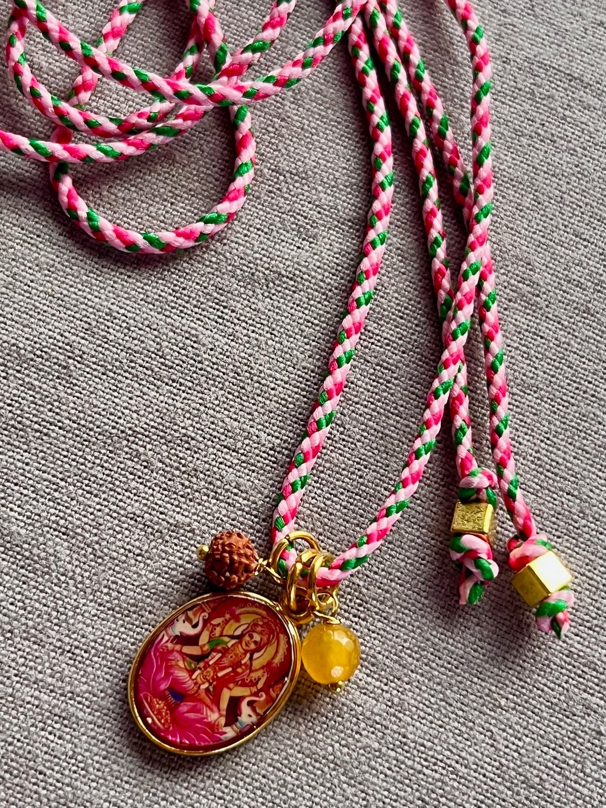 Designed with an adjustable cord, the necklace can be tied to your preferred length, making it versatile, lightweight, and easy to wear. Its cheerful colors, spiritual details, and charming design make it a fun, eye-catching accessory that effortlessly blends devotion, prosperity, and everyday fashion.