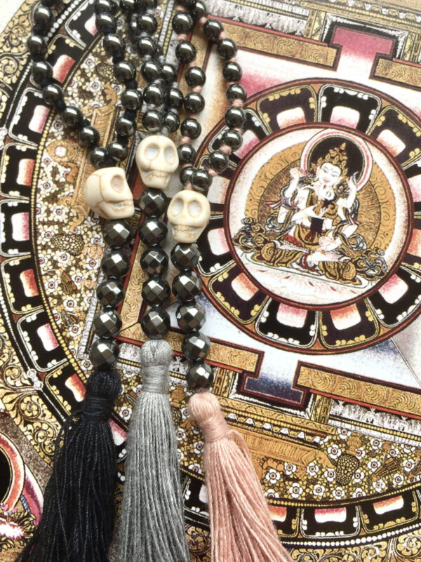 This striking necklace is hand-knotted with shimmering round gunmetal hematite beads, each tied with colorful threads that add a playful yet elegant touch. A soft tassel completes the design, while at its heart rests a finely carved skull in white howlite, accented by five larger faceted hematite beads for extra brilliance.