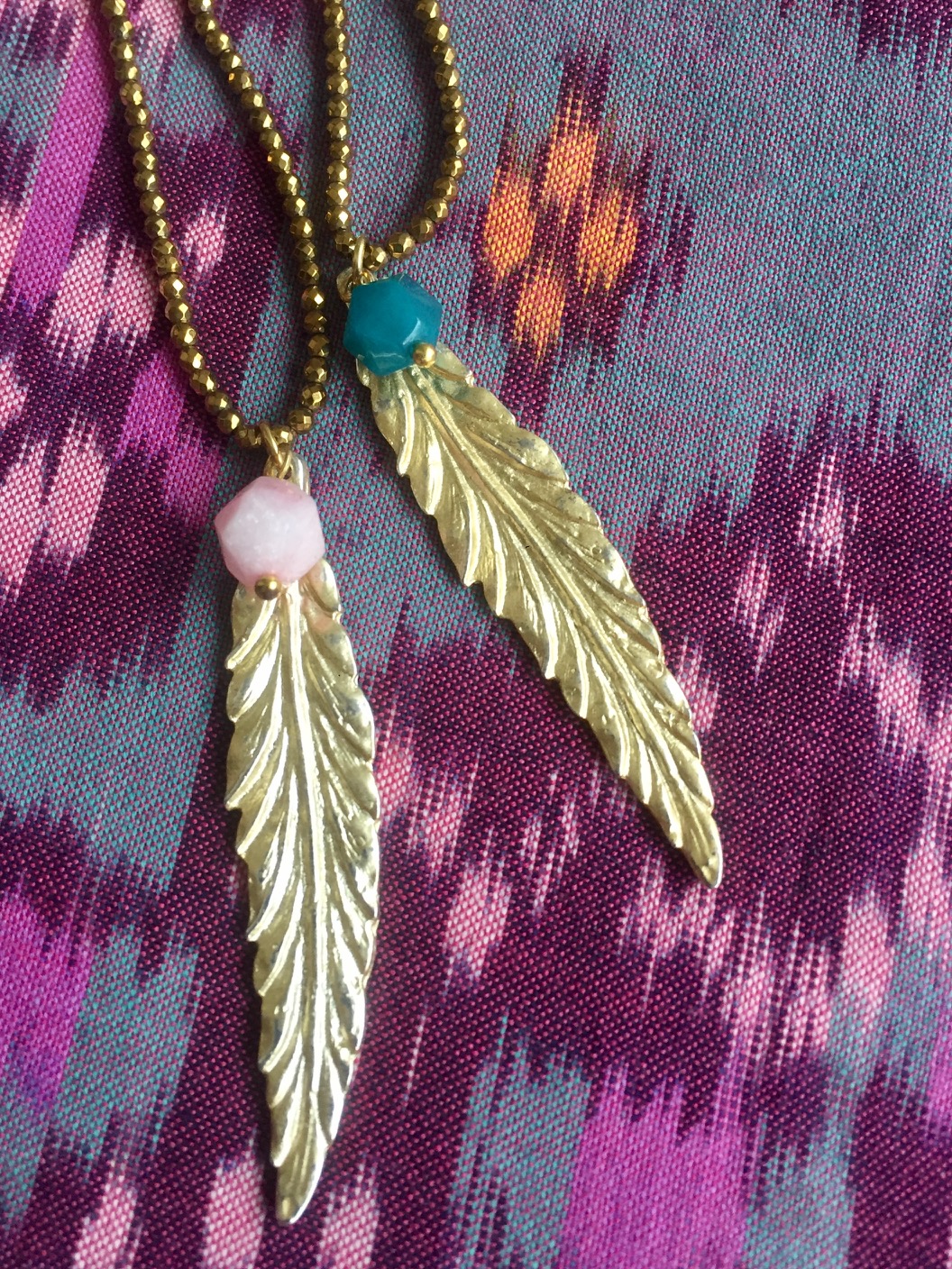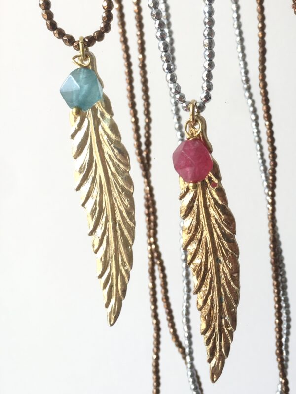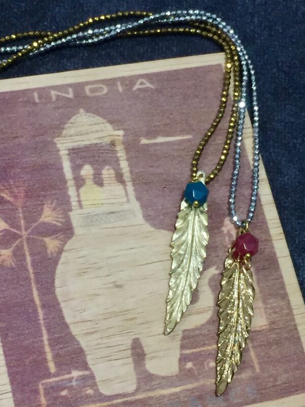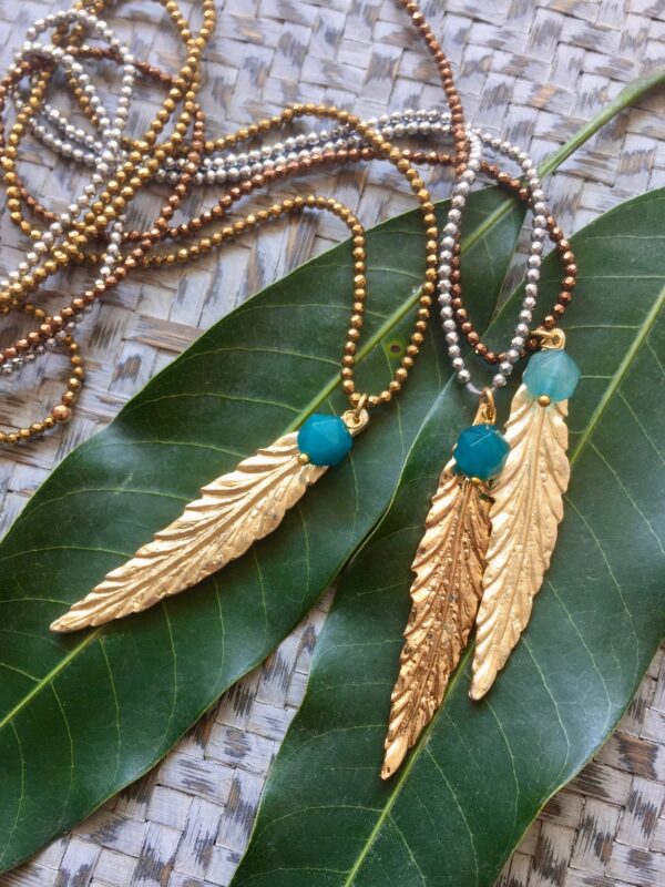 The Mango Love Necklace features a golden mango leaf pendant paired with a vibrant, asymmetrically cut agate bead, suspended on a strand of tiny faceted hematite beads. Each variation shimmers in a unique tone—silver, golden, or bronze—bringing its own subtle energy to the design.