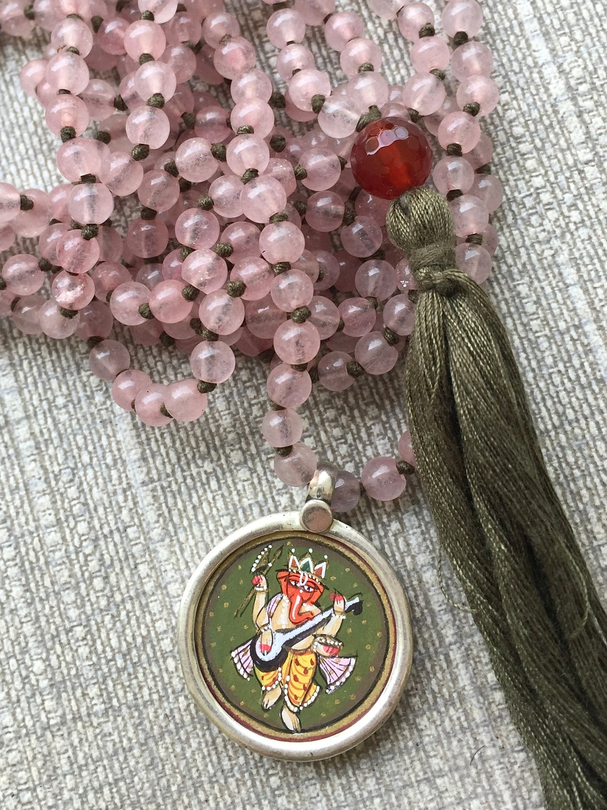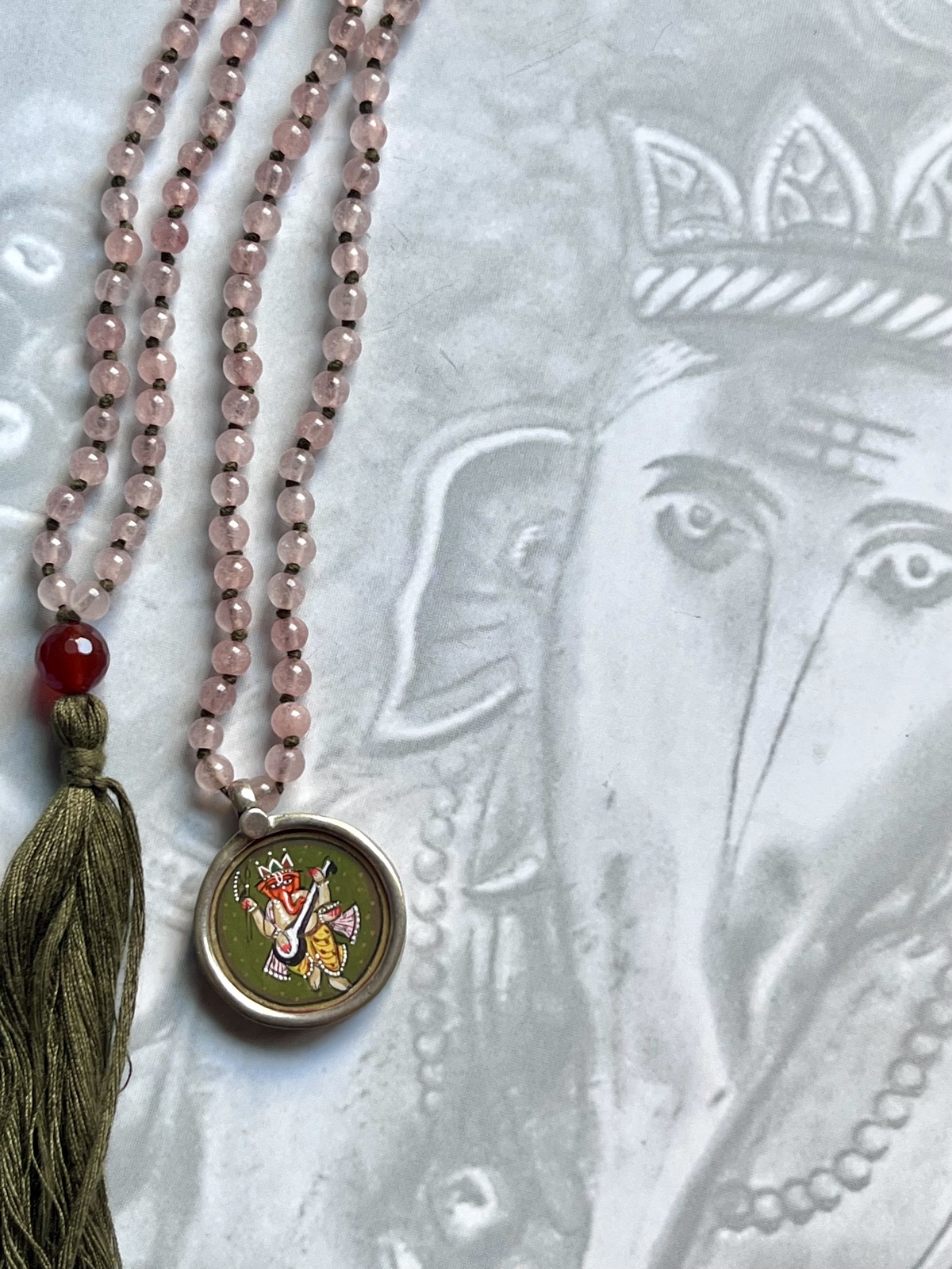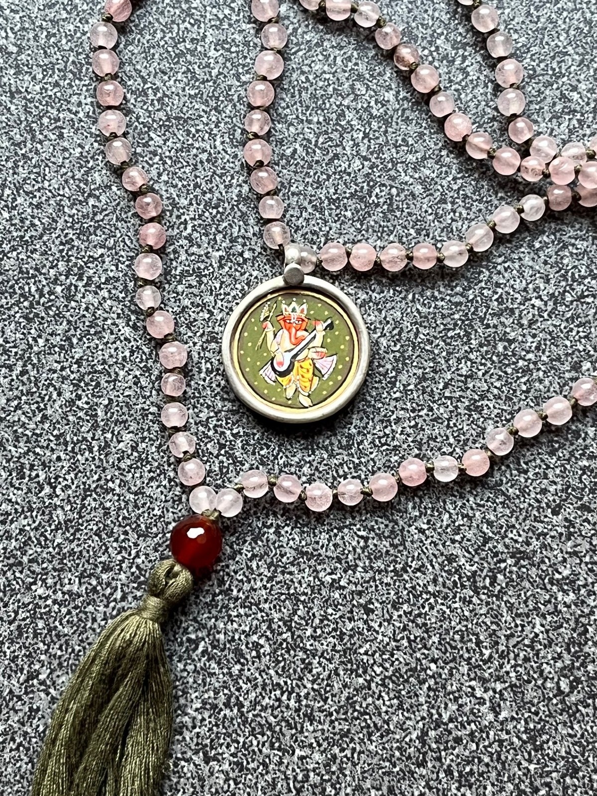 A joyful fusion of art, devotion, and style, this necklace features colorful beads, each hand-knotted with a contrasting thread, creating a lively rhythm of hues that drapes in a double mala loop with a tassel detail. The pendant is a dainty silver setting enclosing a hand-painted miniature of Lord Ganesh, rendered with the traditional Rajasthani miniature technique and sealed under glass. With his elephant head, blessing hand, and beloved modak, Ganesh symbolizes wisdom, prosperity, and the removal of obstacles. Each piece is singular in its colors and miniature painting, a celebration of handmade craftsmanship, Indian tradition, and personal devotion.