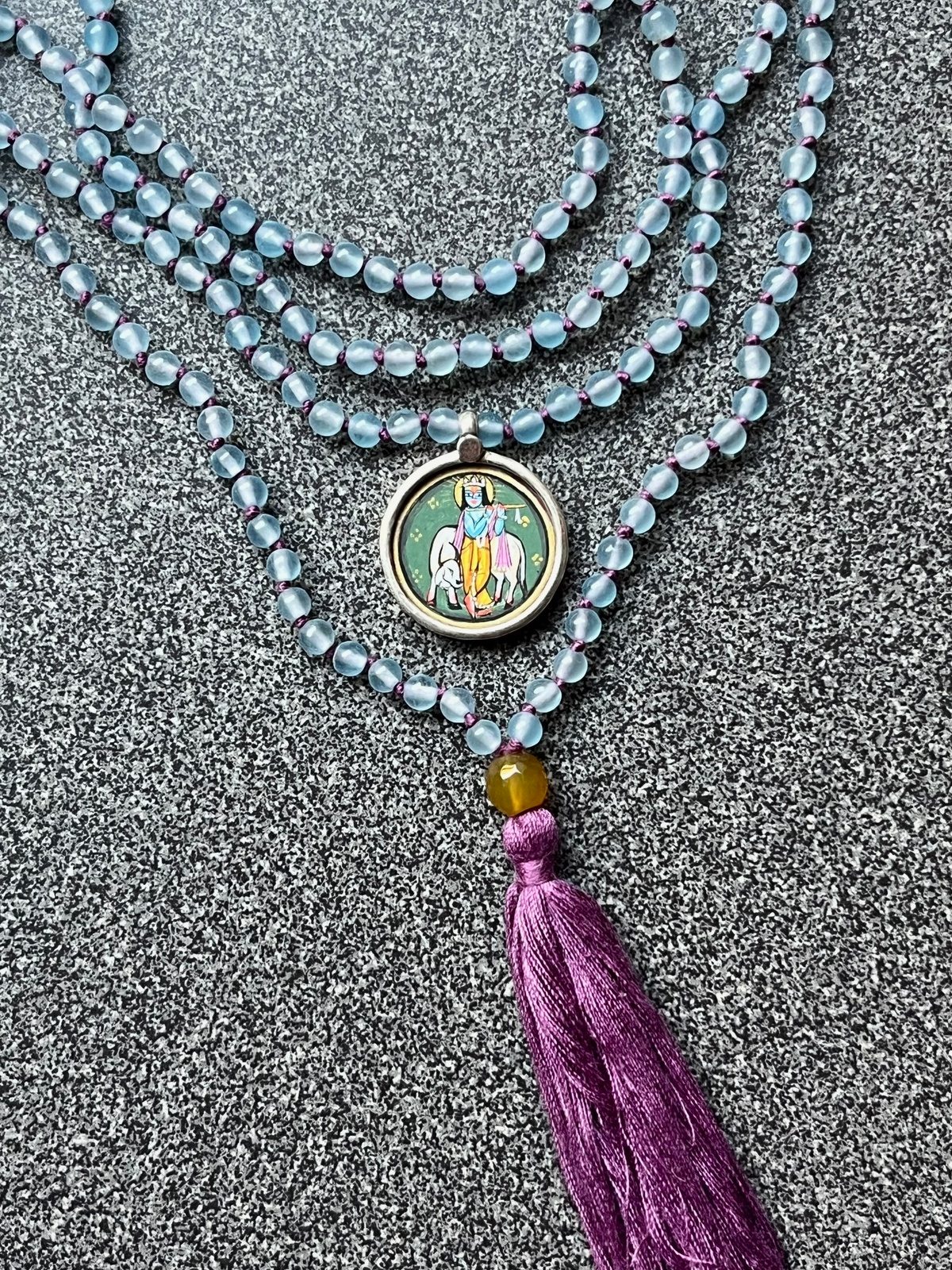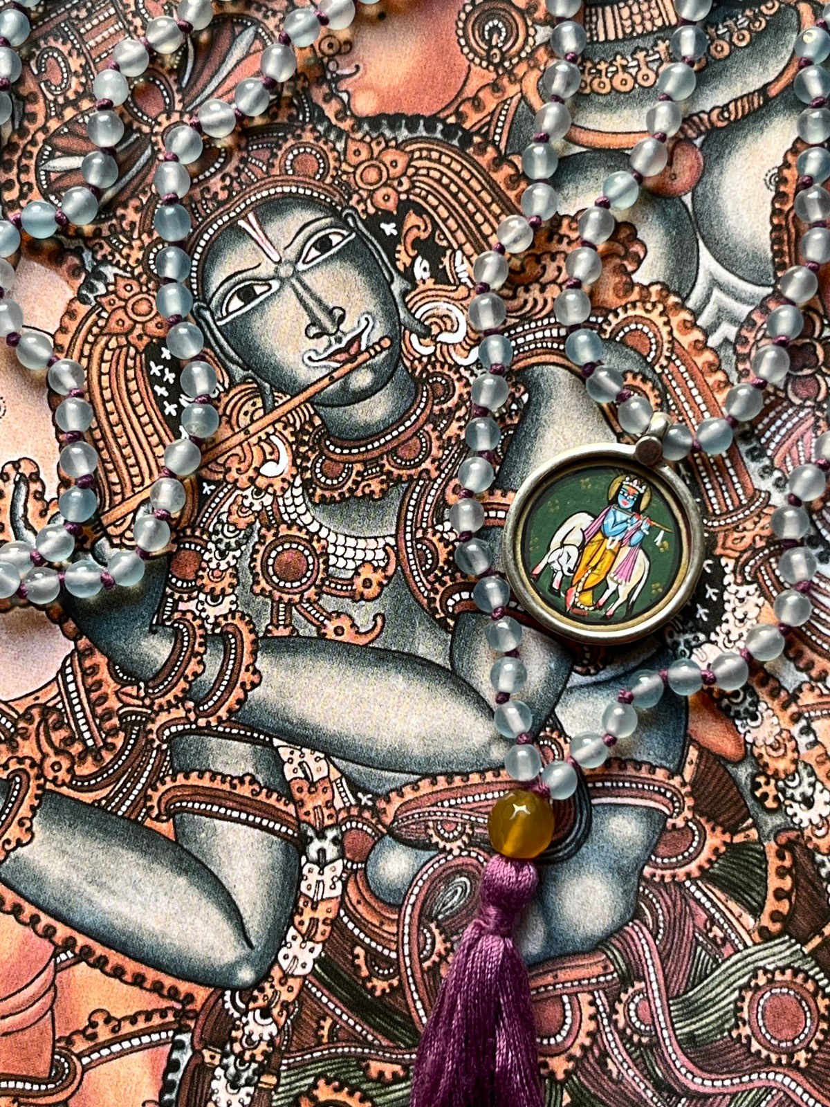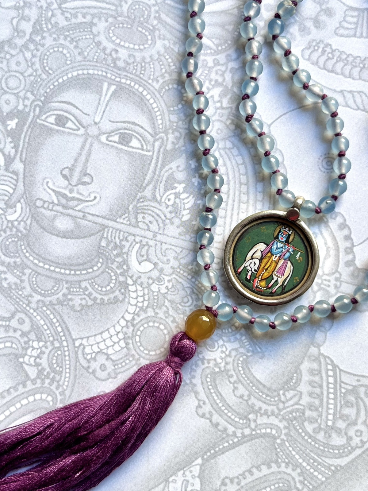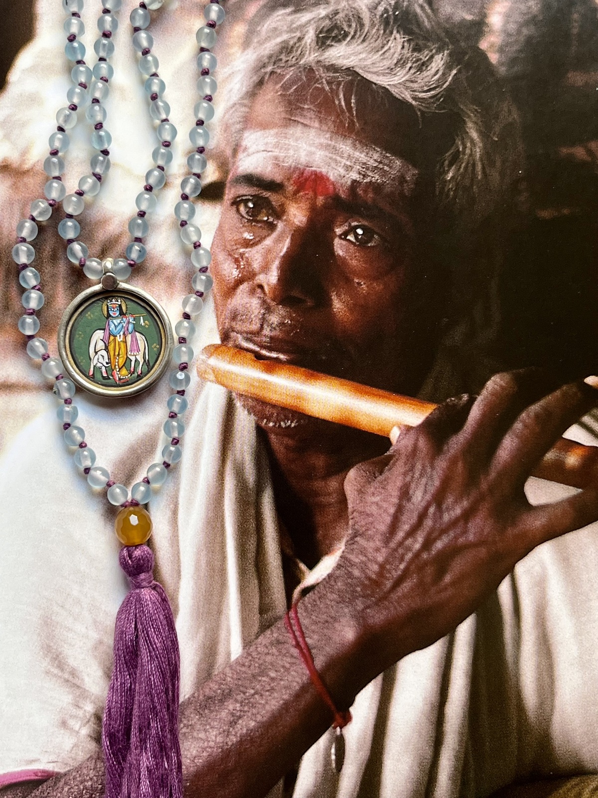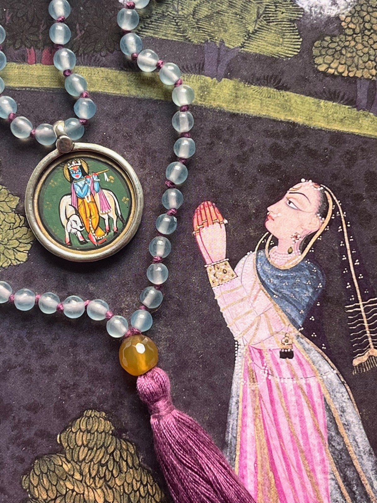 A joyful expression of love and devotion, this necklace is crafted with colorful beads, each hand-knotted with a contrasting thread, designed to drape in a graceful double mala loop with a playful tassel for a modern layered look. Its centerpiece is a delicate silver pendant enclosing a hand-painted miniature of Lord Krishna, created with the traditional miniature painting techniques of Rajasthan and safeguarded beneath glass. Shown with his flute, peacock feather, and serene presence, Krishna embodies divine love, joy, and spiritual harmony. Each necklace is one of a kind, uniting the colors of India, artisanal craftsmanship, and sacred tradition into a wearable talisman of beauty and devotion.