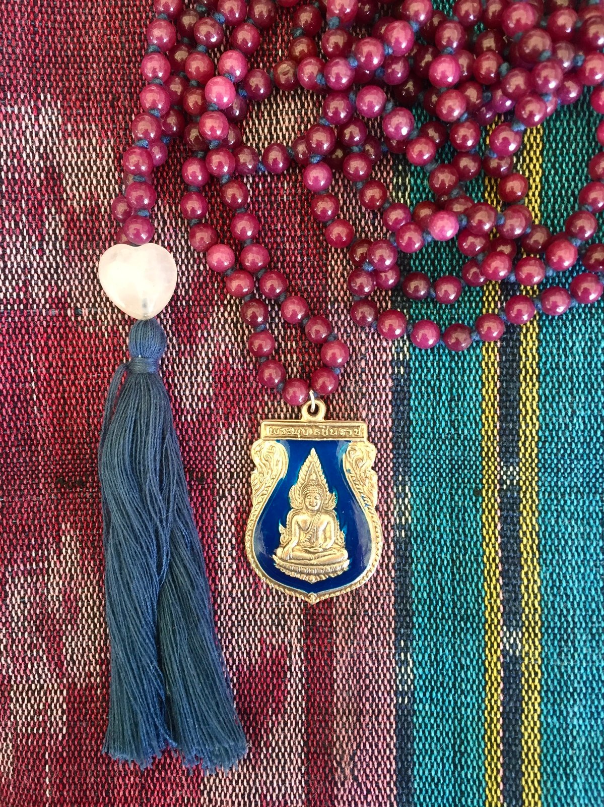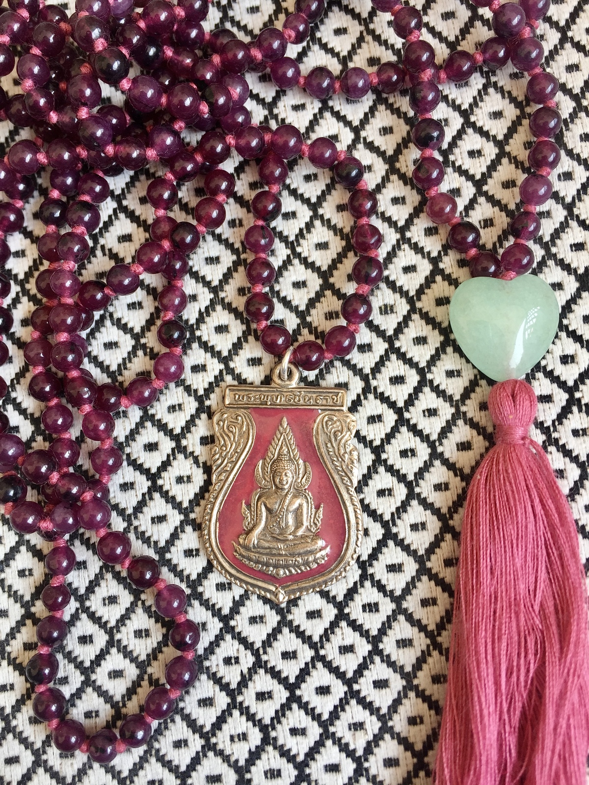 On the opposite end of the amulet, a soft tassel flows gracefully from a heart-shaped semiprecious stone guru bead, completing the piece with a touch of tenderness and meaning.