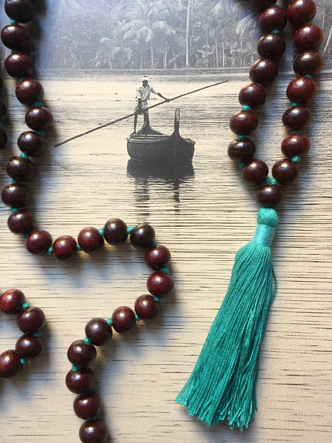 This sacred mala is hand-knotted in Rishikesh, the spiritual gateway to the Himalayas in India, and carries a blessing from the holy waters of the Ganges River. Made from smooth rosewood beads, its warm reddish-brown tones embody grounding, protection, and compassion. In Indian tradition, rosewood (often called red sandalwood) is valued for calming the mind, opening the heart, and deepening meditation. Its subtle earthy energy encourages patience, strength, and a gentle connection to the divine.