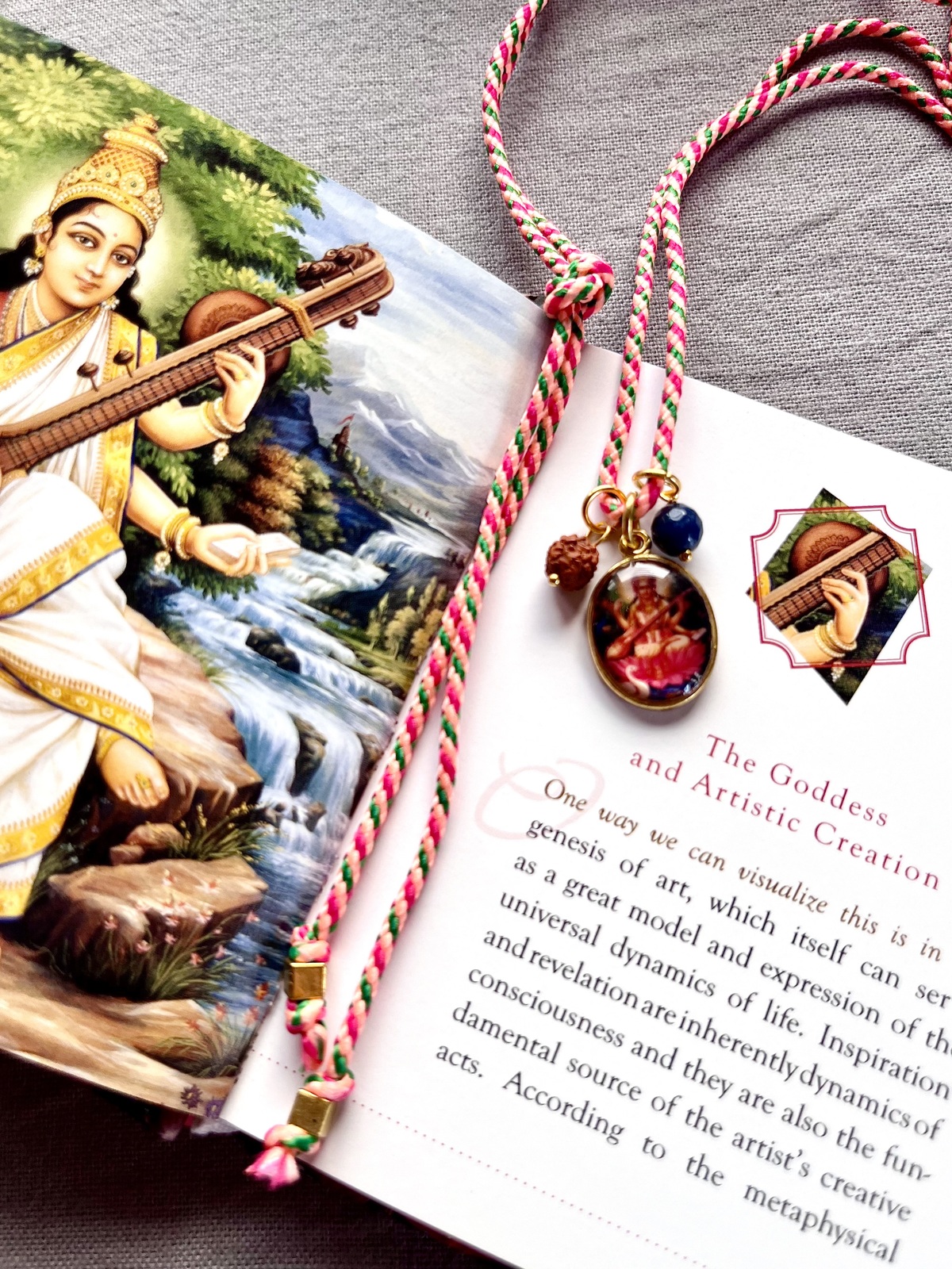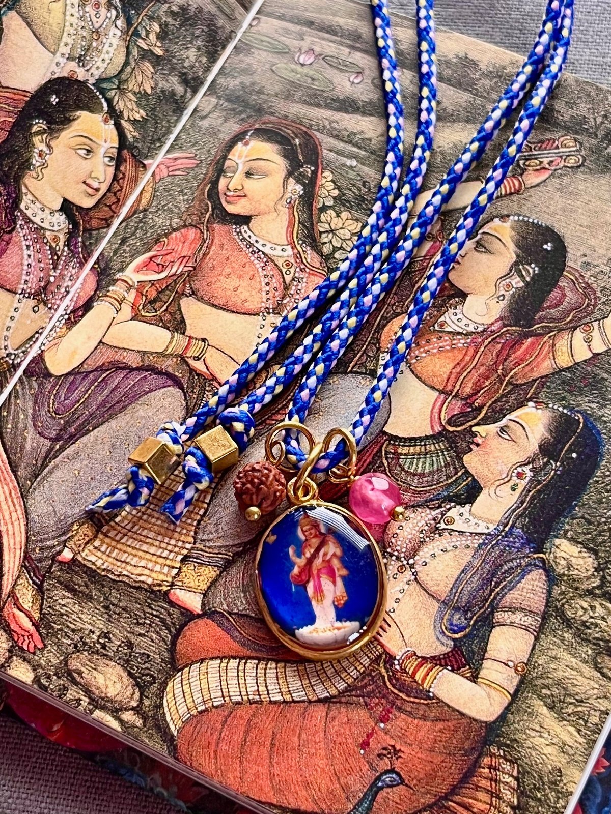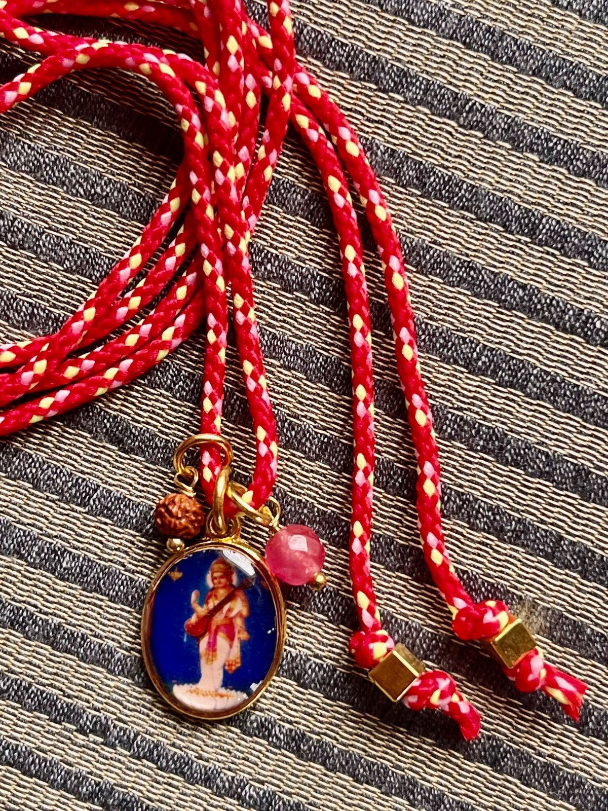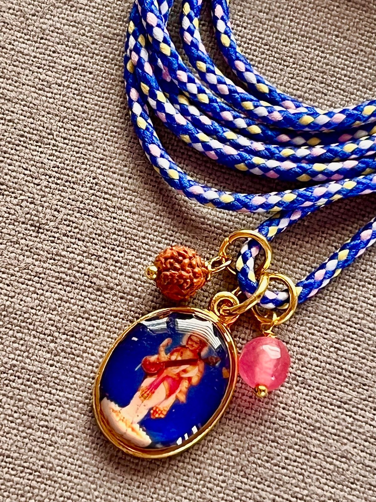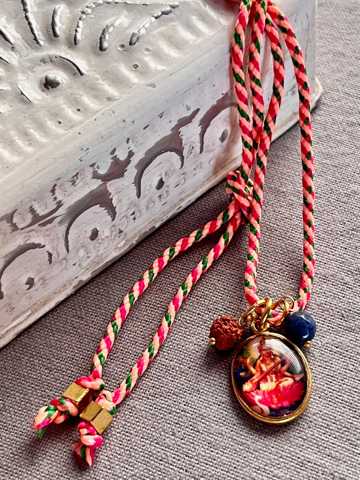 Designed with an adjustable cord, the necklace can be tied to your preferred length, making it versatile, lightweight, and easy to wear. Its cheerful colors, spiritual details, and charming design make it a fun, eye-catching accessory that effortlessly blends devotion, inspiration, and everyday fashion.