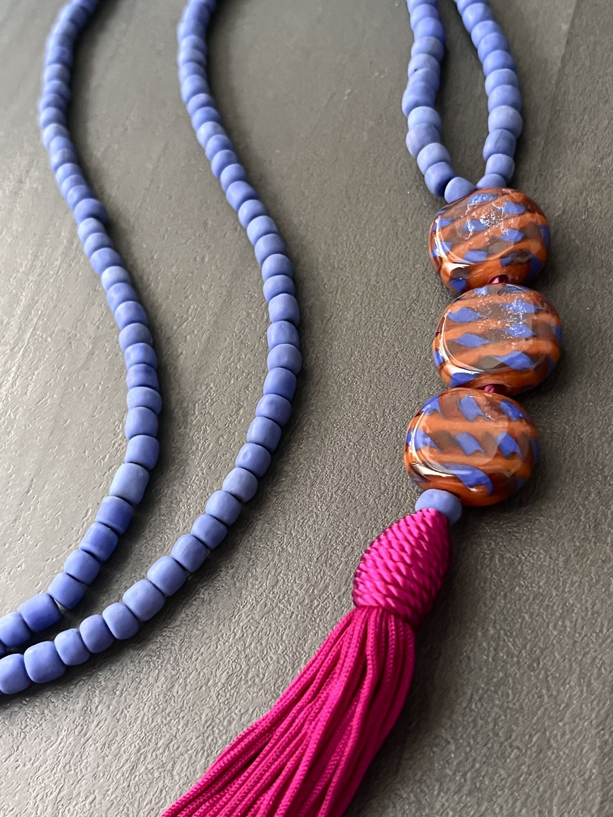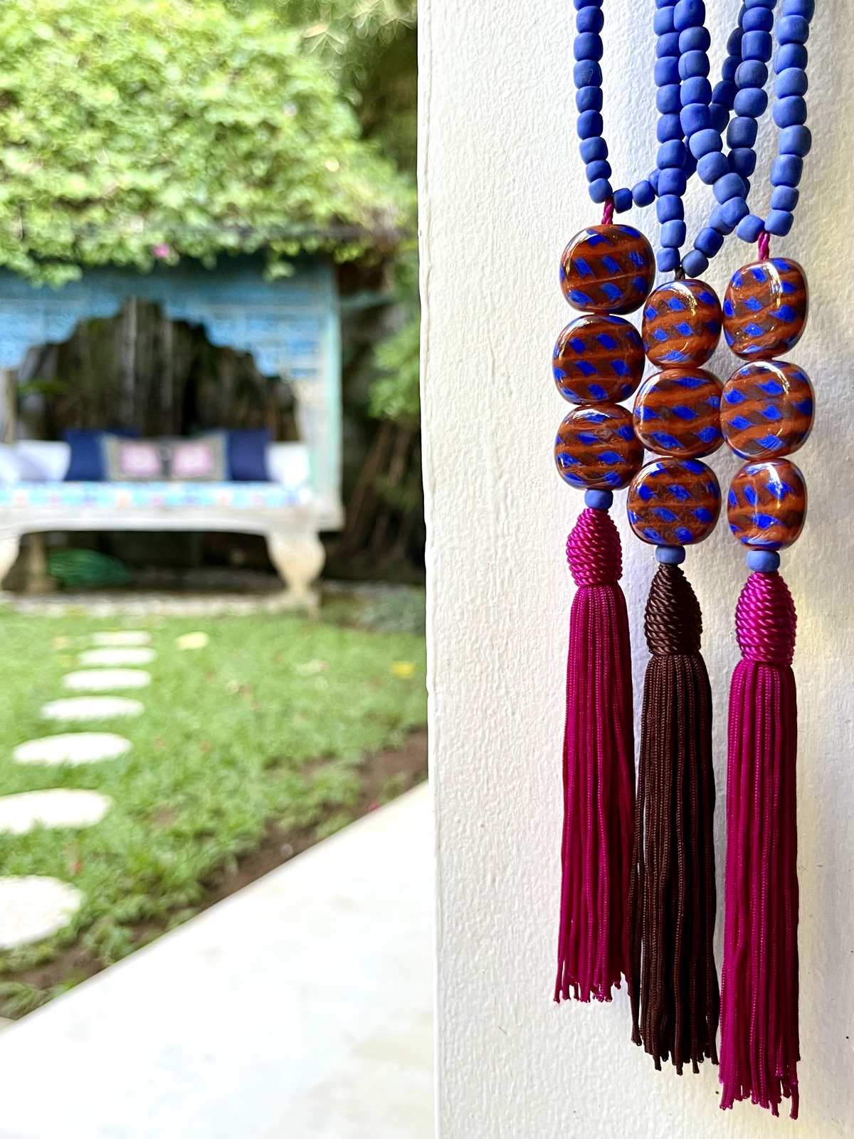 At its heart, the necklace features three larger Javanese glass beads with a glossy finish and a vibrant three-color motif, perfectly echoing the intricate hues of Balinese fabrics. The composition is completed by a luxurious viscose tassel, carefully color-matched to the central beads, adding graceful movement and a touch of artisanal refinement.