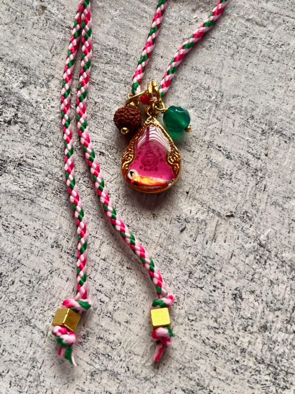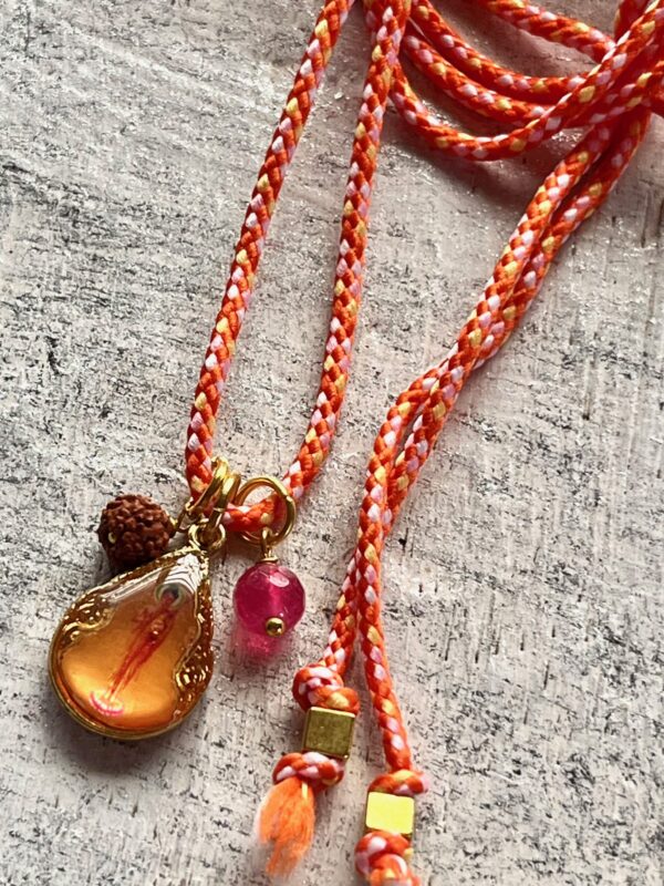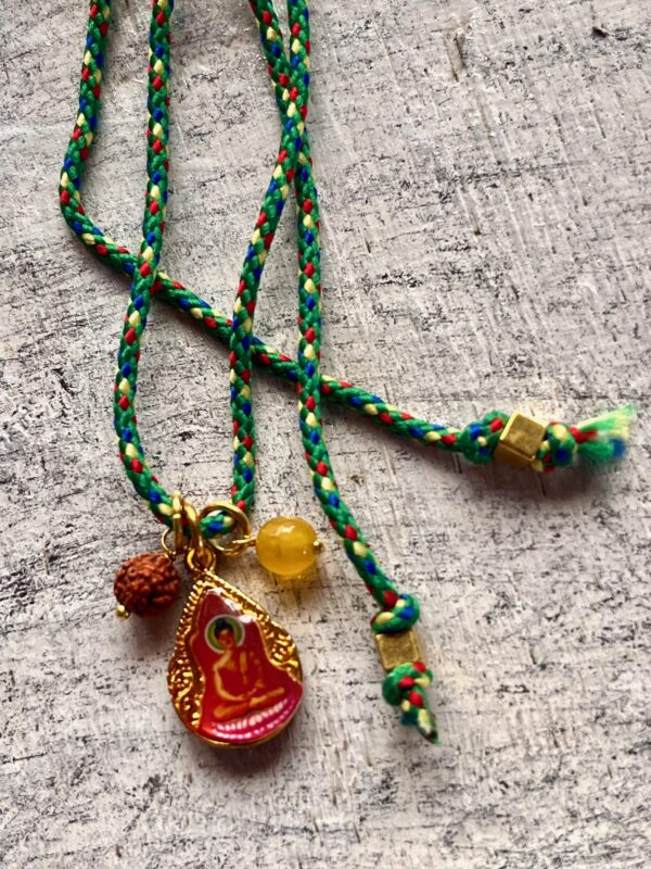 A tiny rudraksha seed and a matching agate bead add subtle texture and energy, perfectly balancing the pendant’s cheerful tones.
