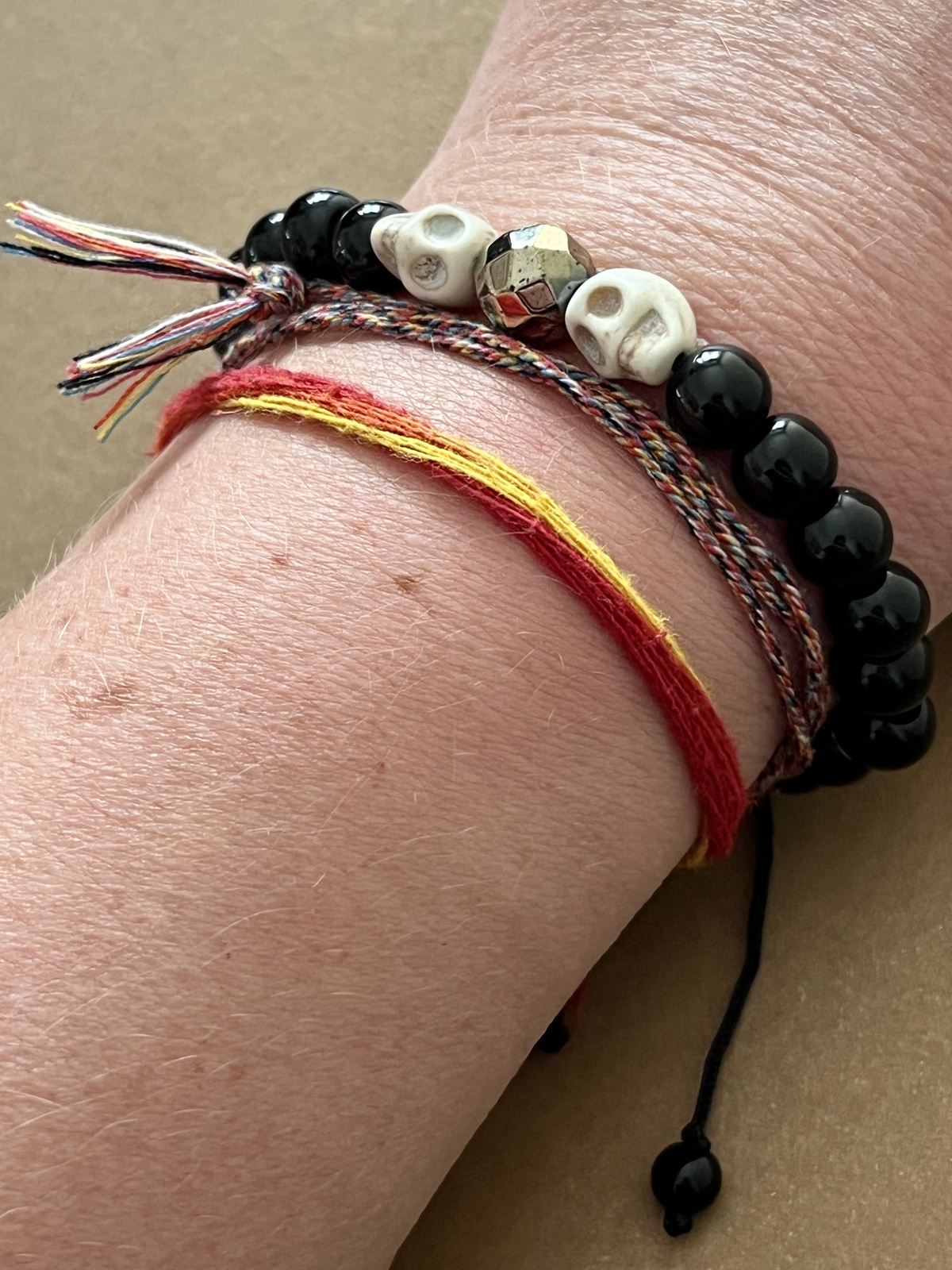 The Spark of Life Bracelet is a bold yet meaningful unisex piece, featuring 8 mm black onyx beads, two crisp white howlite skulls, and 10 mm faceted golden hematite beads that catch the light with a subtle sparkle. Designed with a sliding knot, it fits comfortably on the wrist.