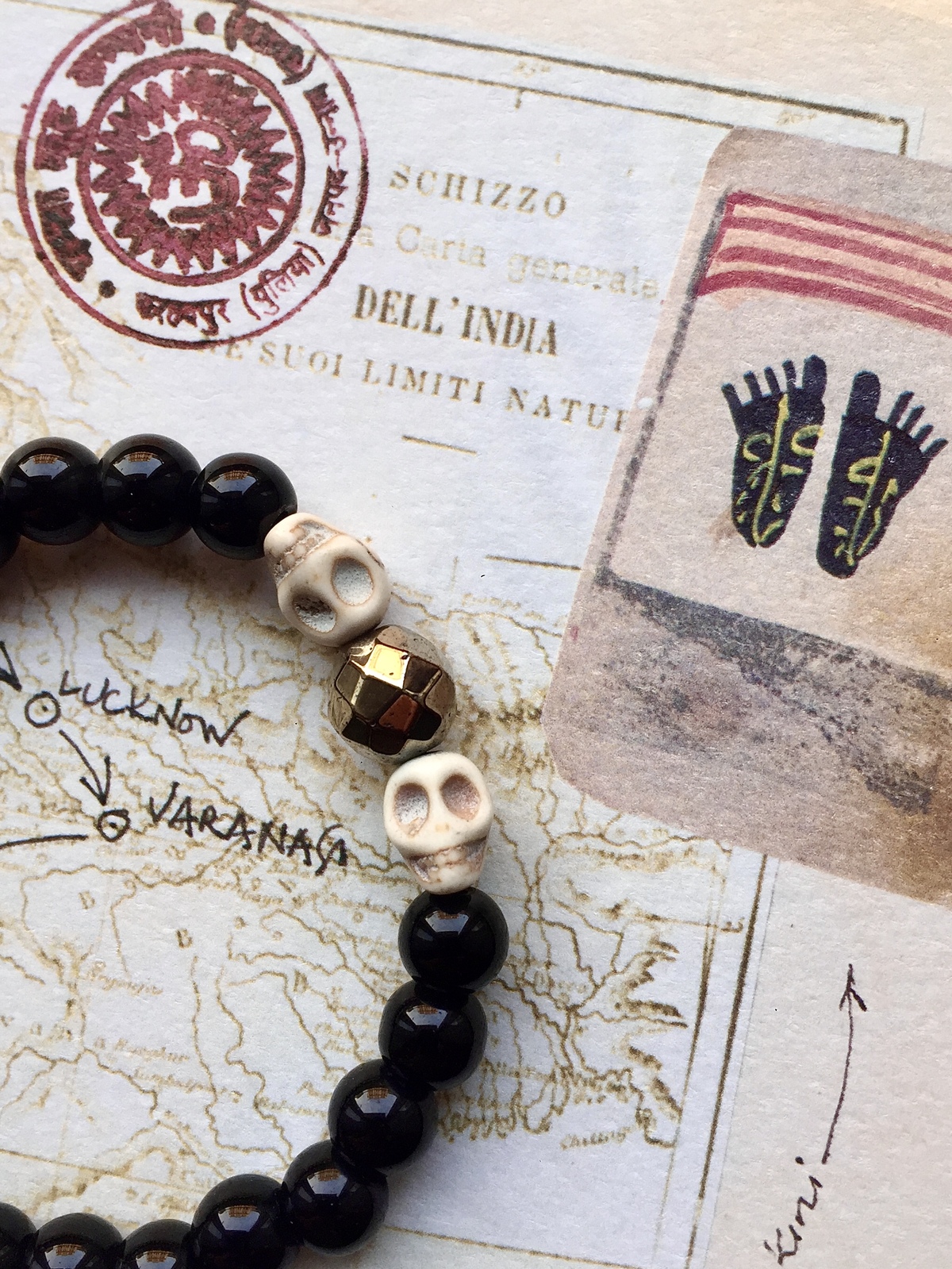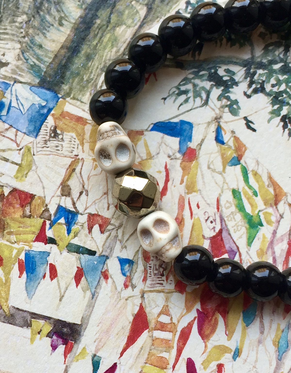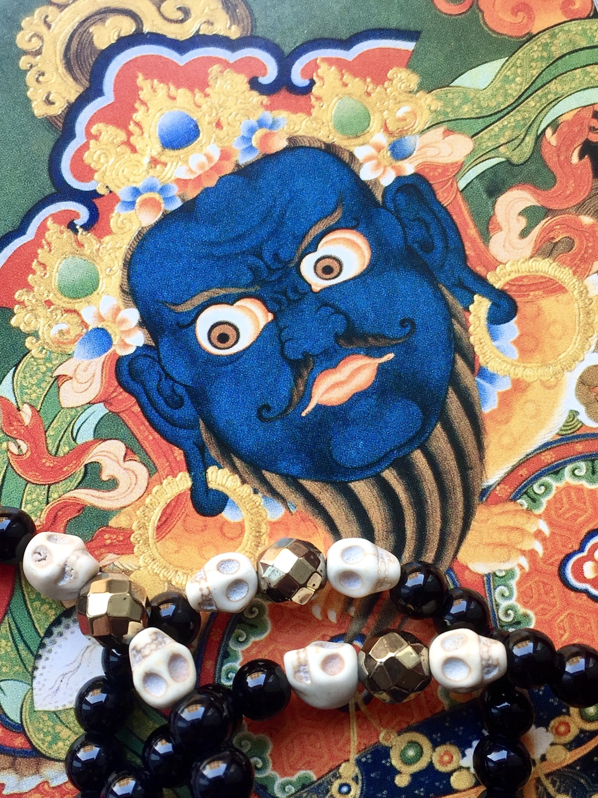 In Tibetan Buddhism, skulls symbolize impermanence and transformation, reminding us to live mindfully and embrace each moment. White howlite brings serenity and mental clarity, while black onyx grounds and protects. The golden hematite adds energy, strength, and a touch of modern shine, making this bracelet both a spiritual talisman and a striking fashion statement.