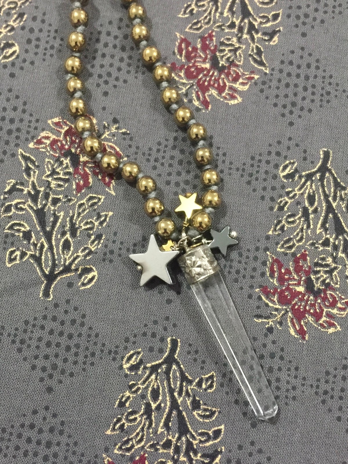 At its center shines a transparent rock crystal pendant, clear and luminous like frozen light, a symbol of clarity and cosmic energy. The pendant is adorned with four star accents in silver, golden, and gunmetal hematite, each of a different size, forming a delicate constellation that evokes harmony and celestial beauty.