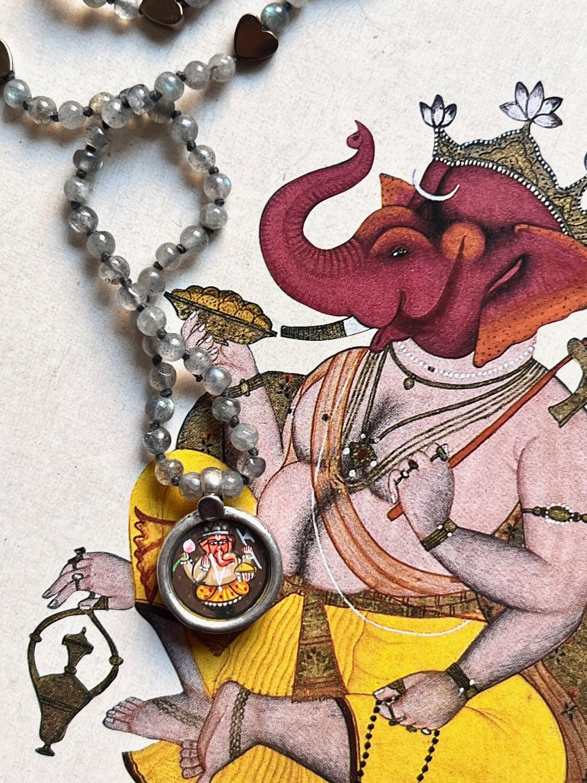 The centerpiece is a charming silver pendant, featuring a finely hand-painted miniature of Lord Ganesh, created using the traditional miniature painting techniques of Rajasthan. Enclosed under a protective glass dome, the miniature reveals exquisite detail, vibrant colors, and the benevolent presence of the remover of obstacles.