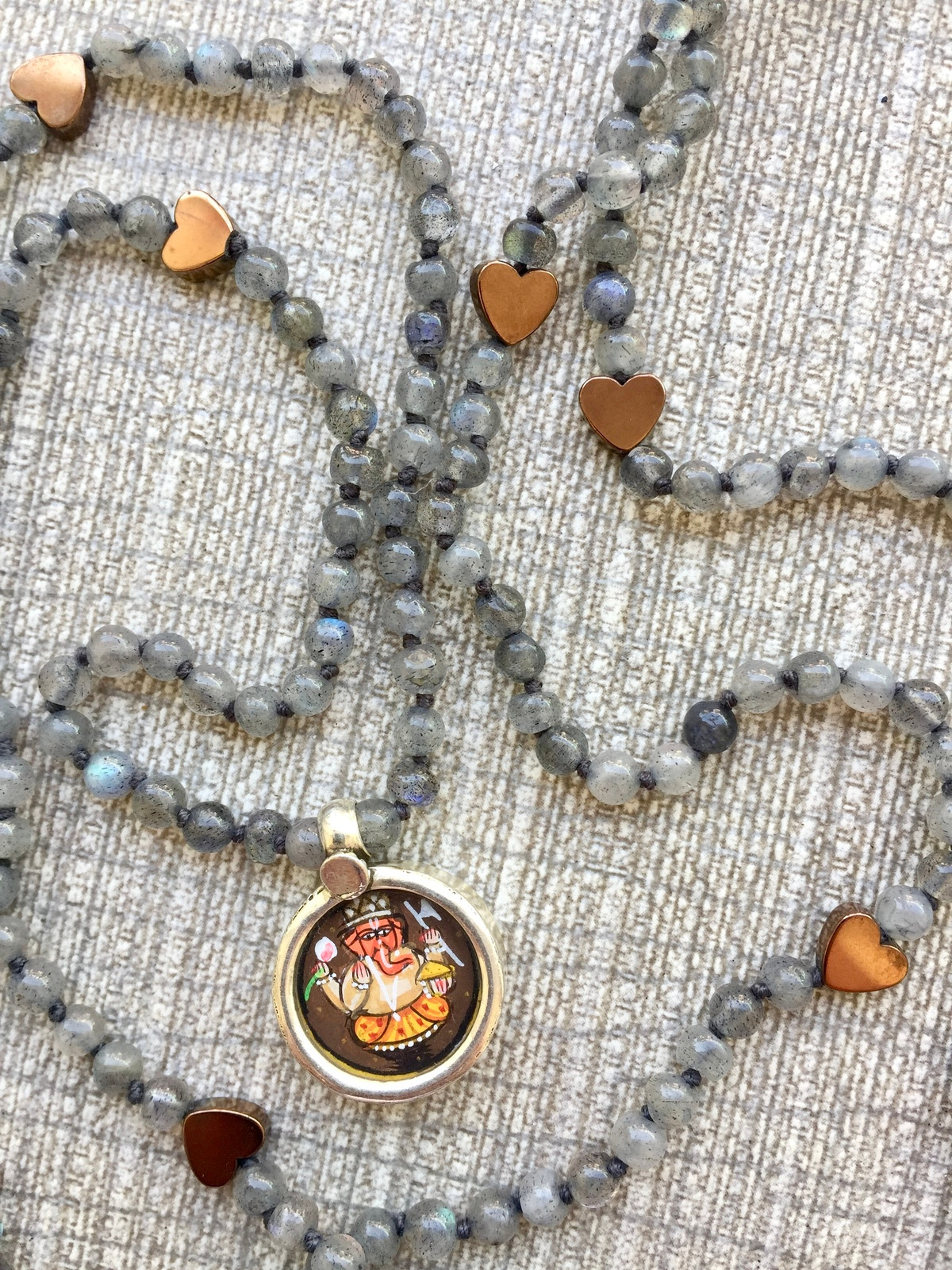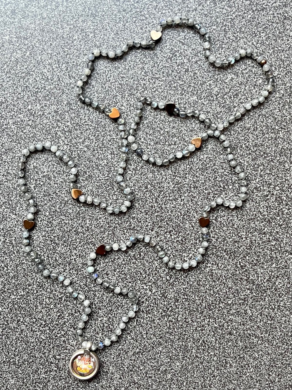 Handcrafted with tiny labradorite 2mm beads and hand-knotted with care, this necklace balances elegance with spiritual significance. Labradorite supports inner strength, intuition, and protective energy, harmonizing beautifully with a sacred talisman. Tiny bronze hematite hearts are scattered throughout, adding a subtle, luminous accent.