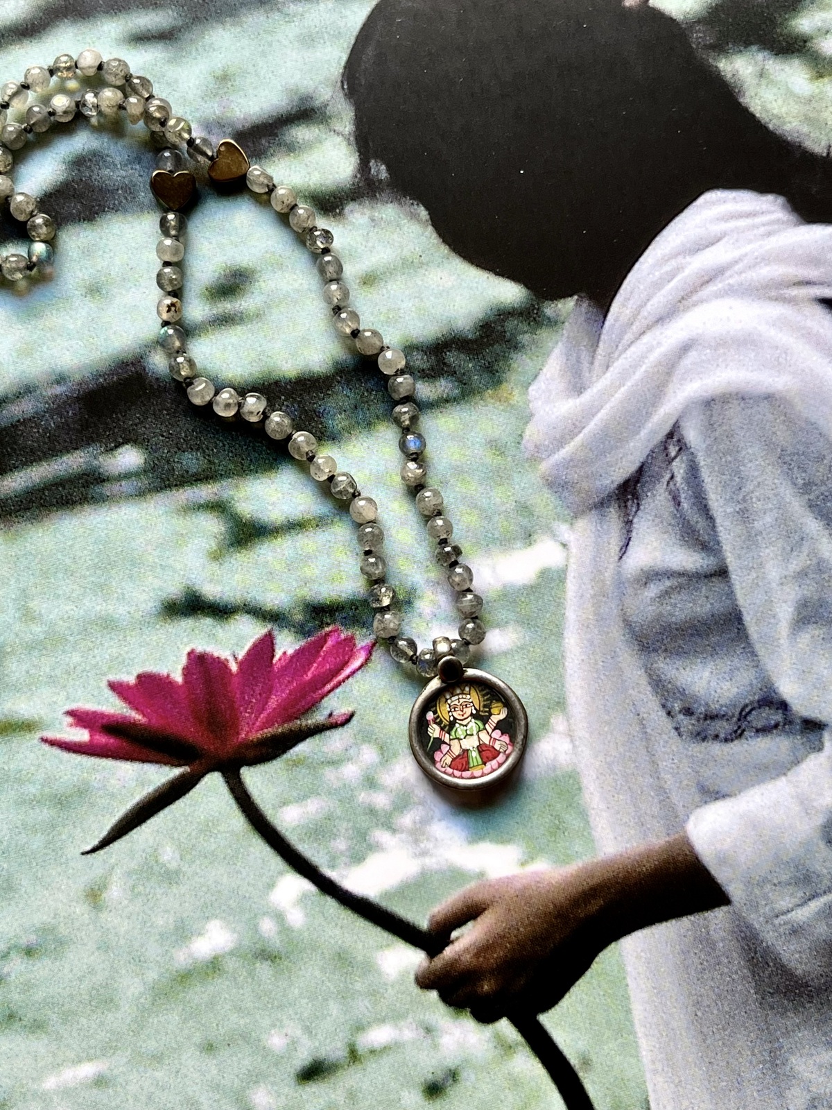 The centerpiece is a charming silver pendant, featuring a finely hand-painted miniature of Goddess Laxmi, created using traditional miniature painting techniques from Rajasthan. Protected beneath a glass dome, the miniature captures vibrant detail, color, and the divine aura of the goddess of abundance and prosperity.