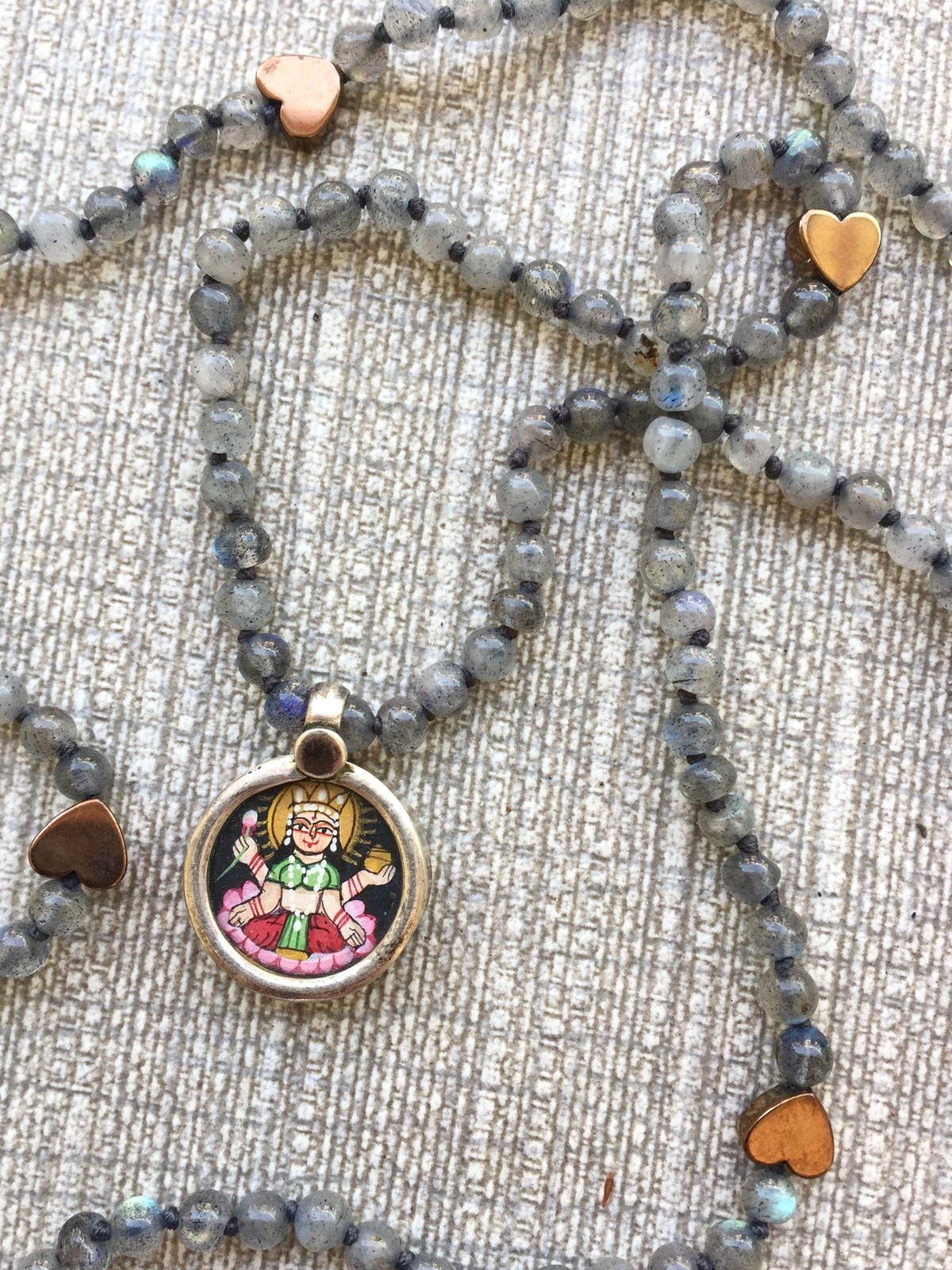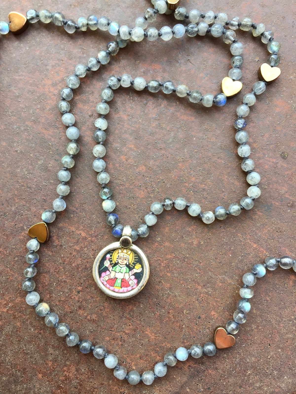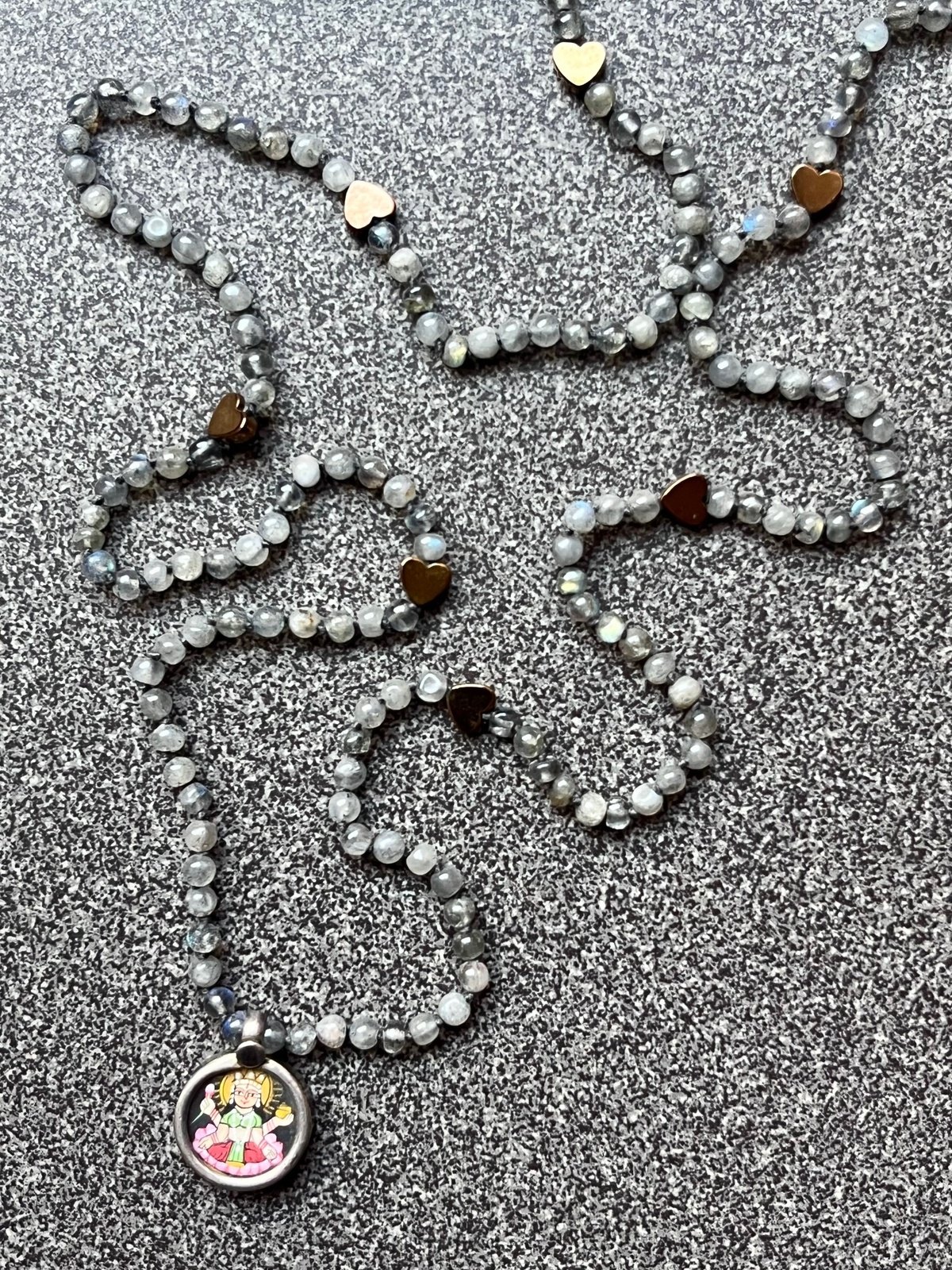 A delicate blend of spiritual devotion and artisanal craftsmanship, this necklace is handcrafted with tiny 2 mm labradorite beads, hand-knotted for a flowing, organic elegance. Labradorite is cherished for its protective and intuitive qualities, enhancing spiritual insight and calm energy. Interspersed among the beads are tiny bronze hematite hearts, adding a subtle, warm shimmer.