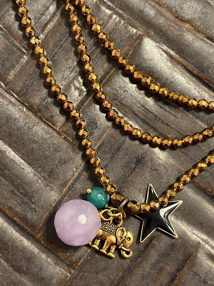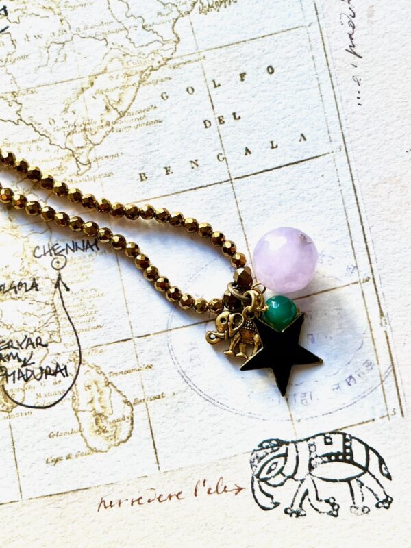 This pendant carries a lilac agate globe stone, a small green agate stone, a black enameled star, and a metal elephant charm.