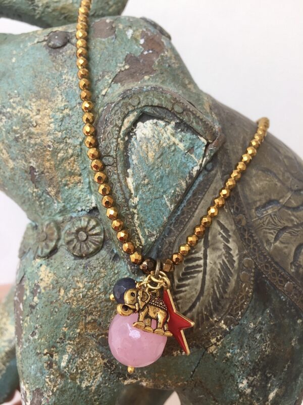 This pendant carries a rose quartz globe stone, a small dark blu agate stone, a red enameled star, and a metal elephant charm.