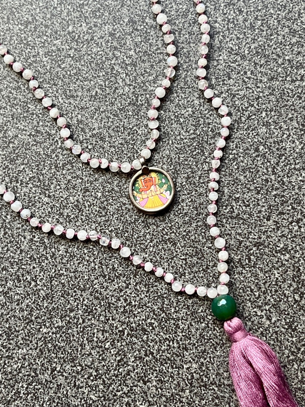 A perfect union of style and devotion, this double mala necklace is handcrafted with 2mm tiny, luminous moonstone beads on a soft pink hand-knotted thread, forming a double loop that drapes elegantly around the neck. A flowing tassel adds gentle movement, creating a chic layered look.