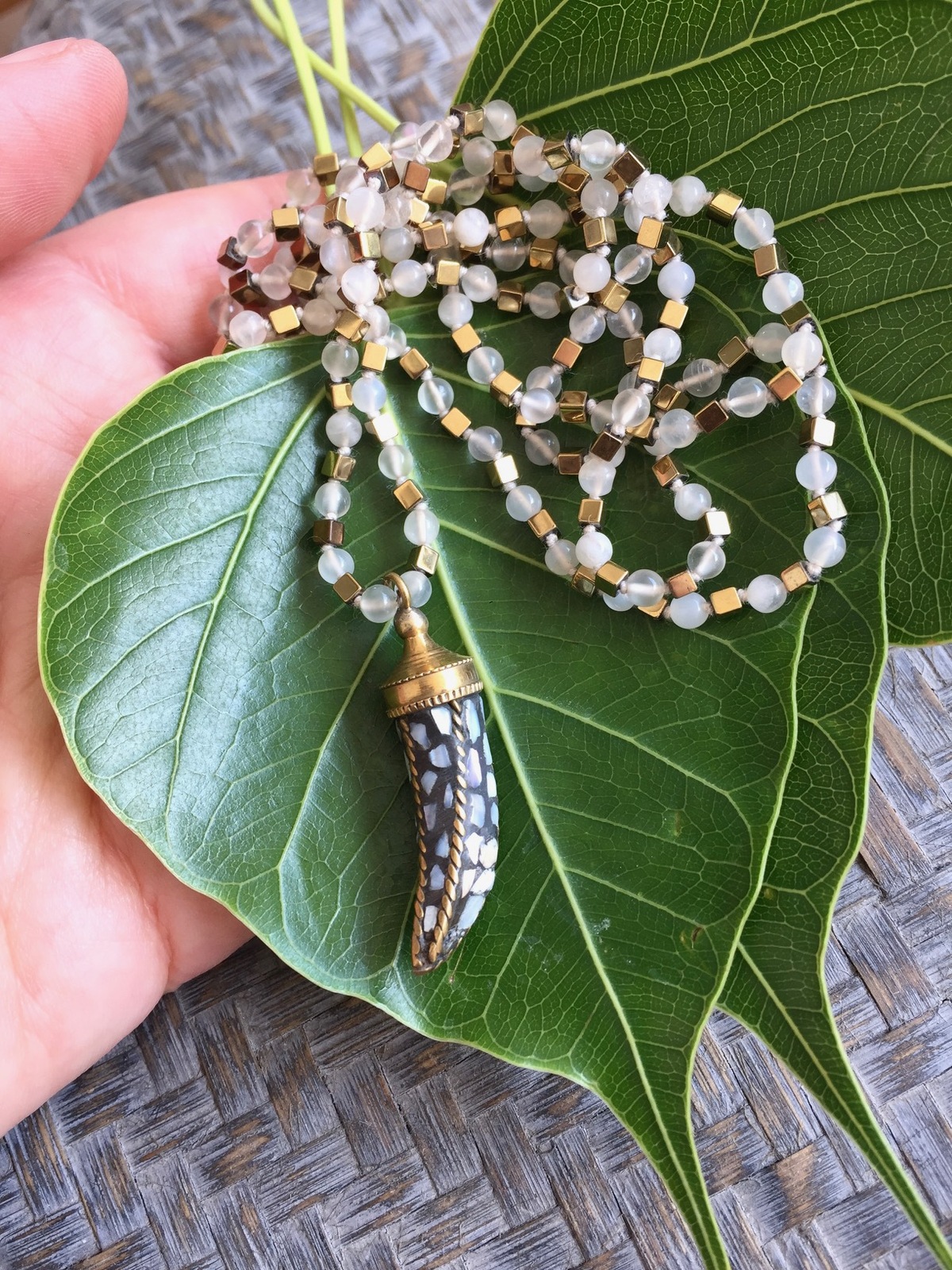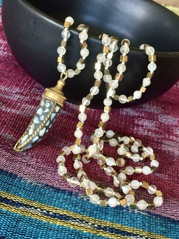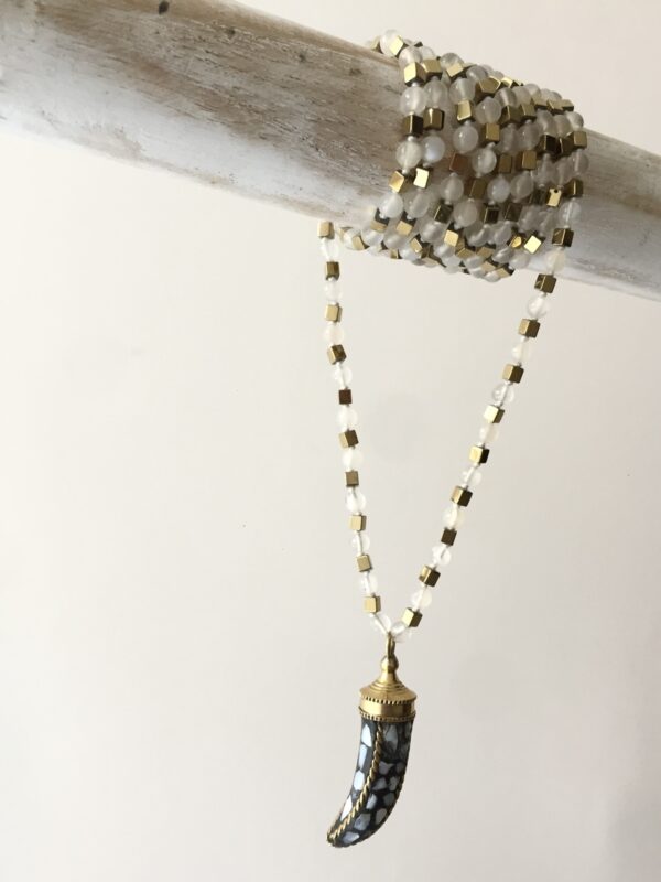 Delicately hand-knotted, this necklace features tiny round moonstone beads alternated with golden hematite, creating a subtle shimmer along the strand. At its center hangs a sleek, smaller horn-shaped pendant, inlaid with natural shell for a gentle touch of sacred elegance.